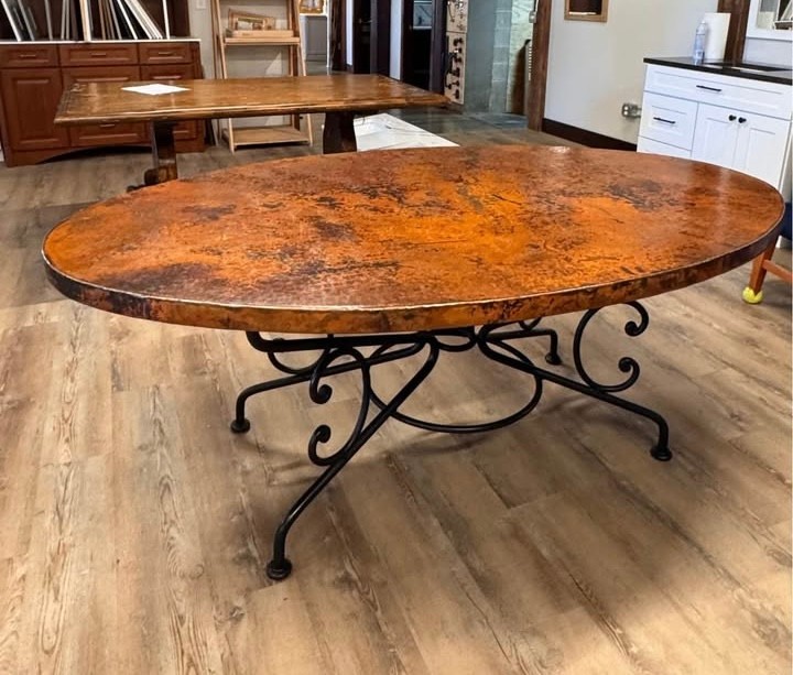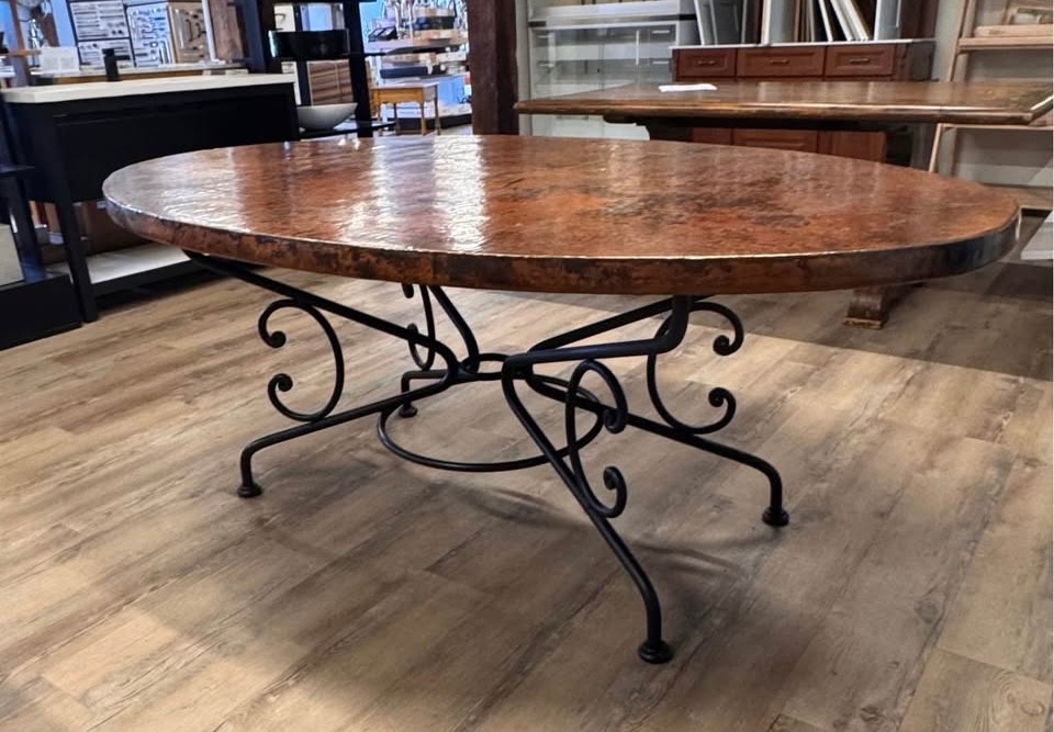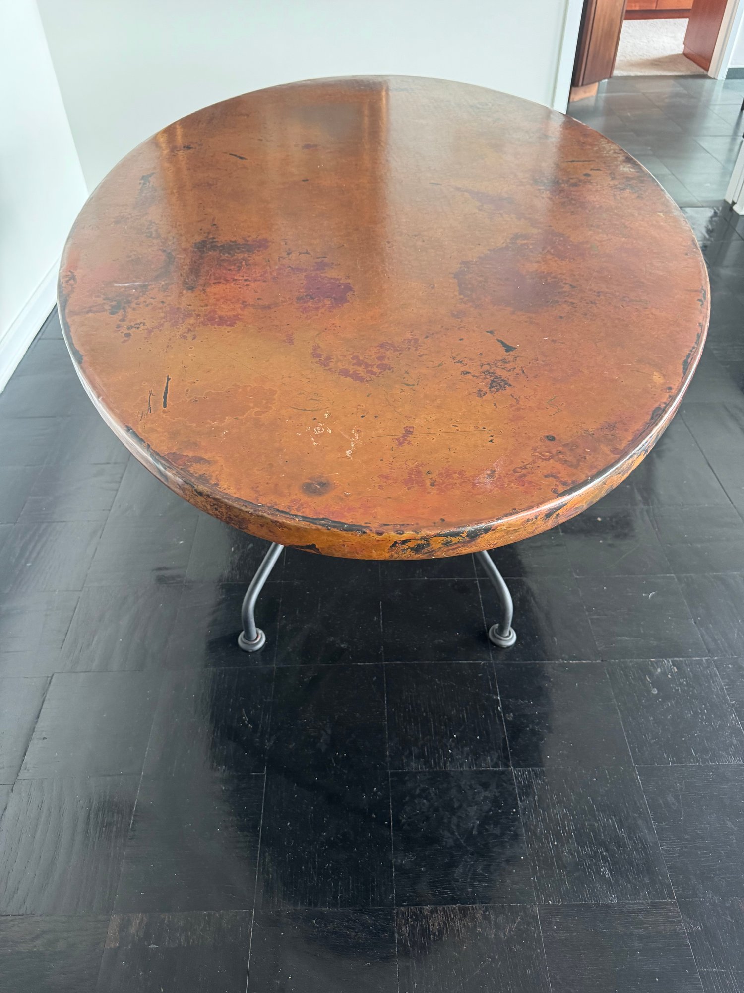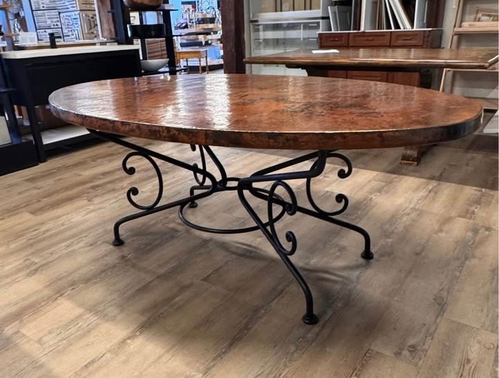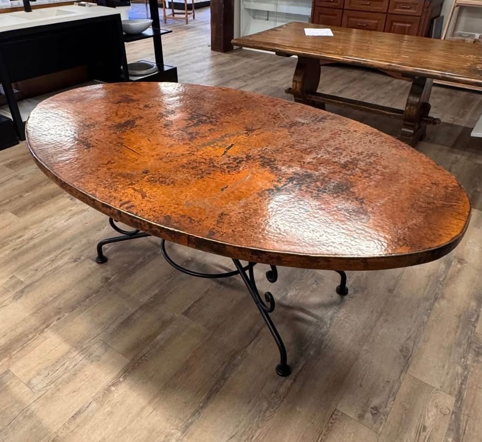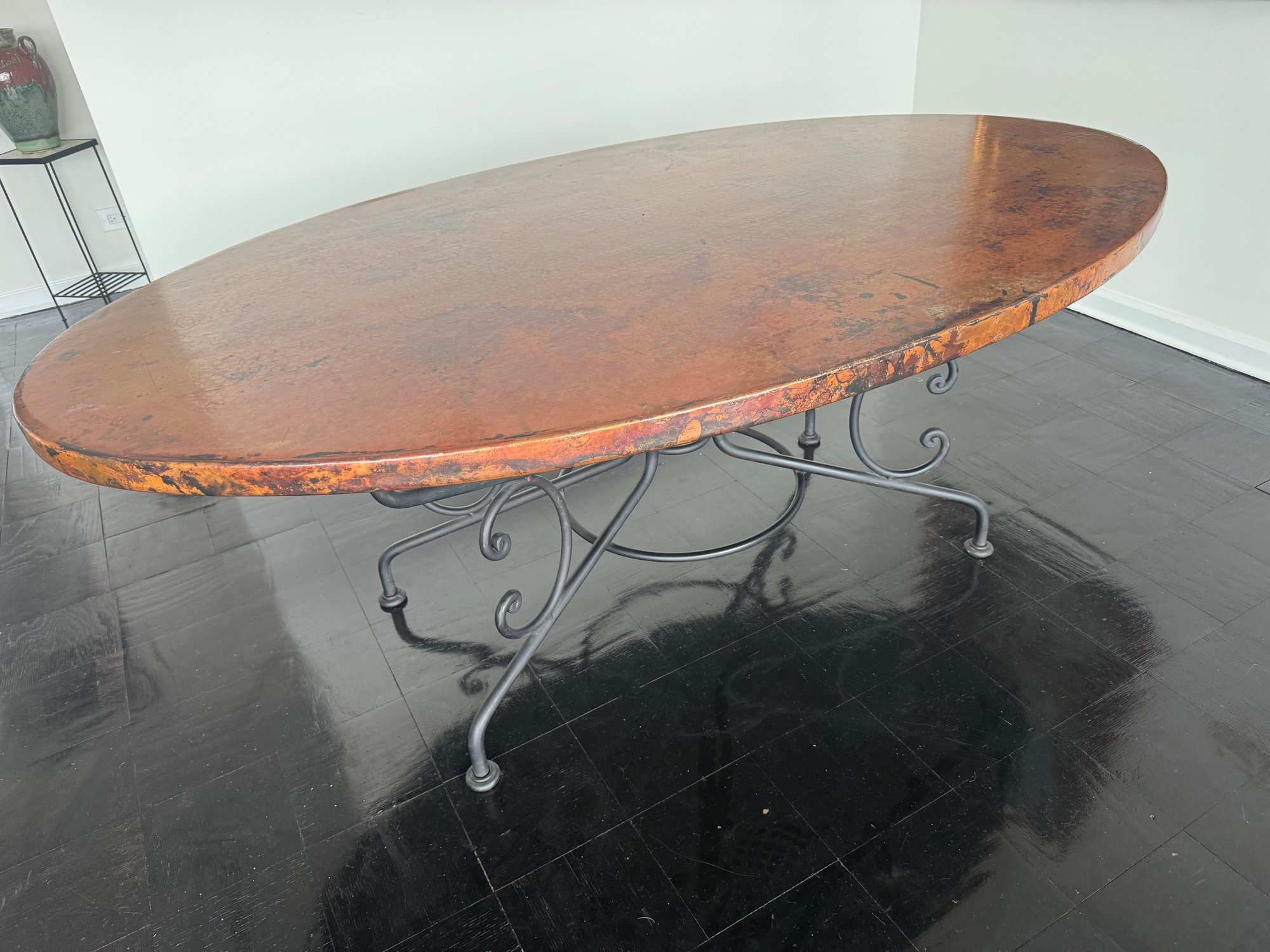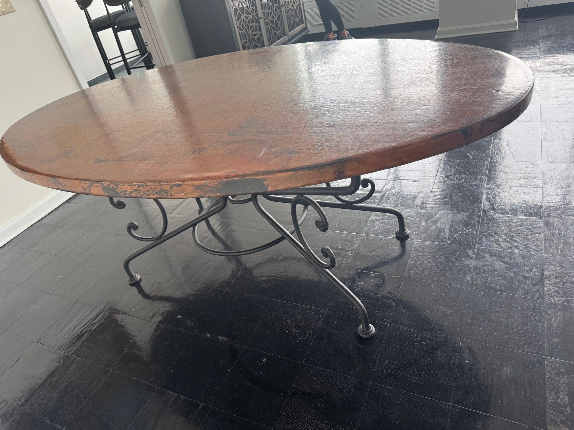 Arhaus Recycled Copper Dining Table. Measures 77 x 44. This oval dining table is a beautiful collection to any room.