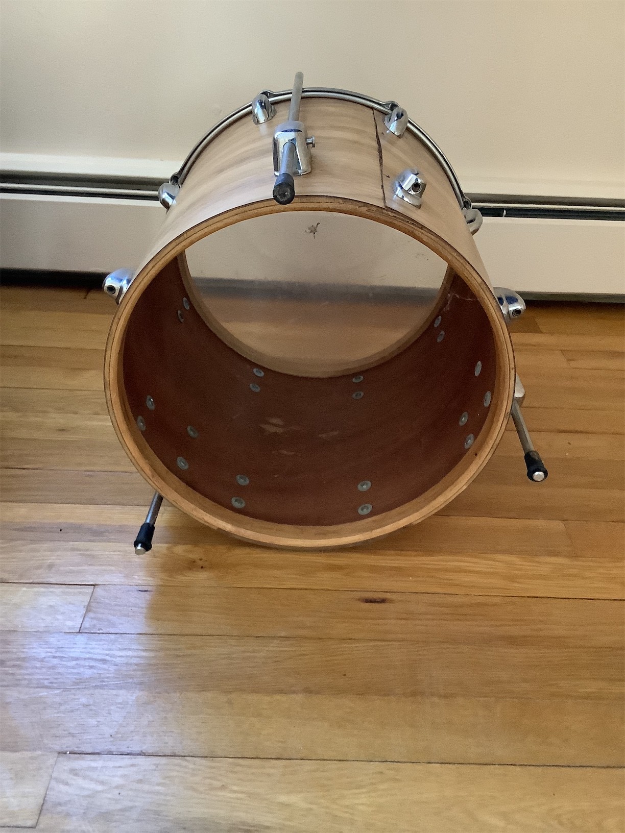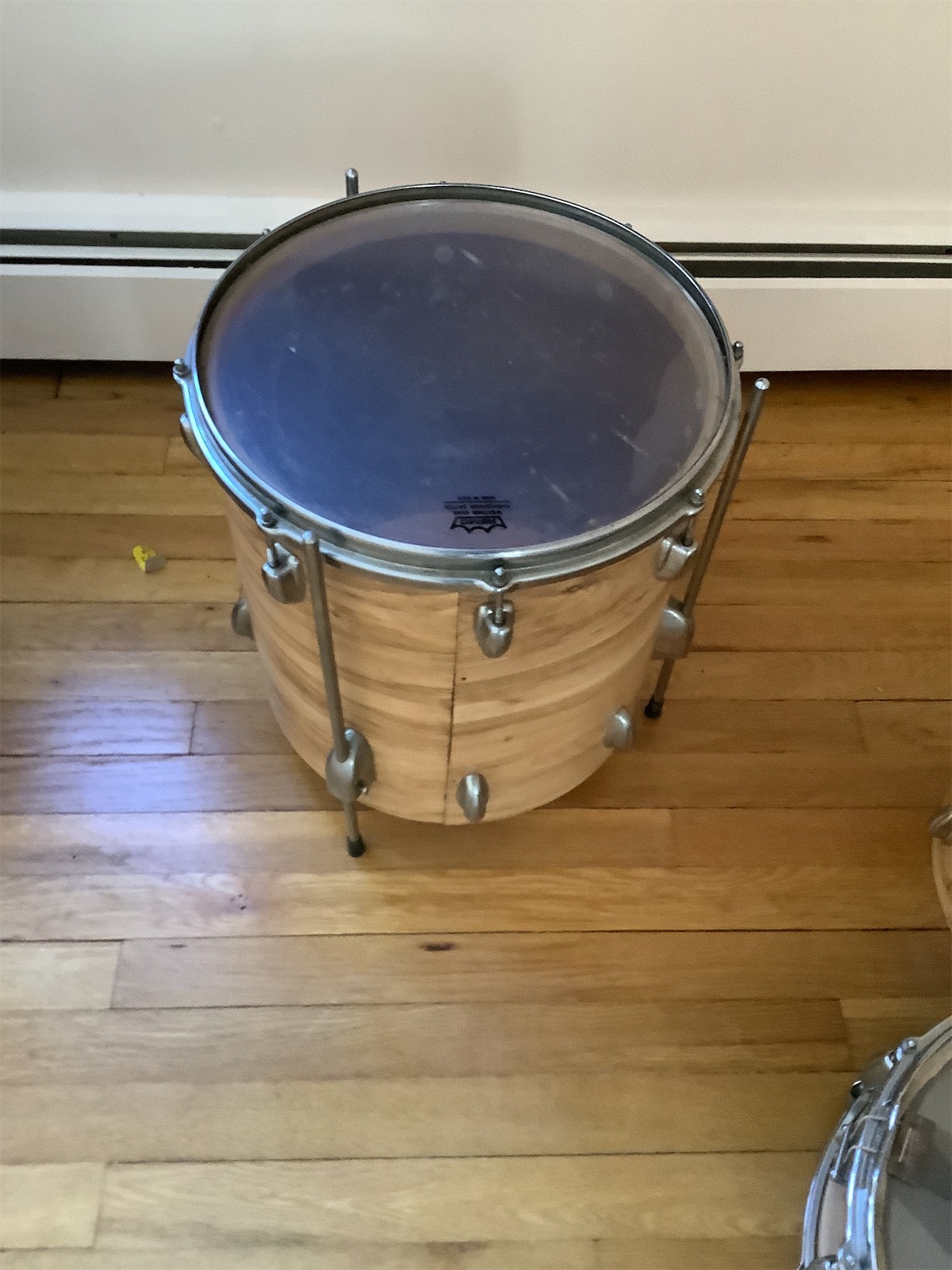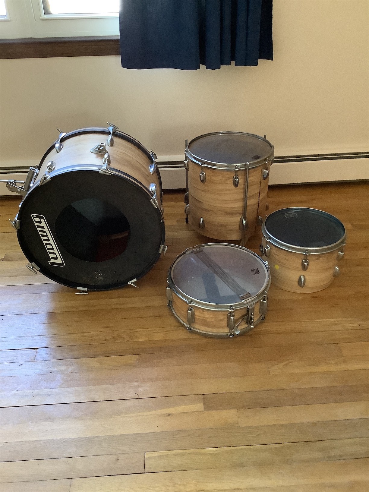 This listing features a set of drums, perfect for both aspiring drummers and seasoned musicians. The collection includes a bass drum and several smaller drums, each showcasing a classic wood finish that adds warmth to any setup. The bass drum is equipped with a durable head, offering a rich sound quality. The smaller drums feature transparent heads, providing a sleek aesthetic while allowing resonance to shine through. All drums are designed with standard hardware, making them easy to integrate into any drum kit. Whether you're looking to expand your current setup or starting fresh, this versatile set offers great potential for performance and practice.