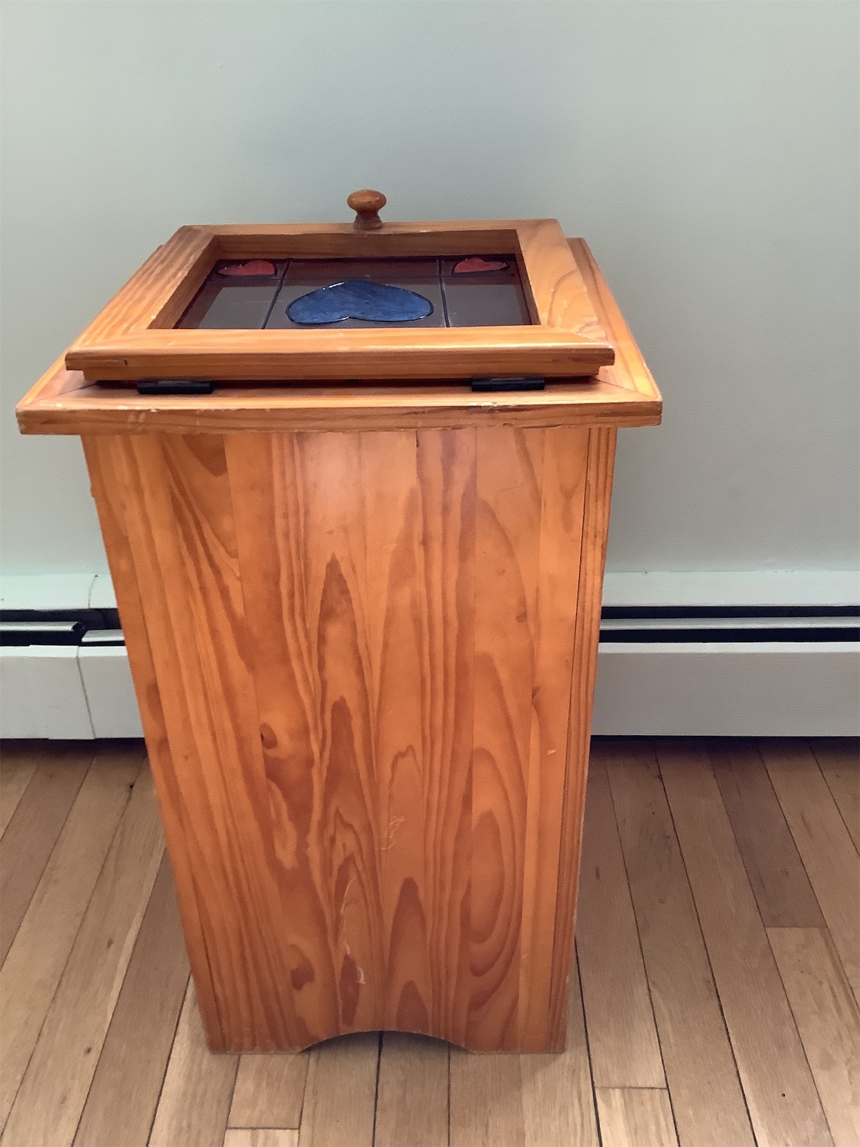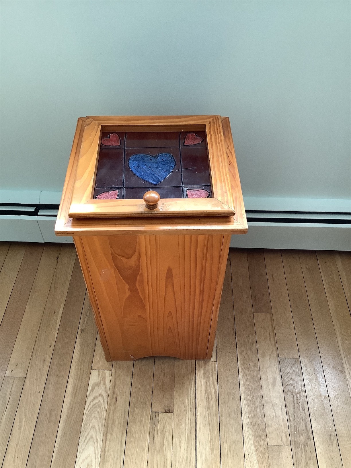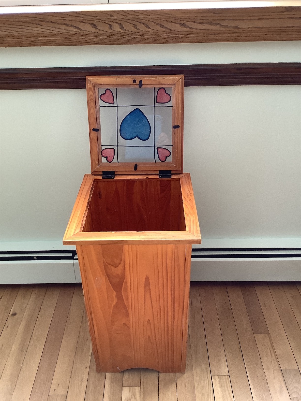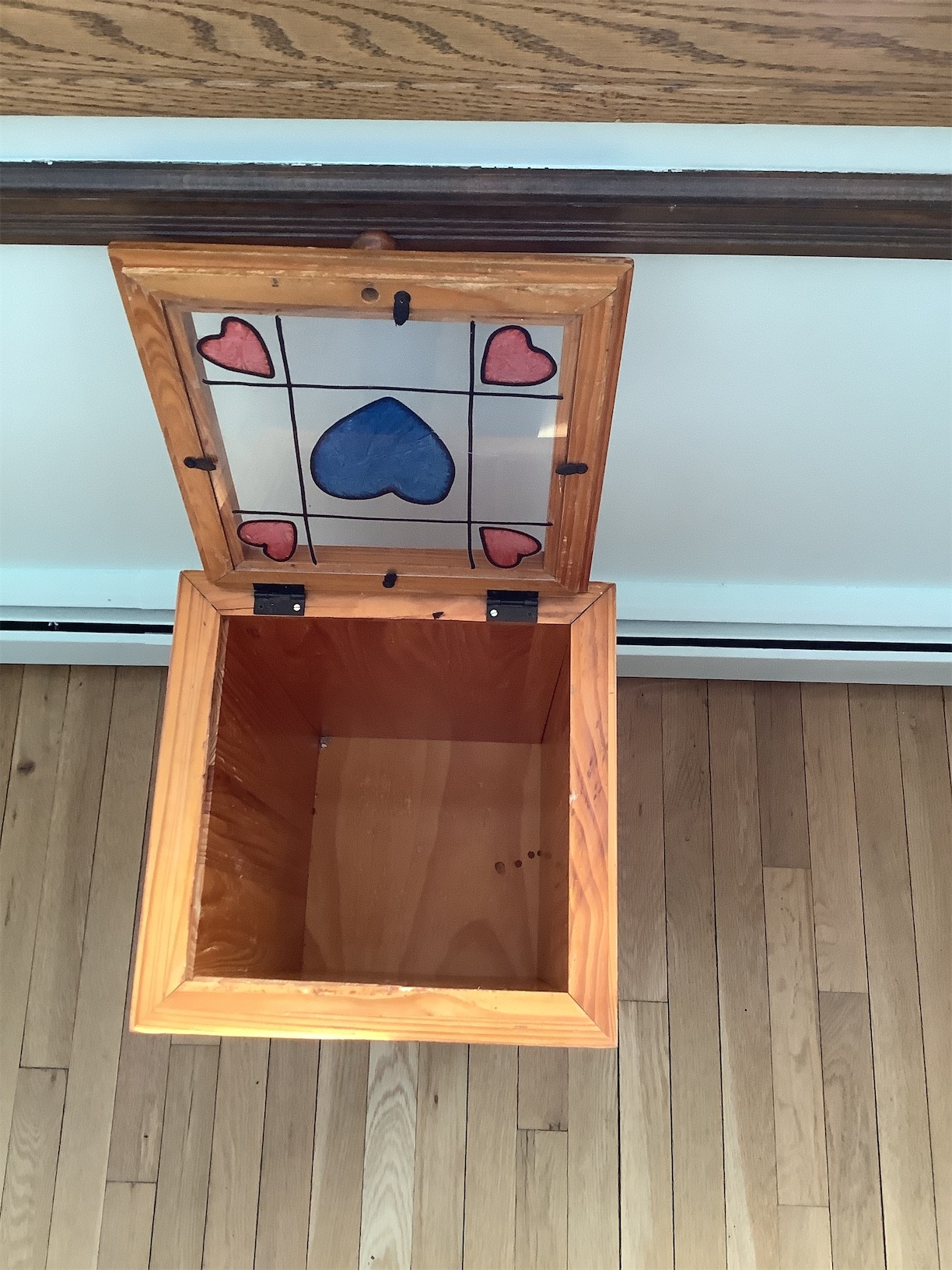 This handmade hamper features a charming design with a vibrant, hand-painted glass top showcasing a blue heart surrounded by smaller hearts. Crafted from sturdy wood, it offers both functionality and decorative appeal, making it a versatile addition to any space. The hinged lid allows for easy access, while the practical shape ensures it fits well in various settings. Ideal for storing laundry, toys, or other household items, this unique piece adds character to your home decor. The natural wood finish enhances its aesthetic, providing a warm and inviting touch to any room. 13sqX24