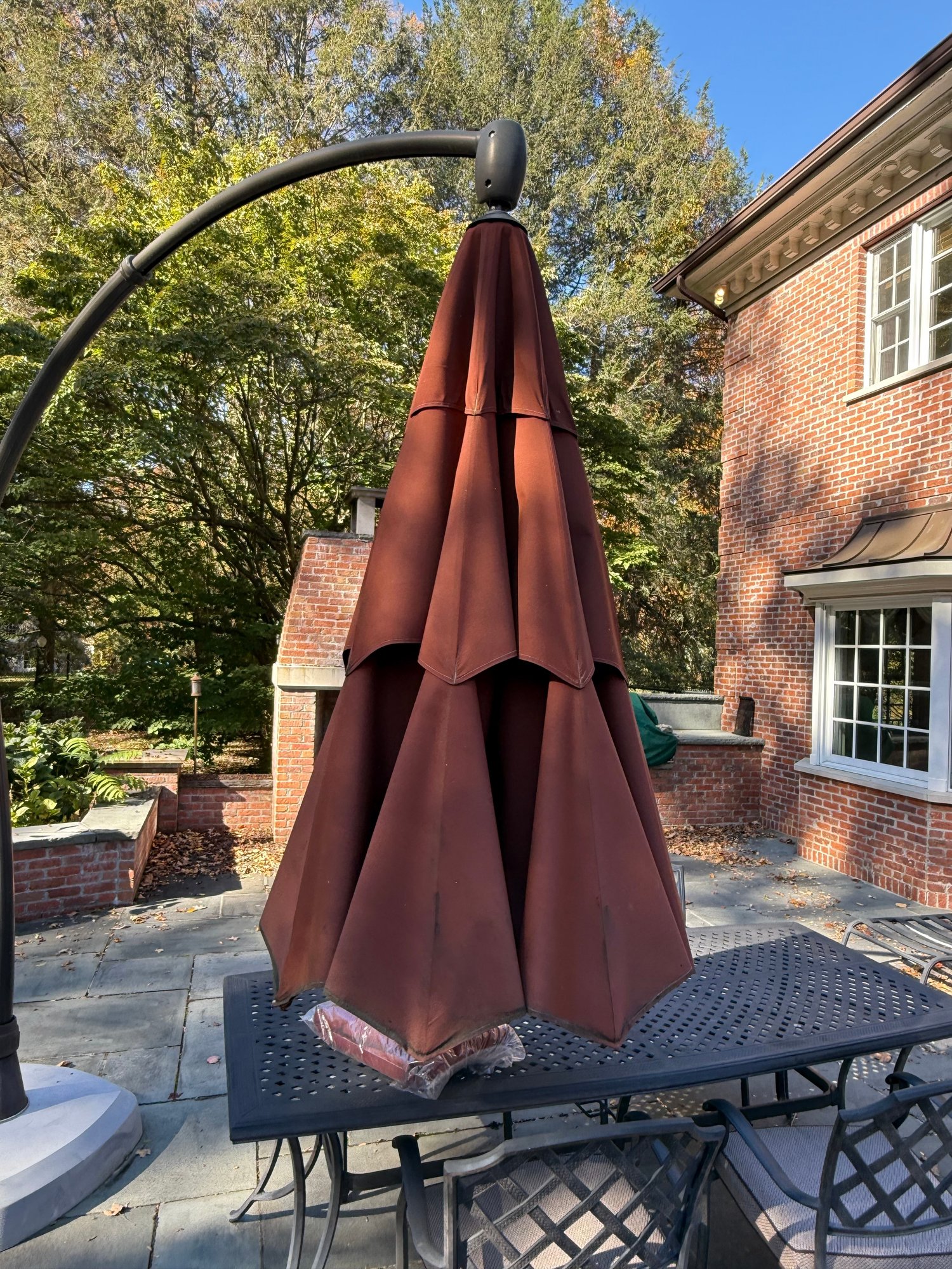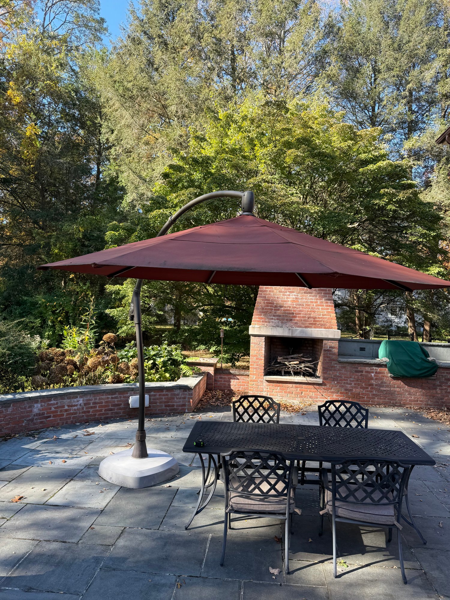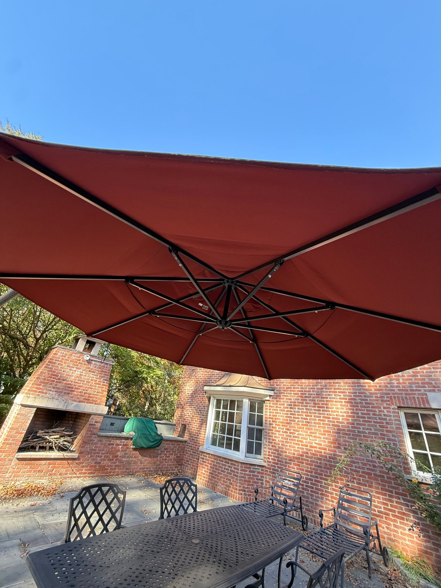comes with stand, hexagon shape, comes with new red umbrella in bag