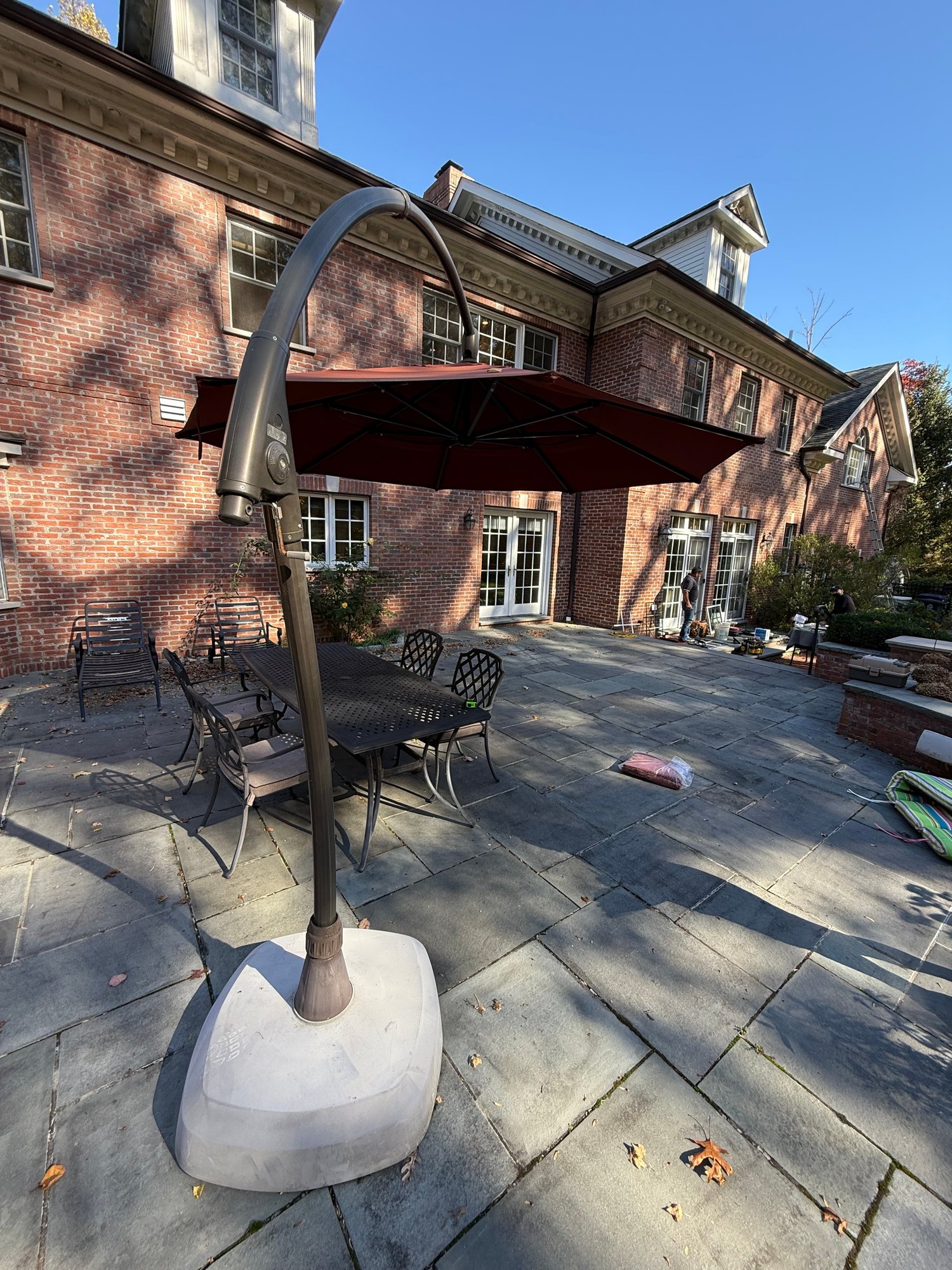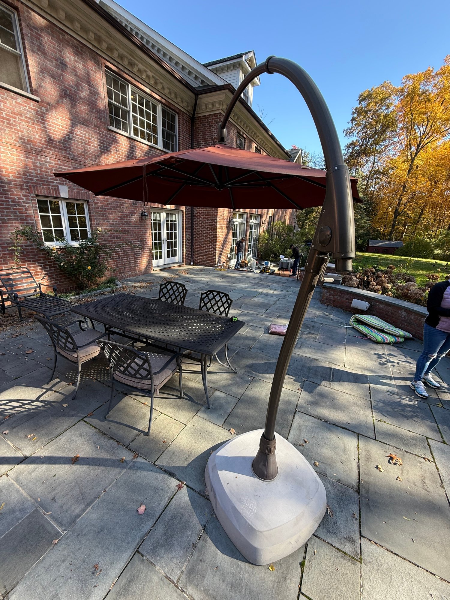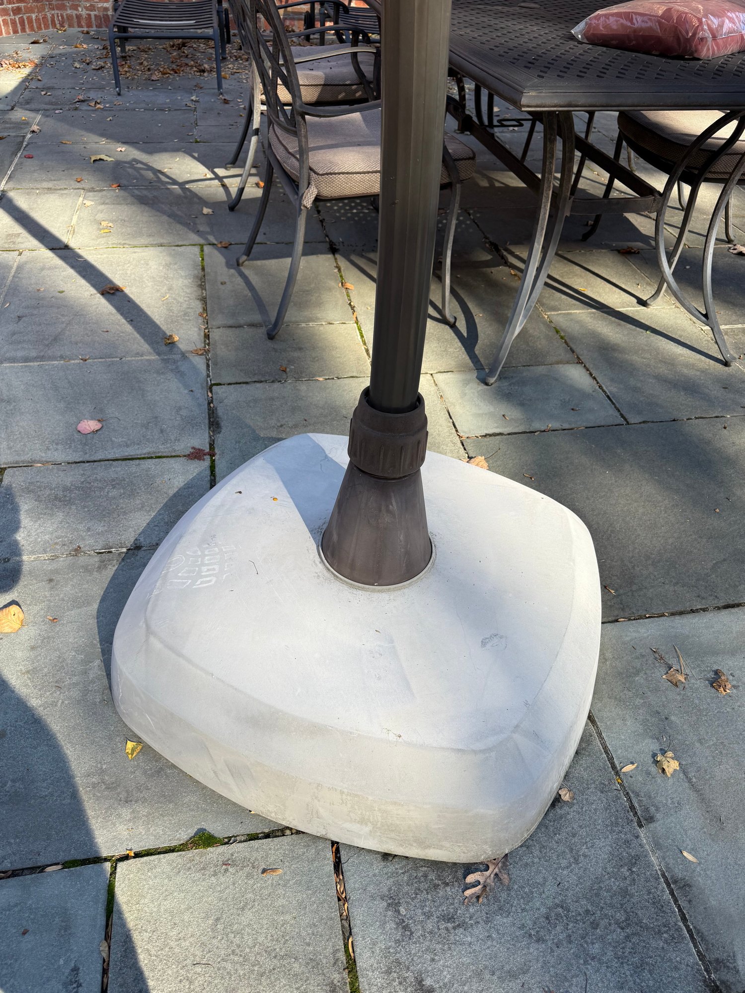 comes with stand, hexagon shape, comes with new red umbrella in bag
