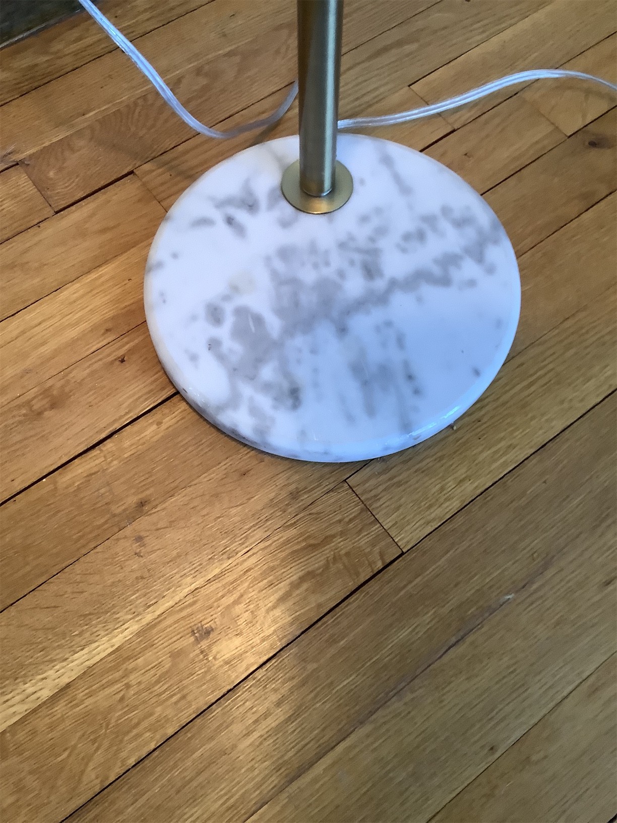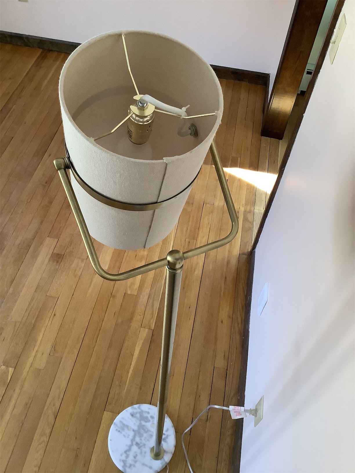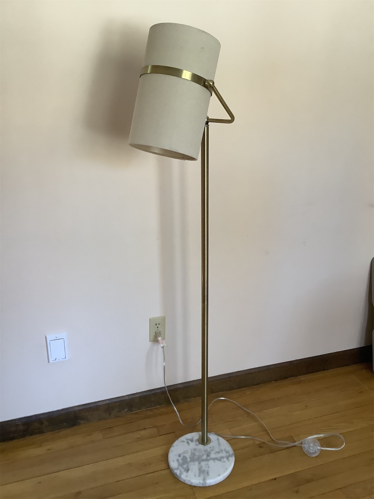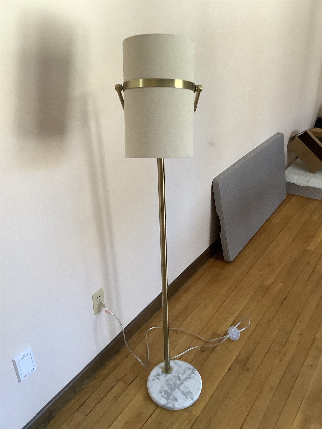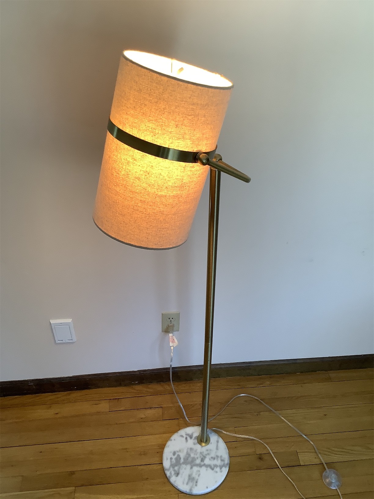 This modern floor lamp features a sleek design that blends elegance with functionality. It boasts a stylish cream fabric shade, held securely by a polished gold-tone metal arm for a sophisticated touch. The lamp is anchored by a sturdy circular base made of white marble, enhancing its contemporary appeal. The shade provides diffused lighting, making it perfect for creating a warm atmosphere in any room. Ideal for living rooms, bedrooms, or offices, this floor lamp is both a practical light source and a stylish accent piece. 57 H.