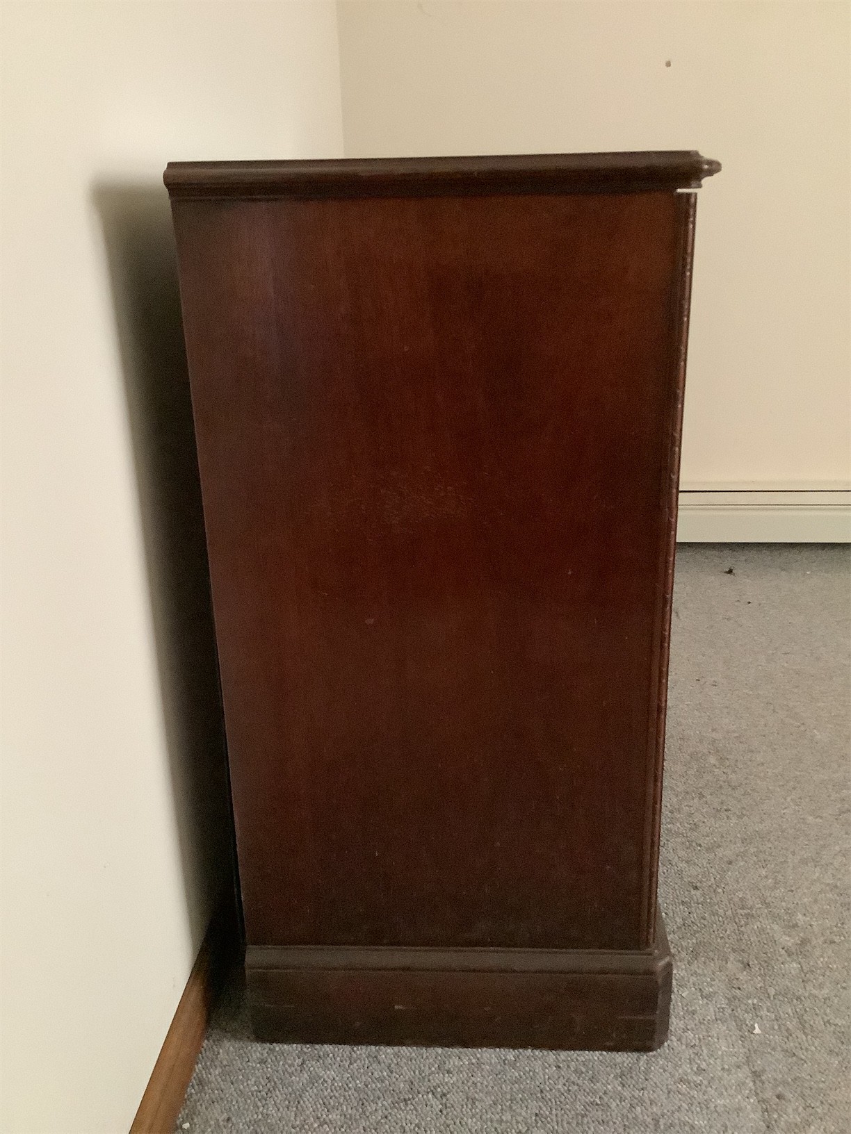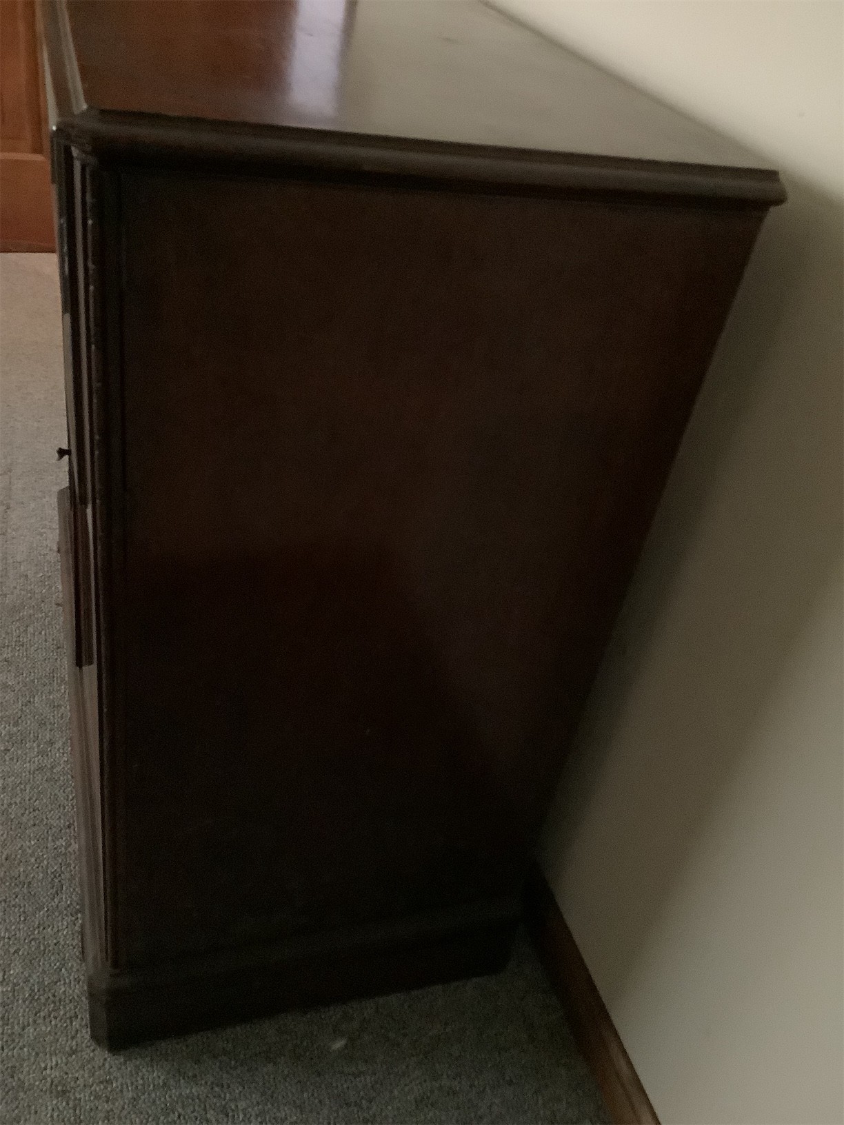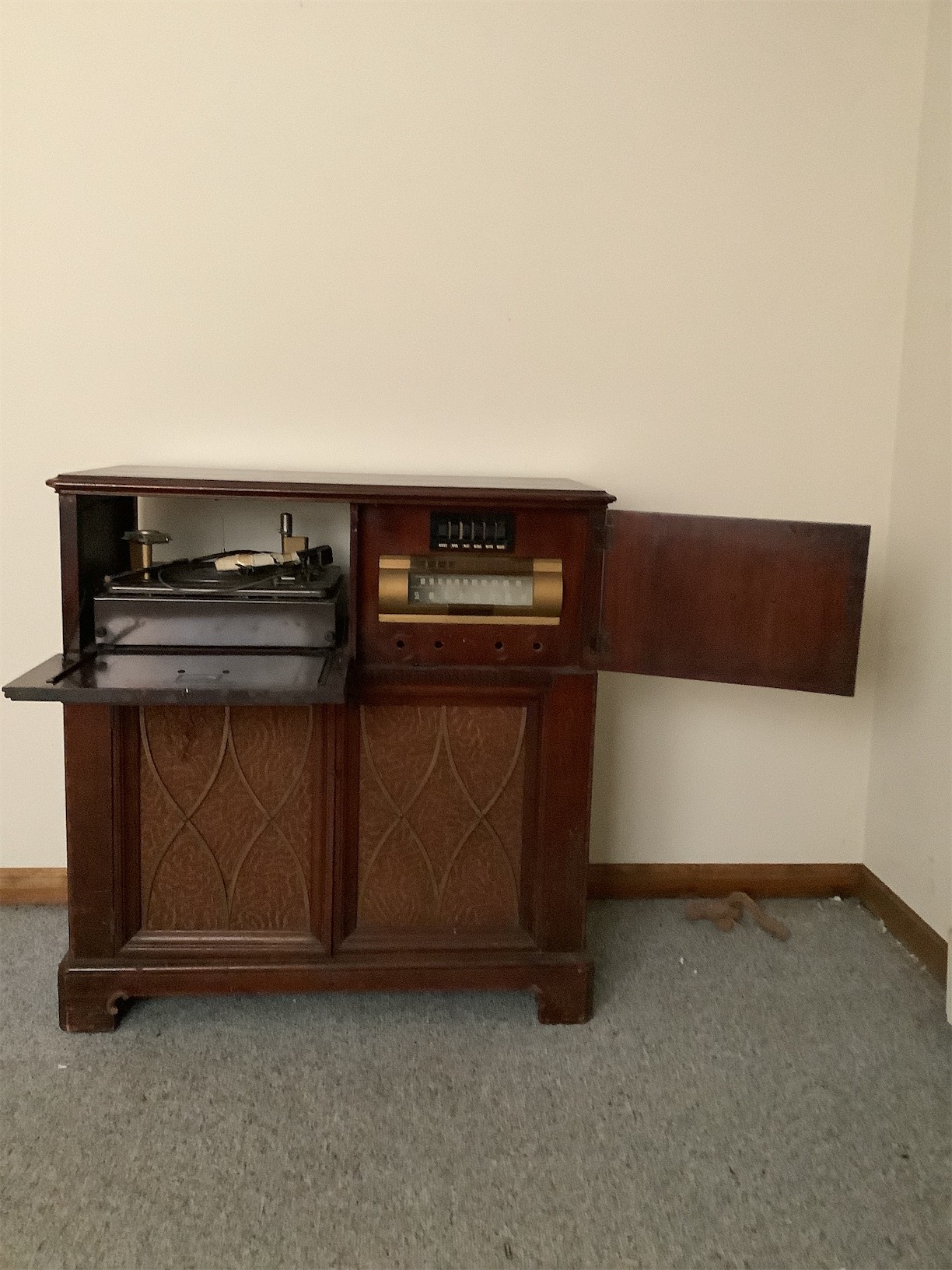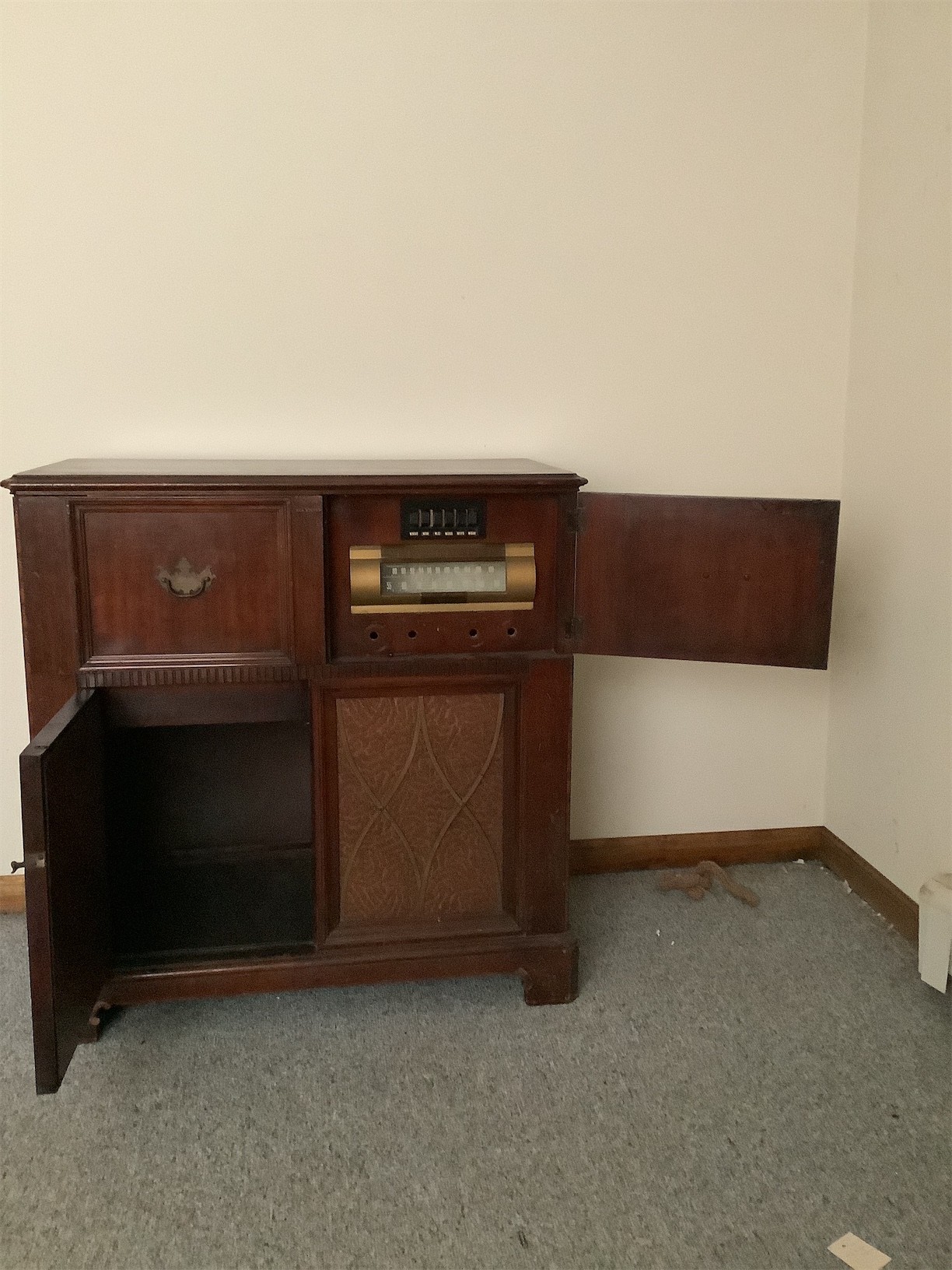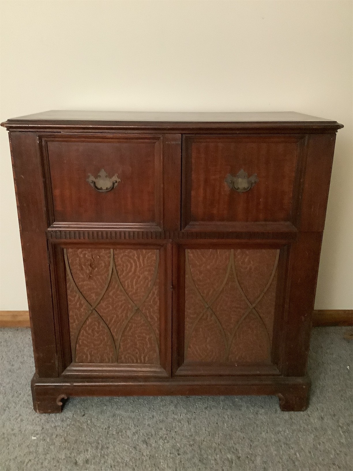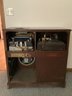 This classic RCA Victor/Victrola stereo cabinet showcases vintage charm with its elegant wood finish and intricate detailing. The front features two drawers complemented by decorative panels, adding a touch of sophistication to any room. Open the left side to reveal a vintage record player, perfect for enjoying your favorite vinyl. The right side houses a radio with a classic dial, embodying the nostalgia of past decades. The overall structure is sturdy, and the cabinet design provides ample storage for records, accessories, or other items. A striking piece for collectors and enthusiasts alike, this stereo cabinet is a wonderful blend of functionality and timeless design. 35 X 18 X 36