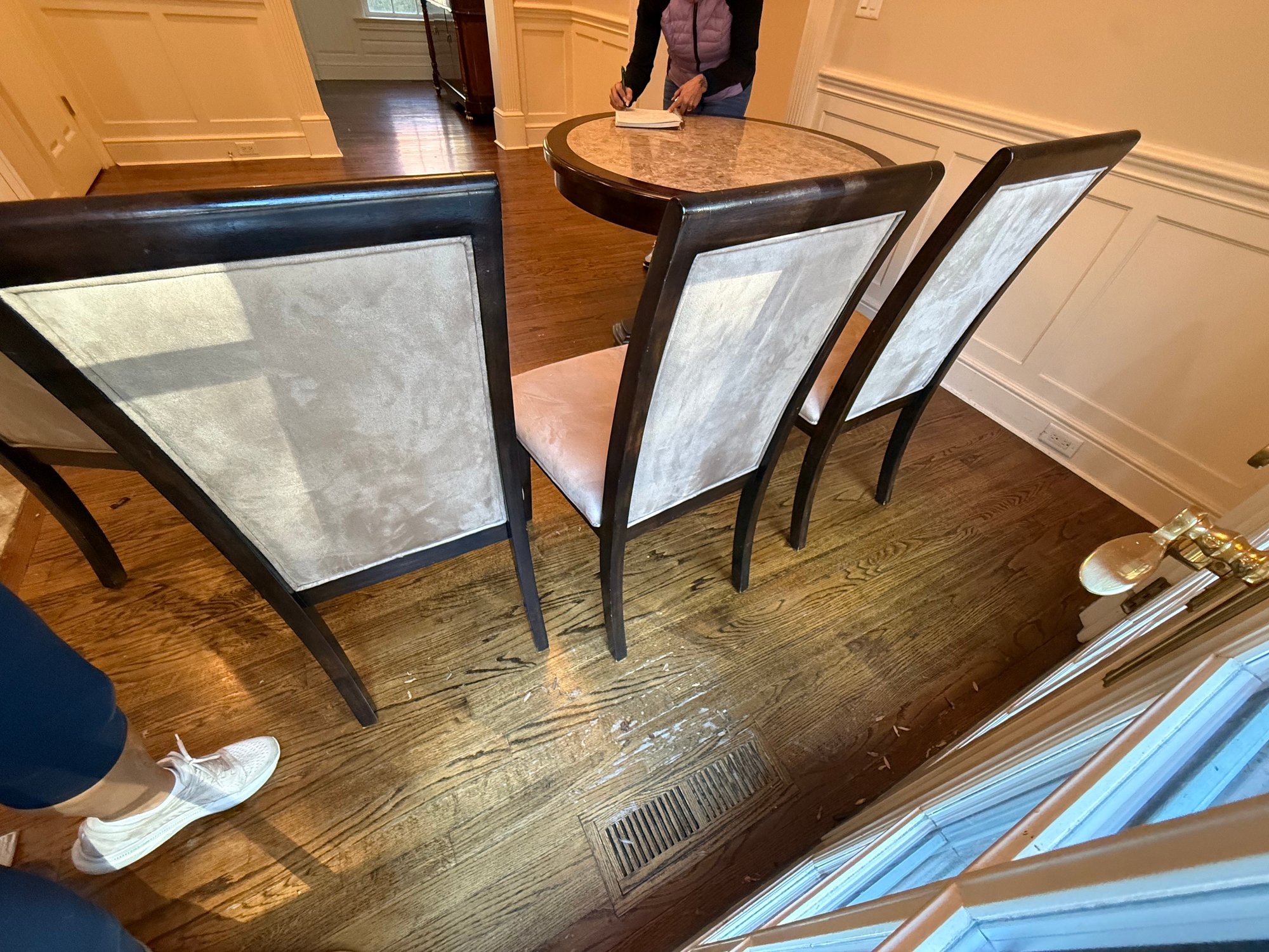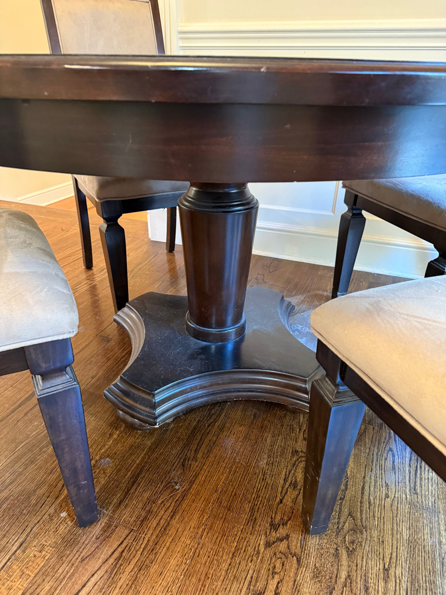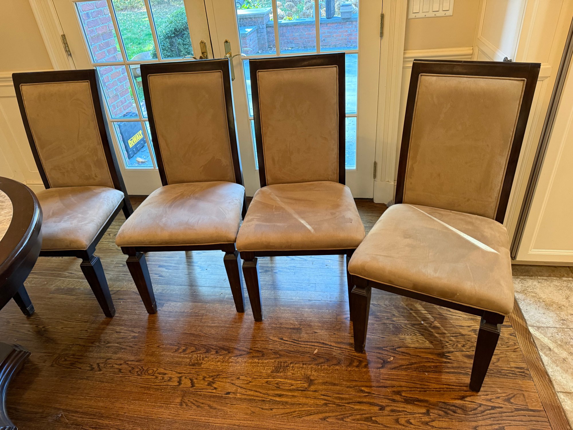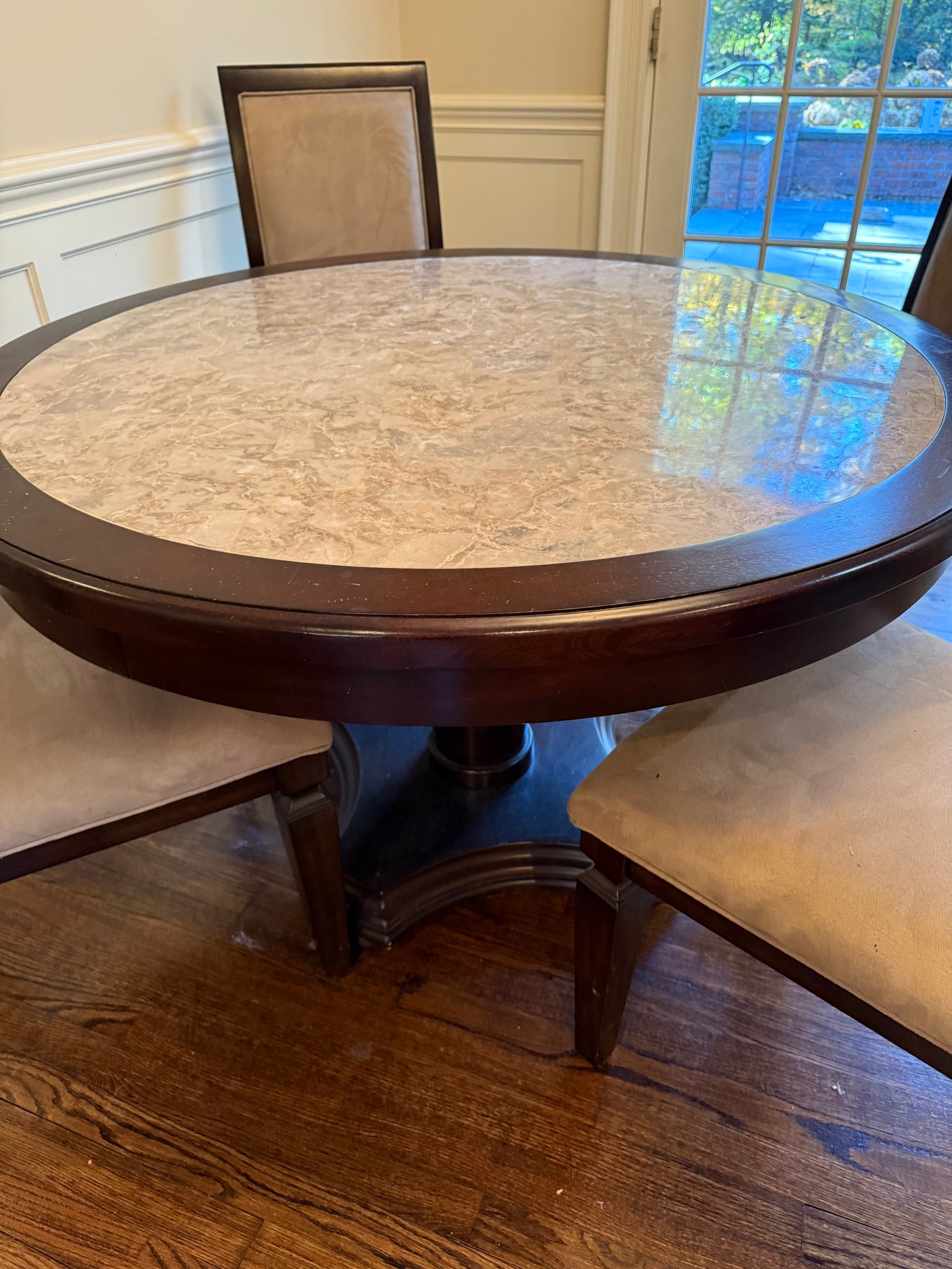 Round marble Insert table with 4 chairs w/ brown suede (one of the chairs has a small stain)