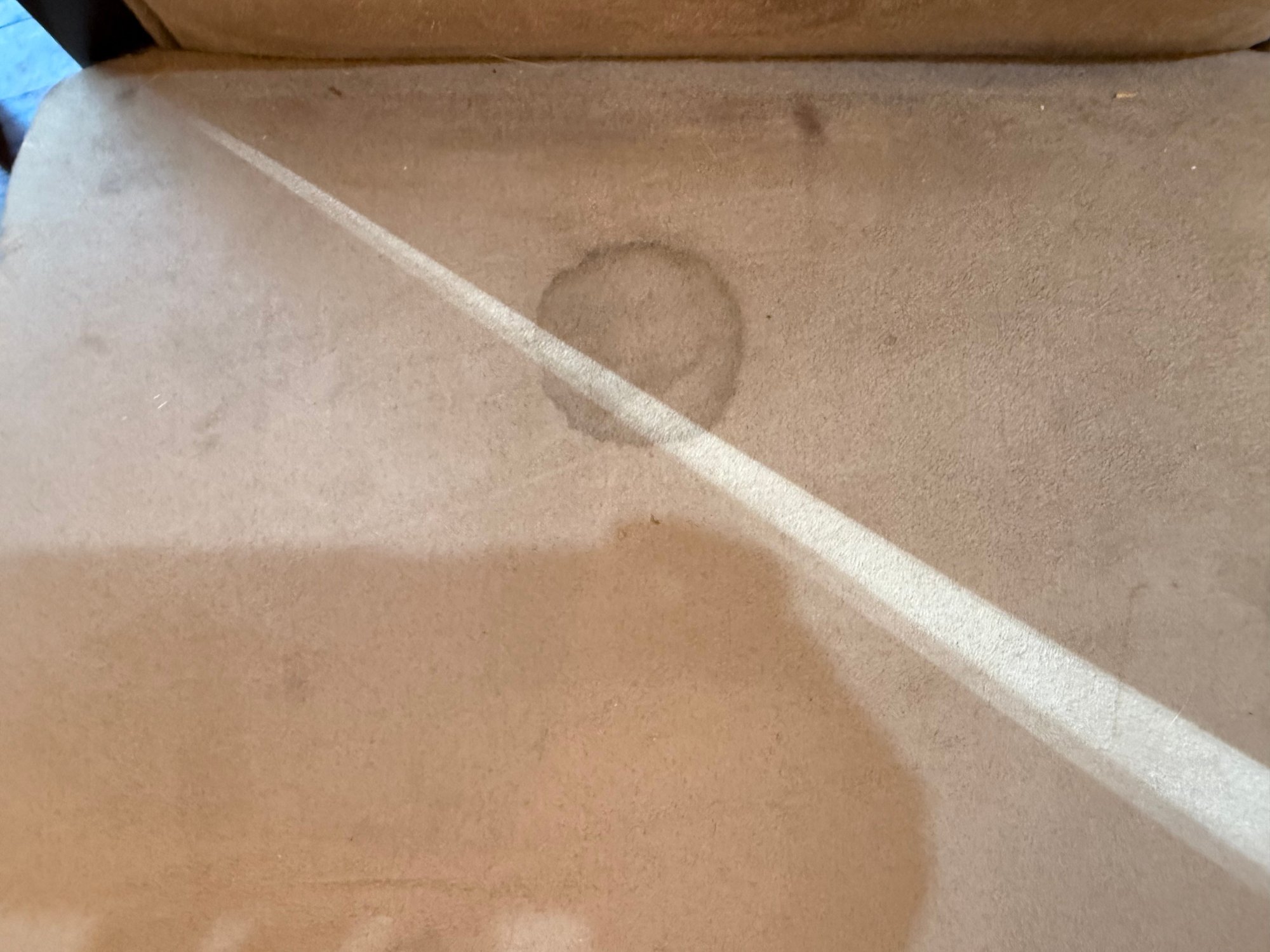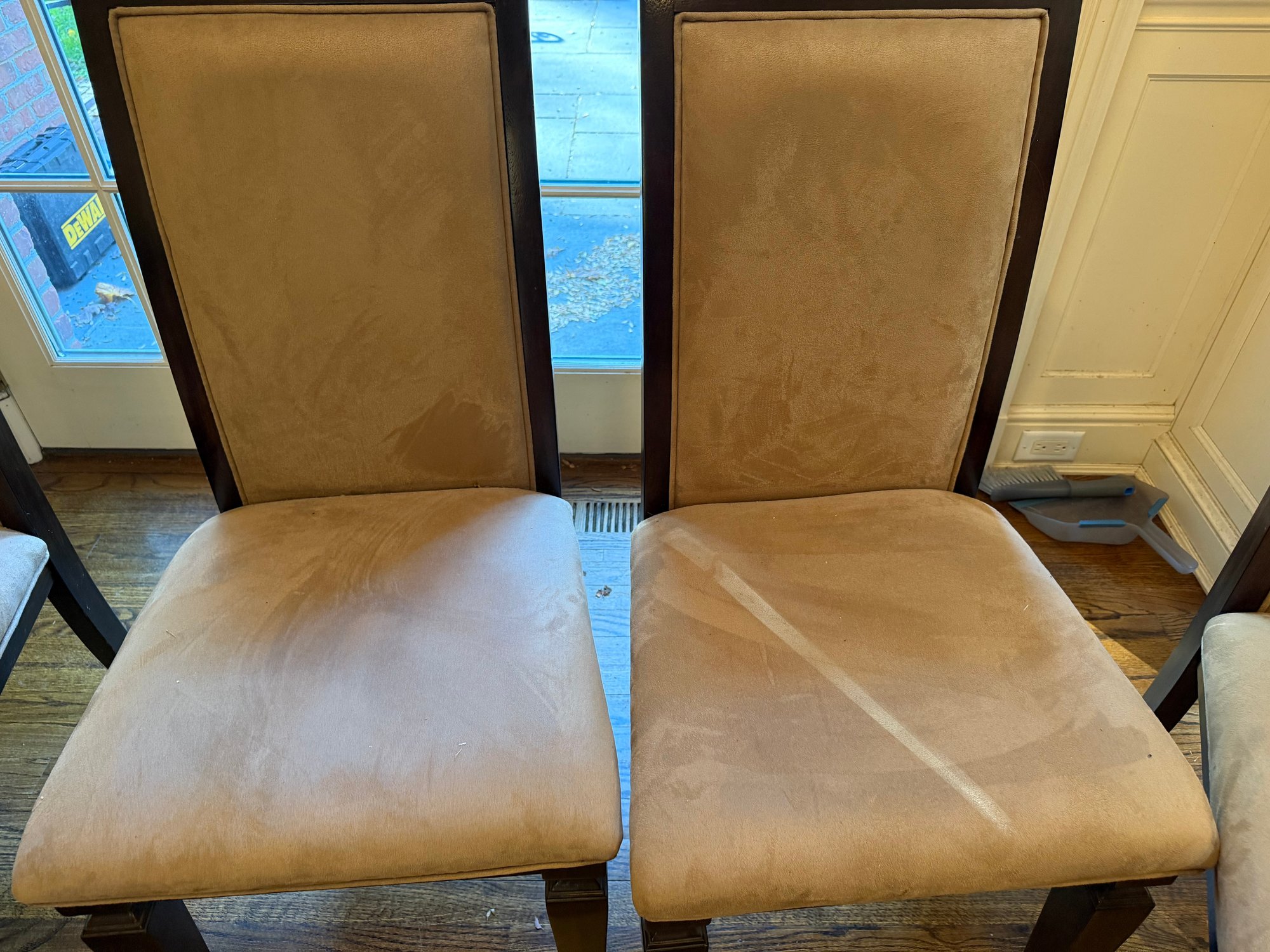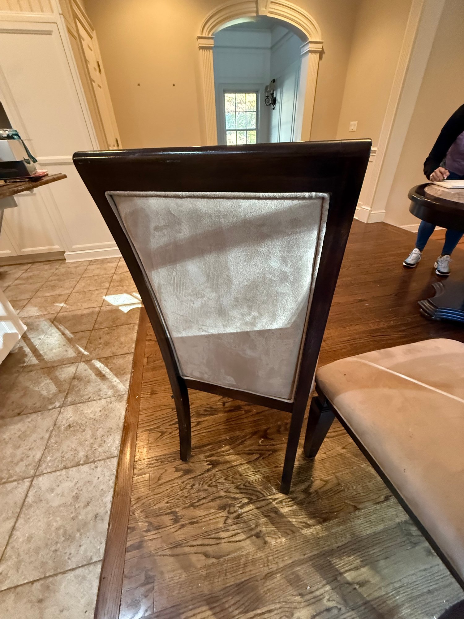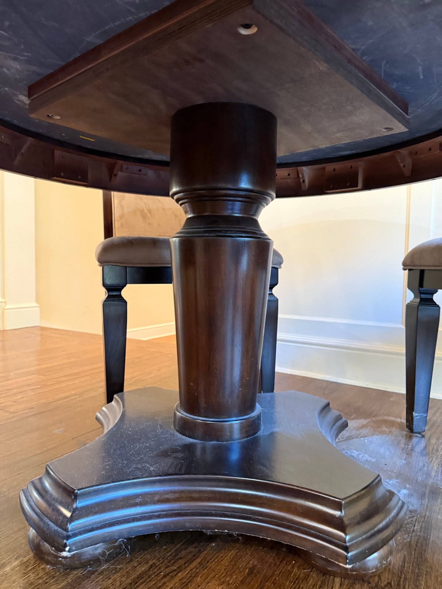 Round marble Insert table with 4 chairs w/ brown suede (one of the chairs has a small stain)