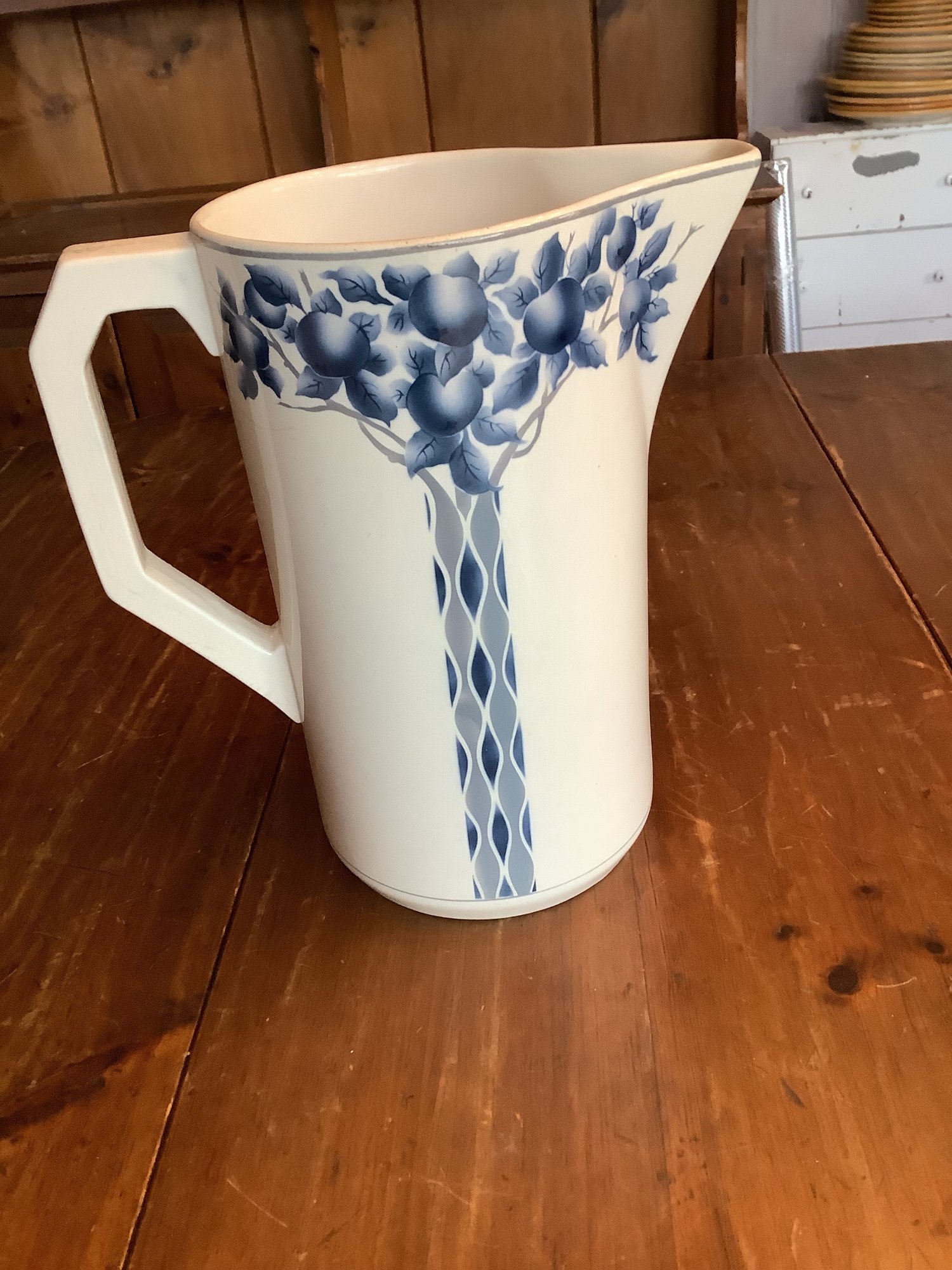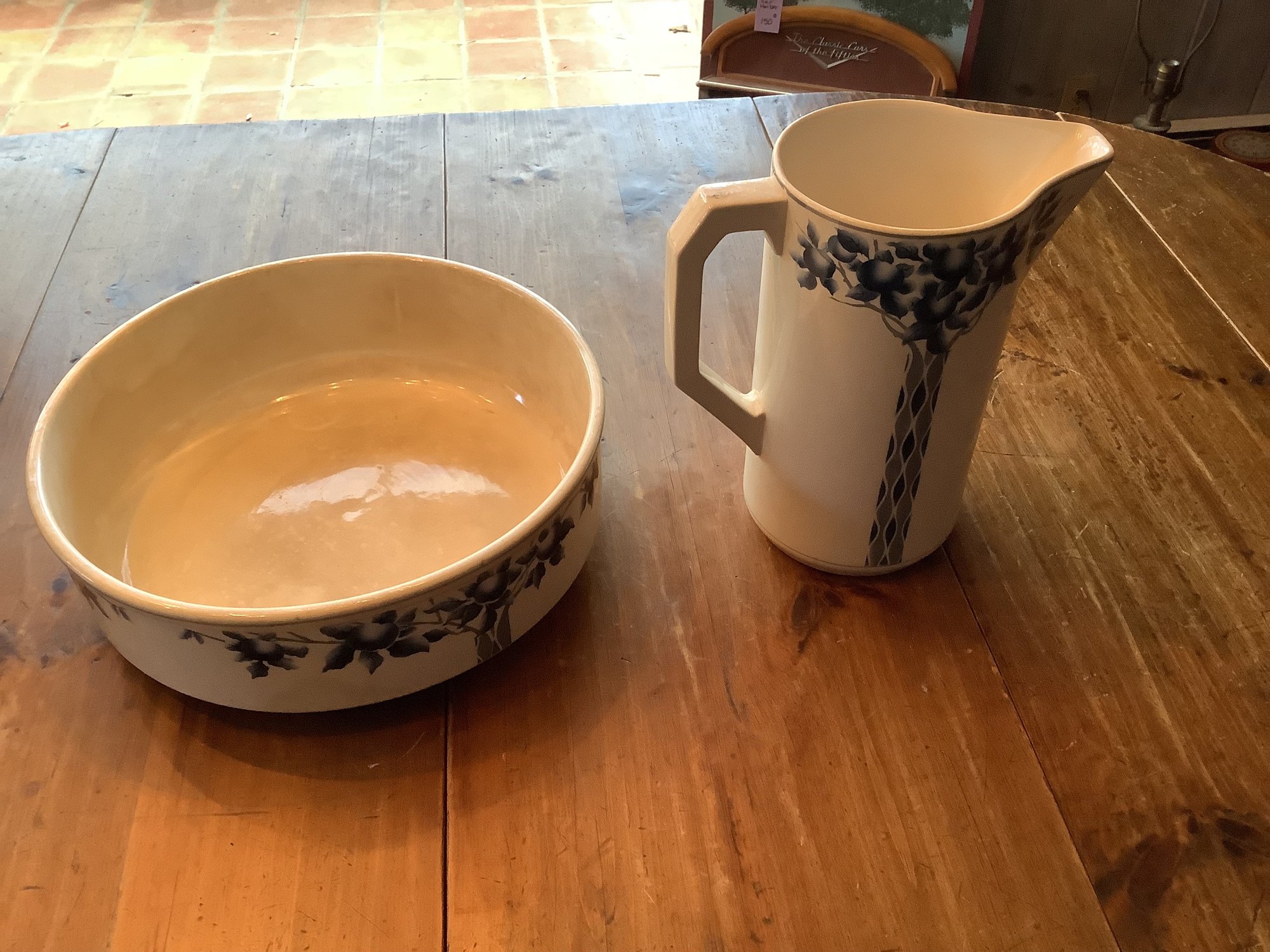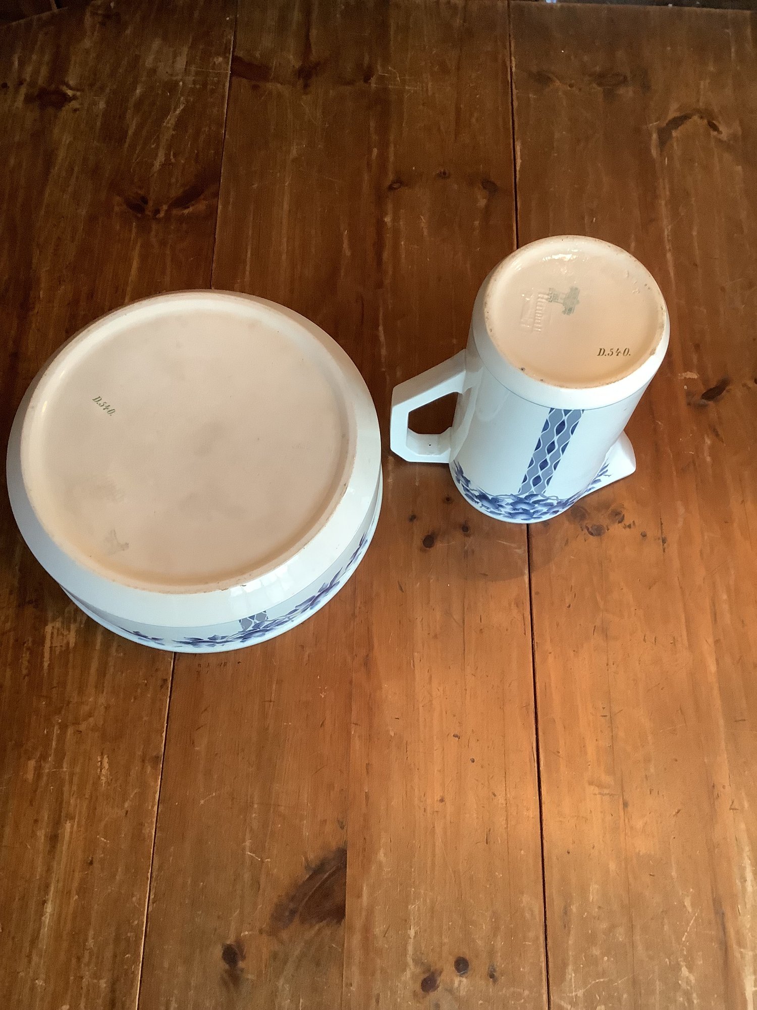 Royal Bonn Franz Anton Mehlem pitcher and basin set, with intricate blue and white designs, is a highly desirable late 19th to early 20th-century German porcelain item. Produced between 1836–1931 in Bonn, Germany, these pieces often feature Art Nouveau or detailed floral or fruit patterns. Pieces are in good vintage condition.