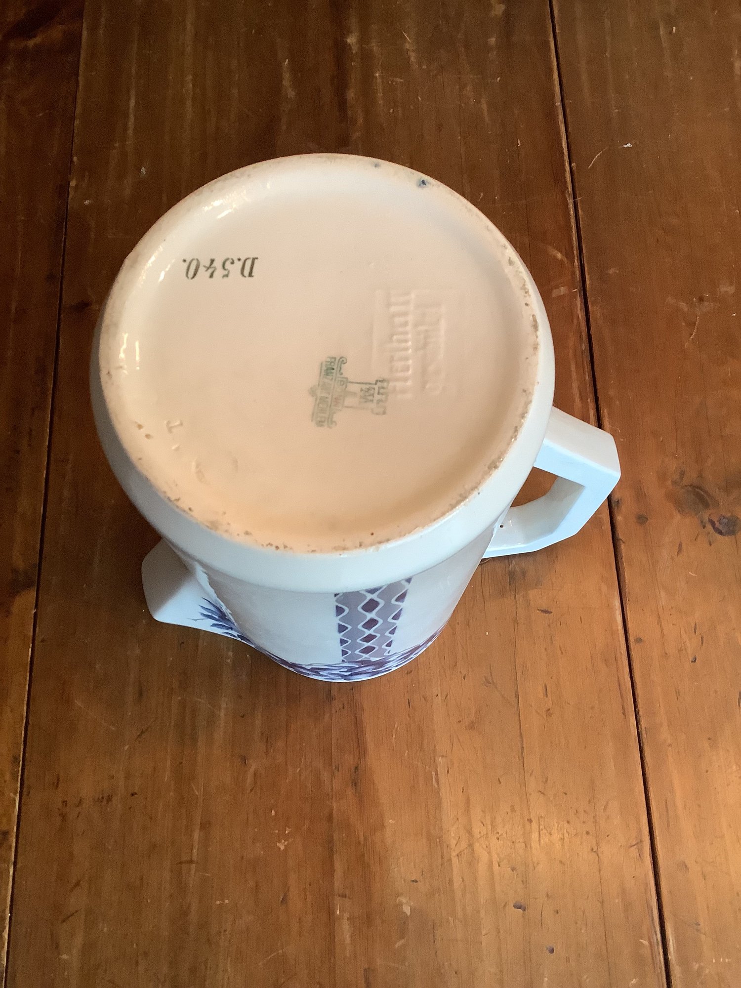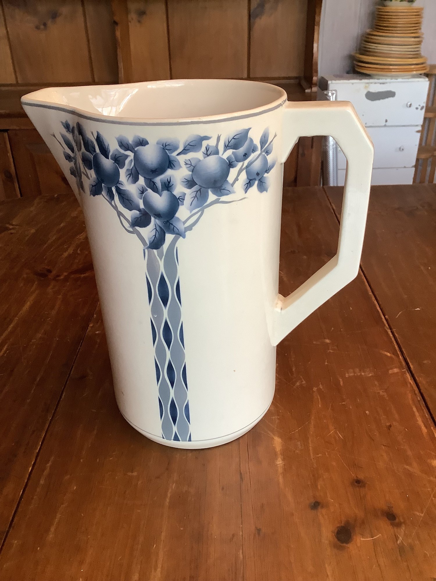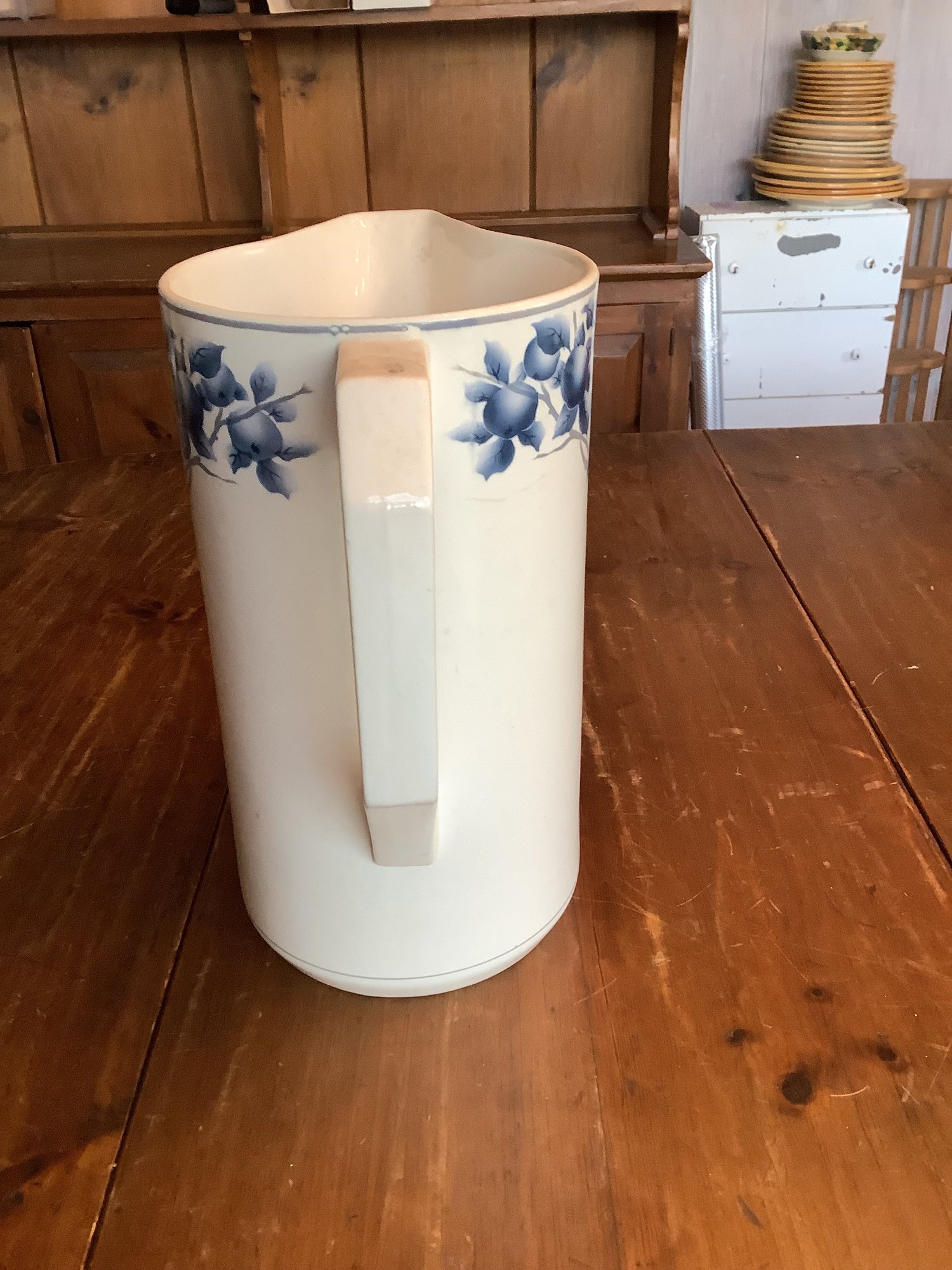 Royal Bonn Franz Anton Mehlem pitcher and basin set, with intricate blue and white designs, is a highly desirable late 19th to early 20th-century German porcelain item. Produced between 1836–1931 in Bonn, Germany, these pieces often feature Art Nouveau or detailed floral or fruit patterns. Pieces are in good vintage condition.