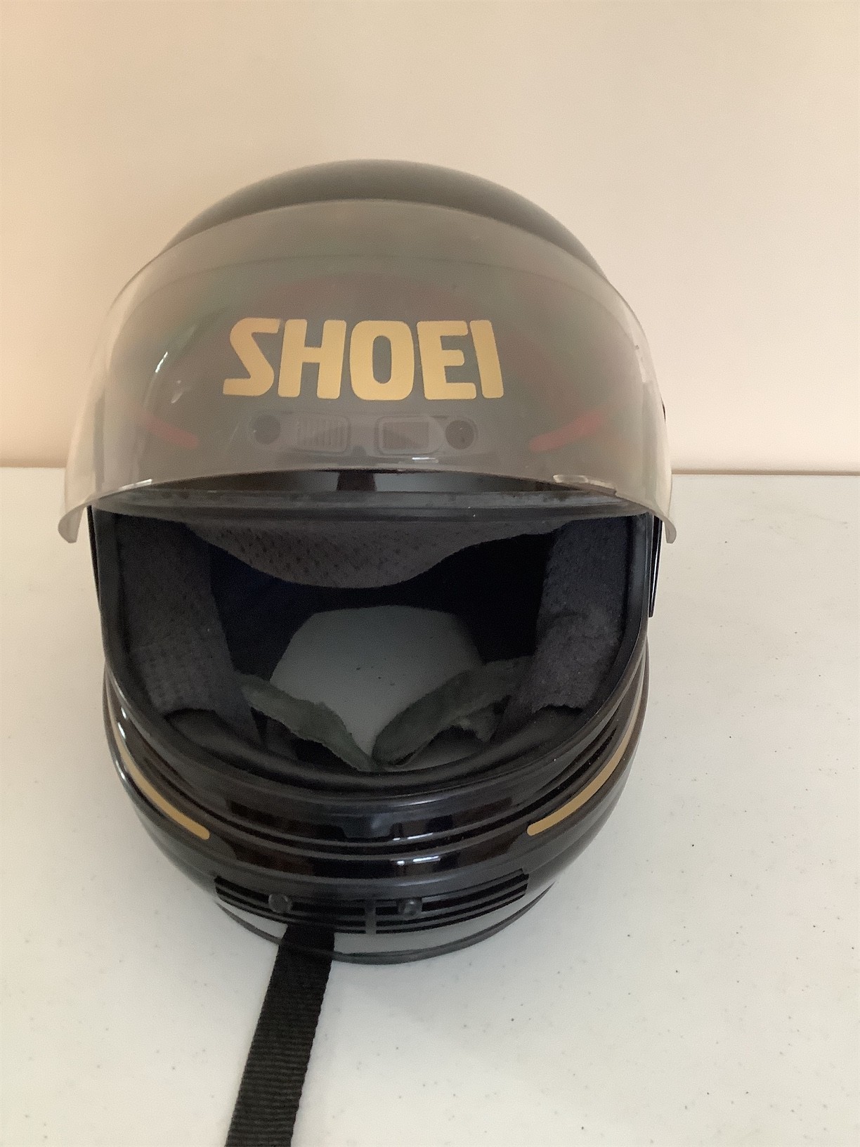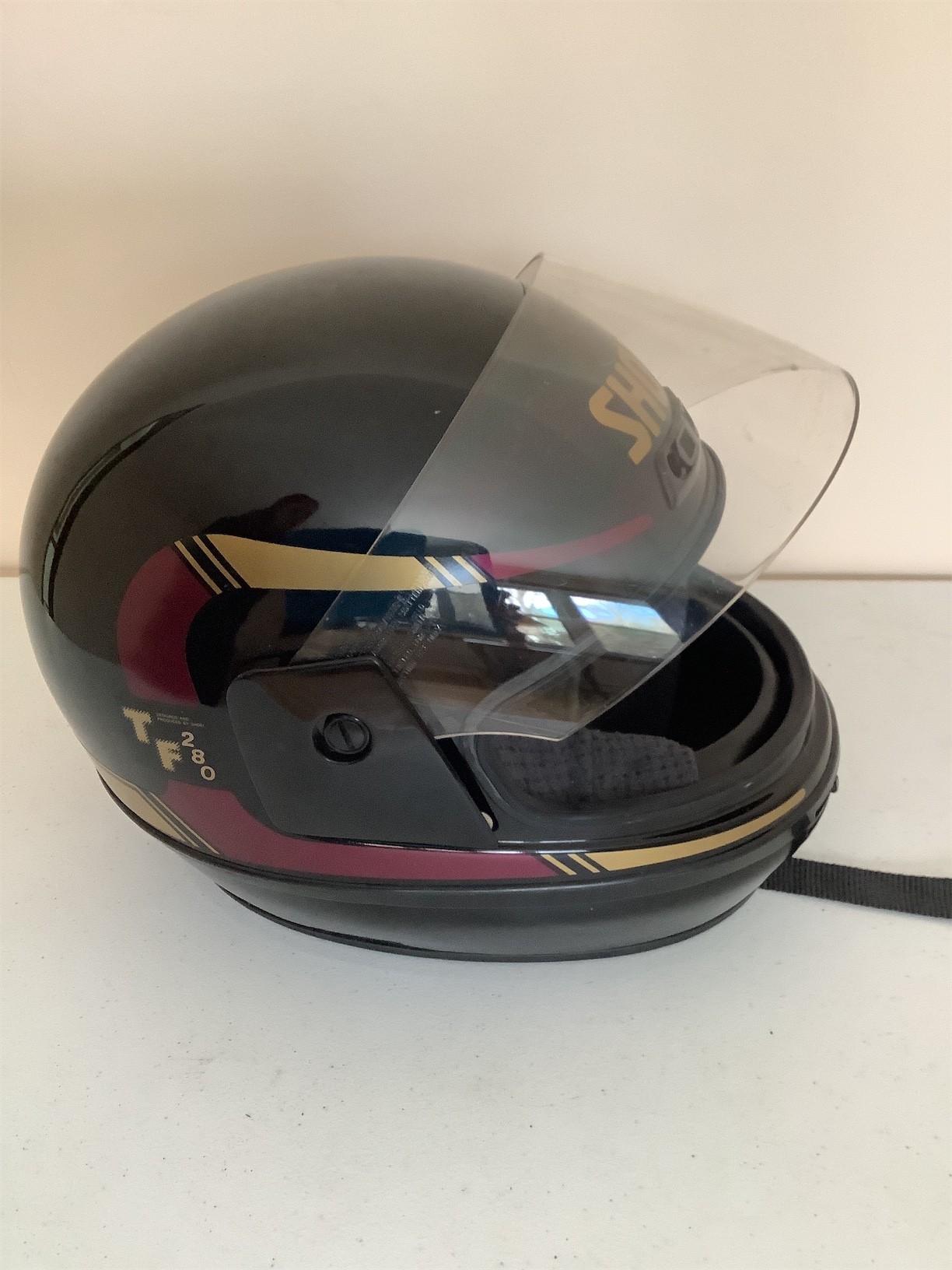 This Shoei helmet features a sleek, black design with striking gold and maroon accents. The exterior showcases the "SHOEI" logo prominently, reflecting a classic racing aesthetic. Equipped with a translucent face shield for added visibility and protection, the helmet also includes adjustable ventilation for comfort. Inside, the helmet is lined with soft padding, providing a snug fit and enhancing comfort during use. The chin strap features a quick-release mechanism, ensuring secure fastening. This helmet represents a blend of style and functionality, suitable for bike enthusiasts and collectors alike. Size small.
