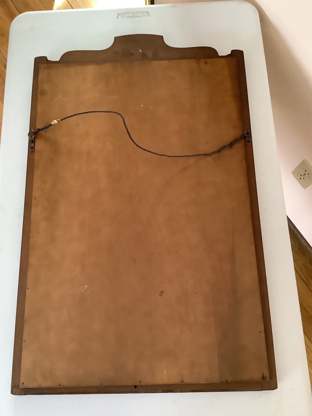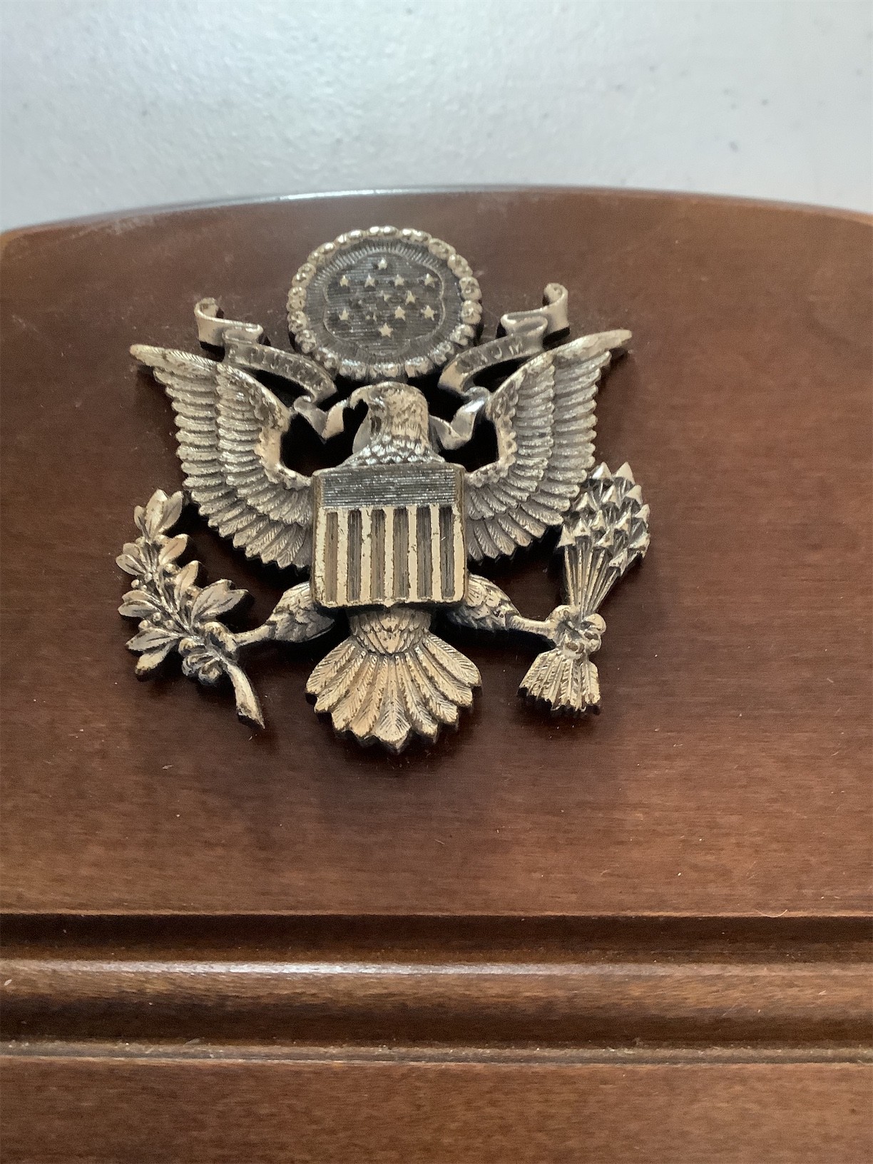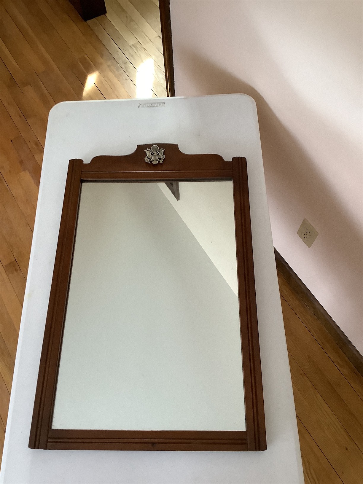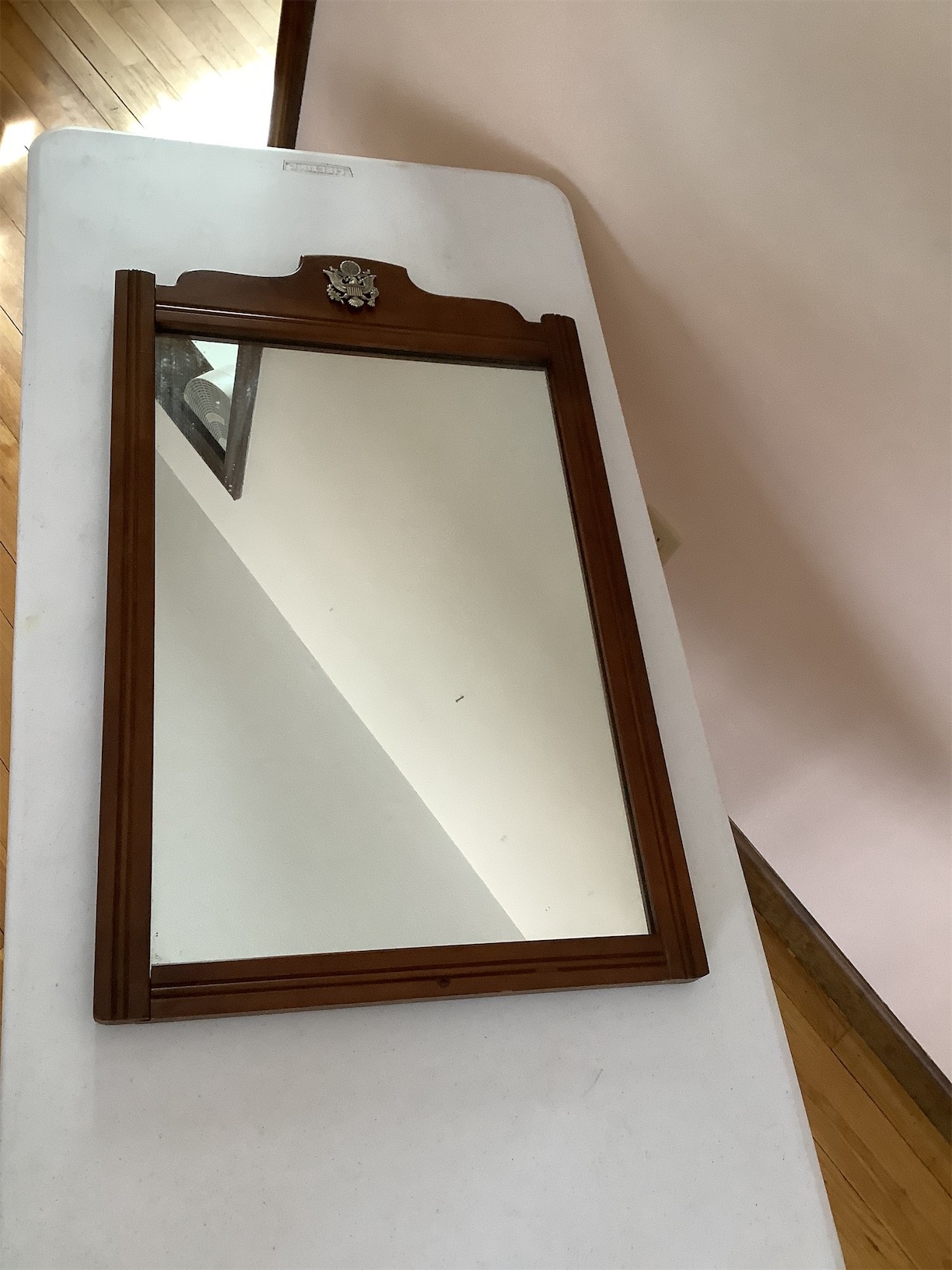 This Vintage Tell City Chair Wall Mirror features a classic design with a rich wooden frame and a distinct emblem at the top. The mirror is framed in a sturdy construction, showcasing a polished surface that reflects elegance and style. The emblem of the eagle at the top adds a unique touch, symbolizing strength and tradition. The back is finished with a smooth surface and includes a hanging mechanism for easy display. This piece is ideal for adding a touch of vintage charm to any living space. 18.5 X 30