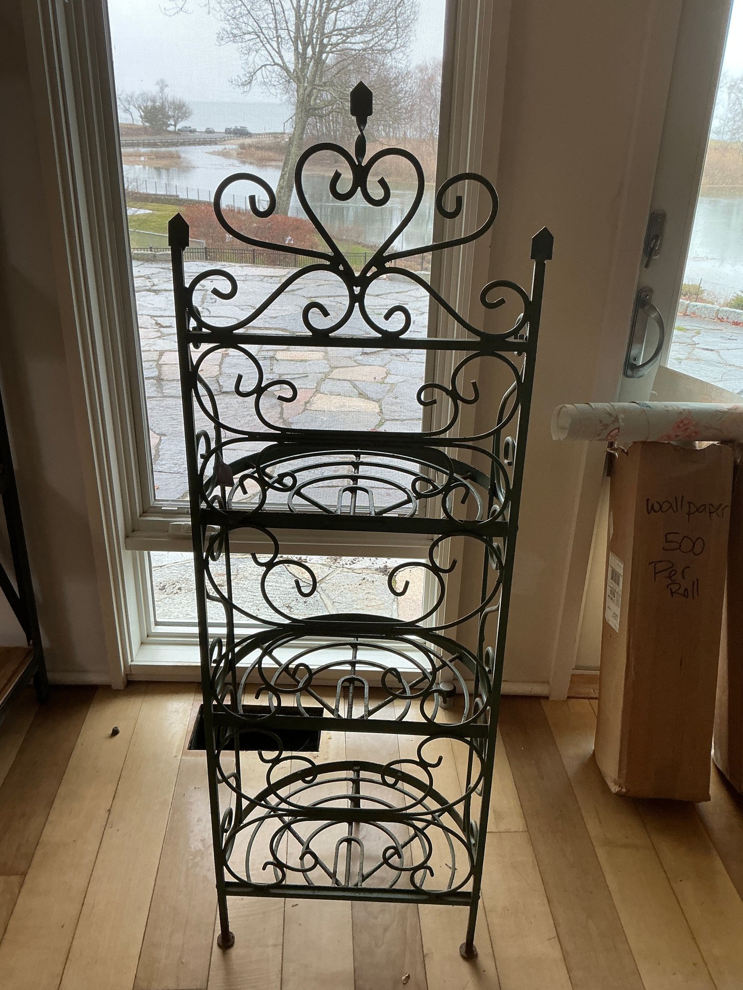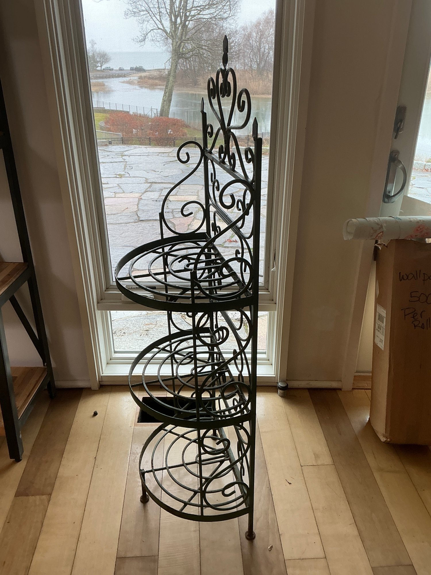 Vintage wrought iron Bakers Rack or Plant Stand. This stand is heavy, solid wrought iron and is in very good condition. Measures 55 1/2” H x 18” W x 12” D.