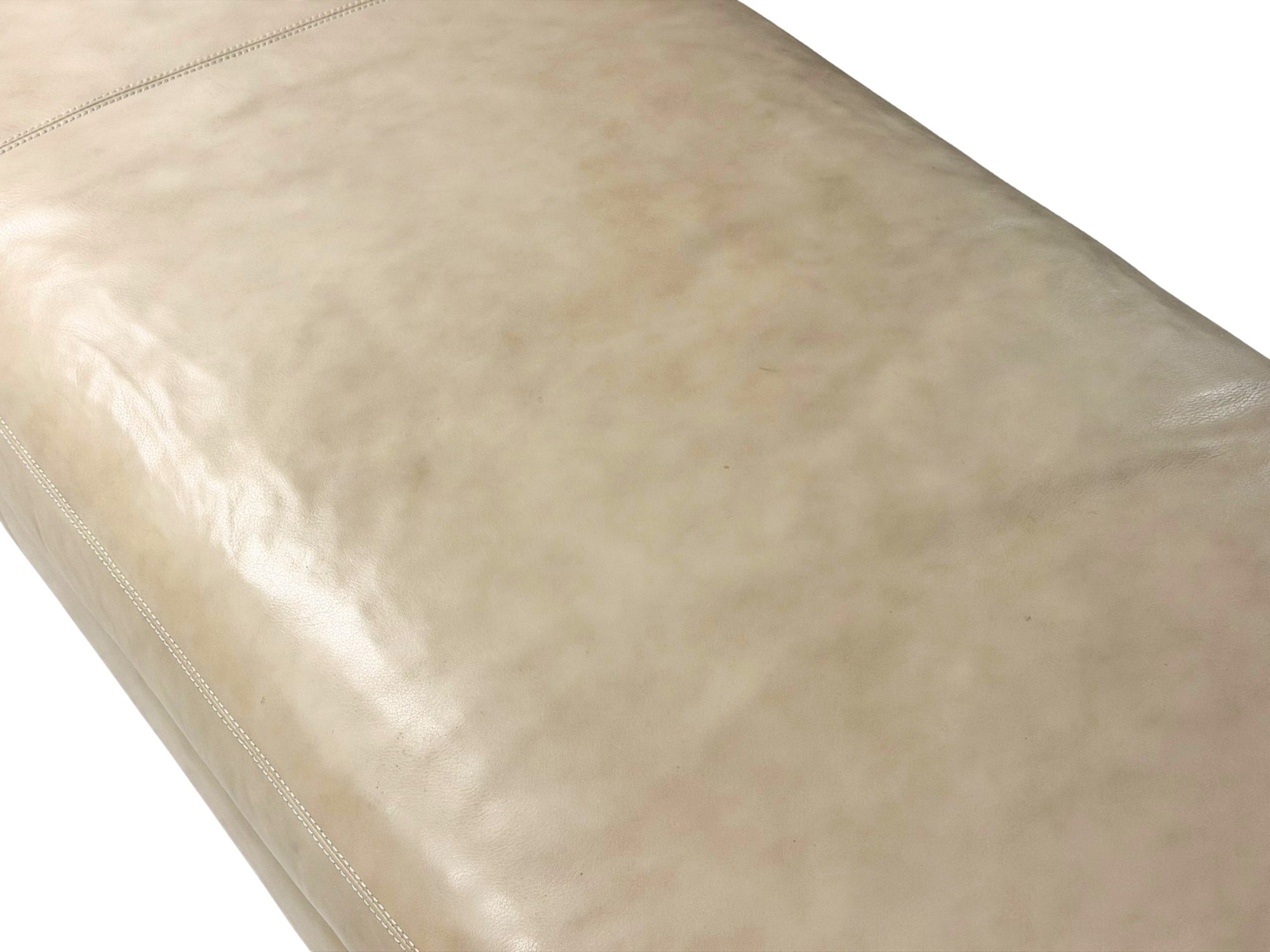 Contemporary long bench upholstered in soft beige leather, showcasing a streamlined, low-profile form with subtle natural wear that enhances its lived-in appeal. The elongated proportions make it a statement yet functional piece, while slim chrome legs provide a clean, modern contrast. This is 1 of 2 available in this auction.