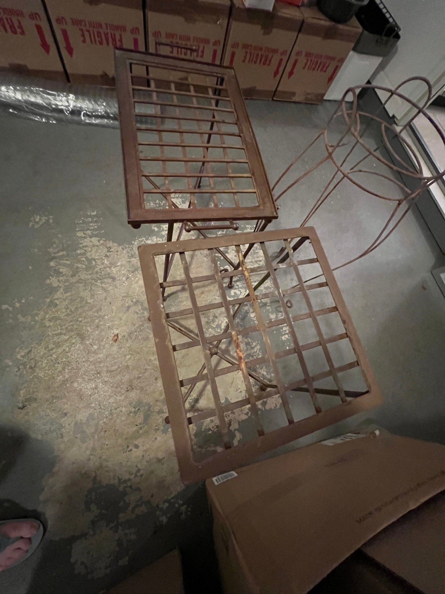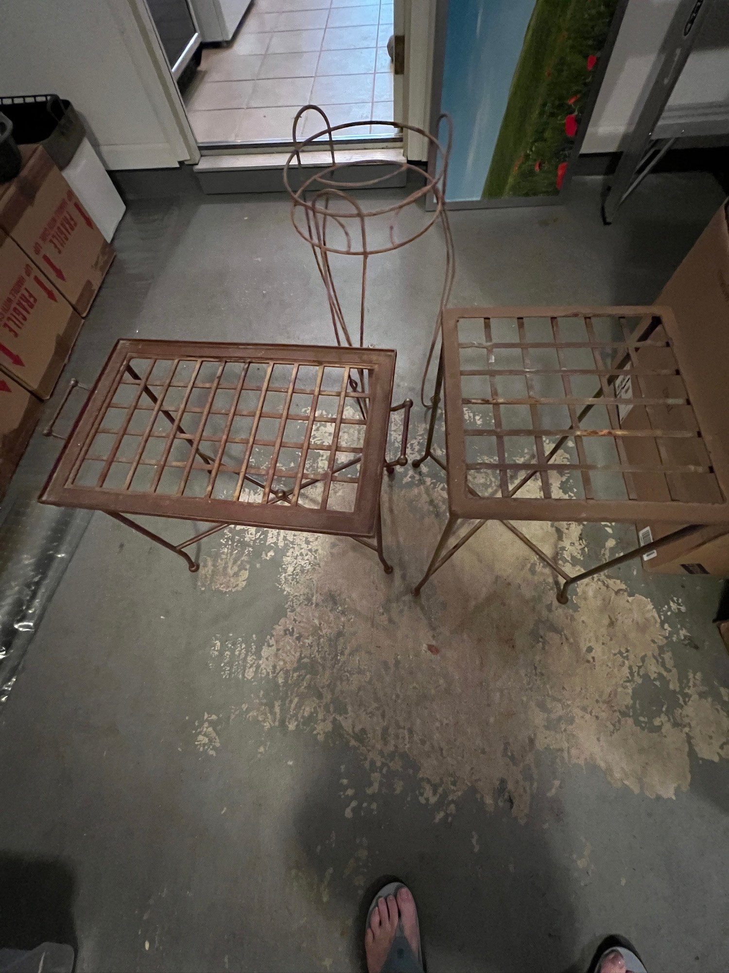 1 plant stand, 2 outdoor tables, metal