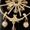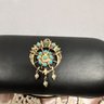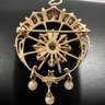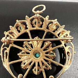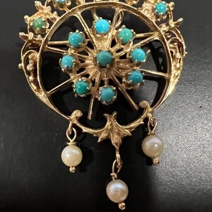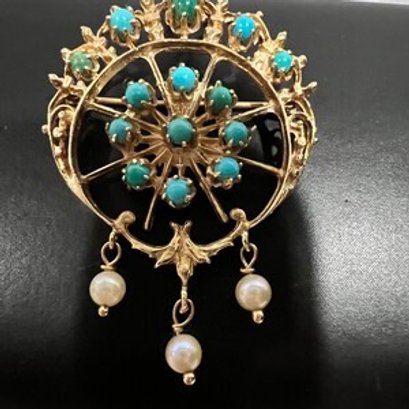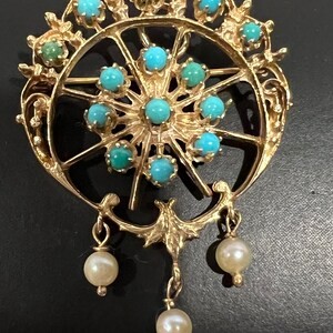 Lovely, 14 kt., yellow gold with natural Turquoise stones, and hand strung seed pearls, with a circular brooch, or hanging pendant option. Prong set turquoise, with beaded gold accents, 2 inches long, x 1 1/4 inch wide, a generous sized piece, with dainty crown like setting with great eye appeal, weighing 5.6 pennyweight, or 8.7 grams