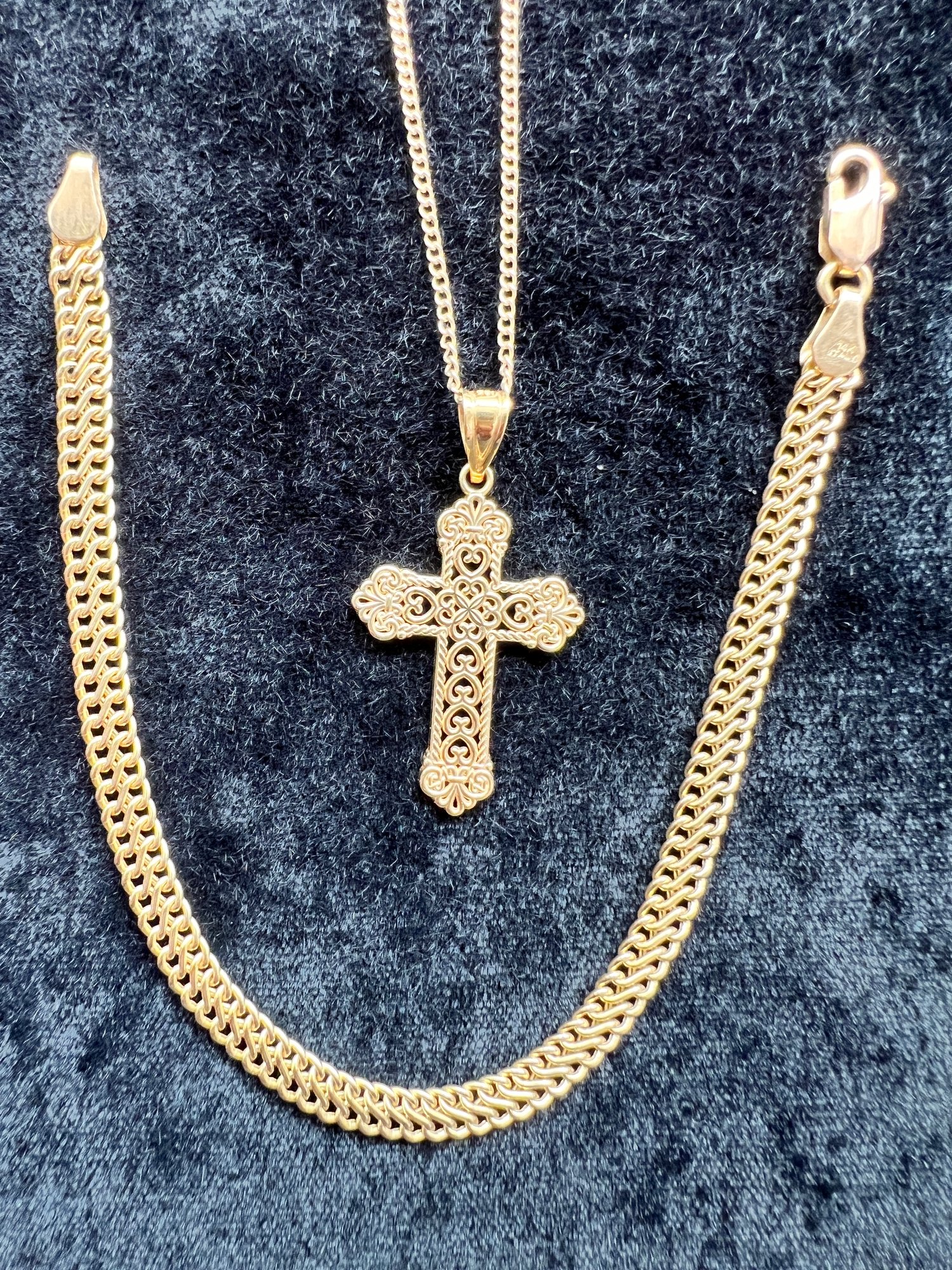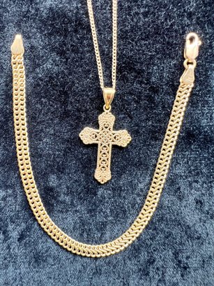 14 Kt YG Mesh Cross On 18" Chain, With Mesh Bracelet, 7", Weighs 4.1 Dwt