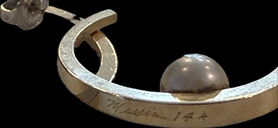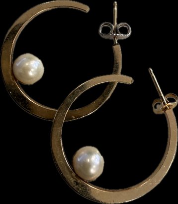 Elegant pair of 14K yellow gold hoop earrings featuring a sleek modern open-circle design accented with cultured pearls. Each hoop curves gracefully around a single pearl that appears to float within the circular form, creating a clean contemporary look with classic pearl elegance. The earrings are stamped 14K and fitted with post and butterfly backs. A stylish and versatile pair that can be worn for both everyday sophistication and formal occasions.