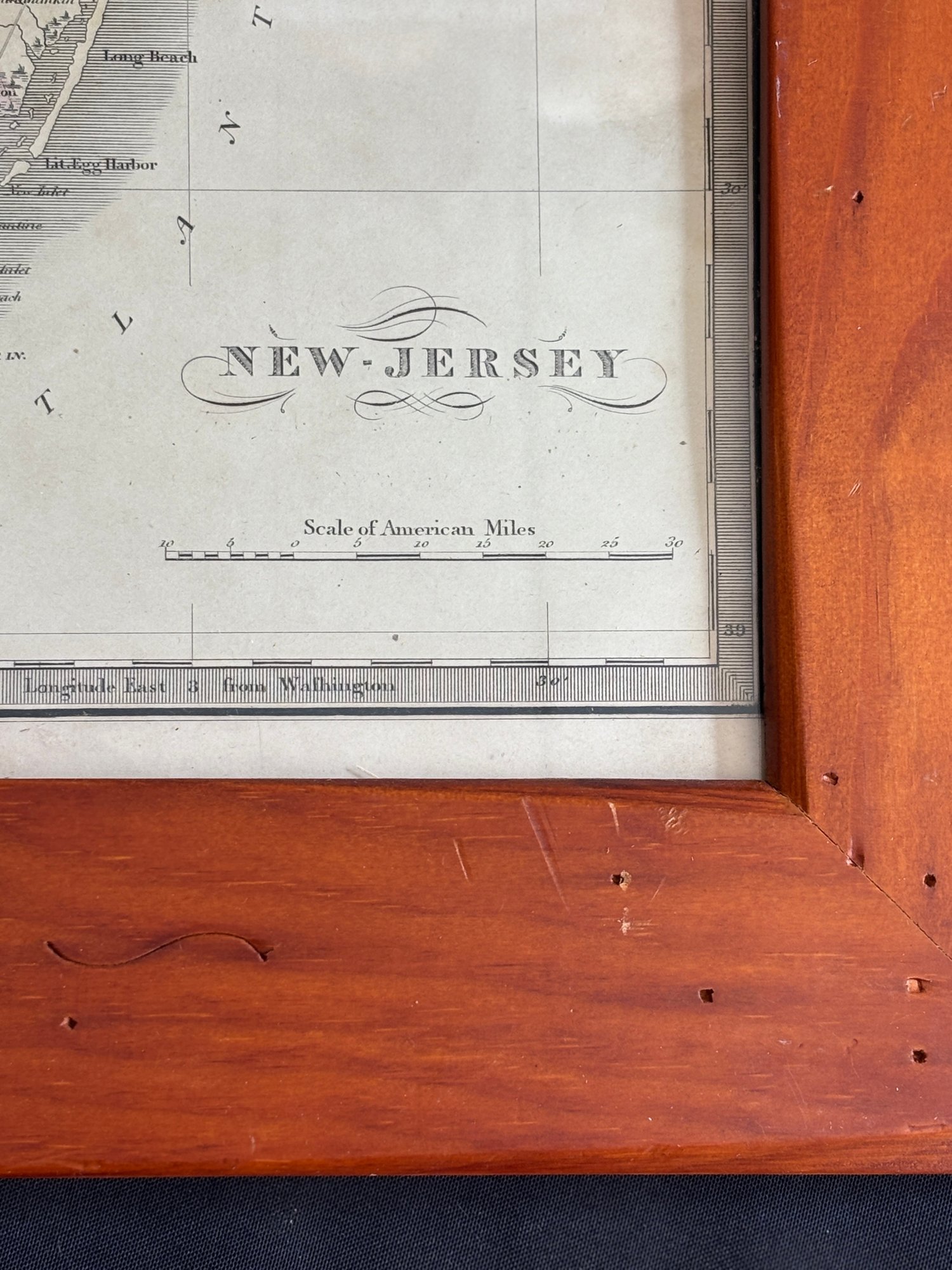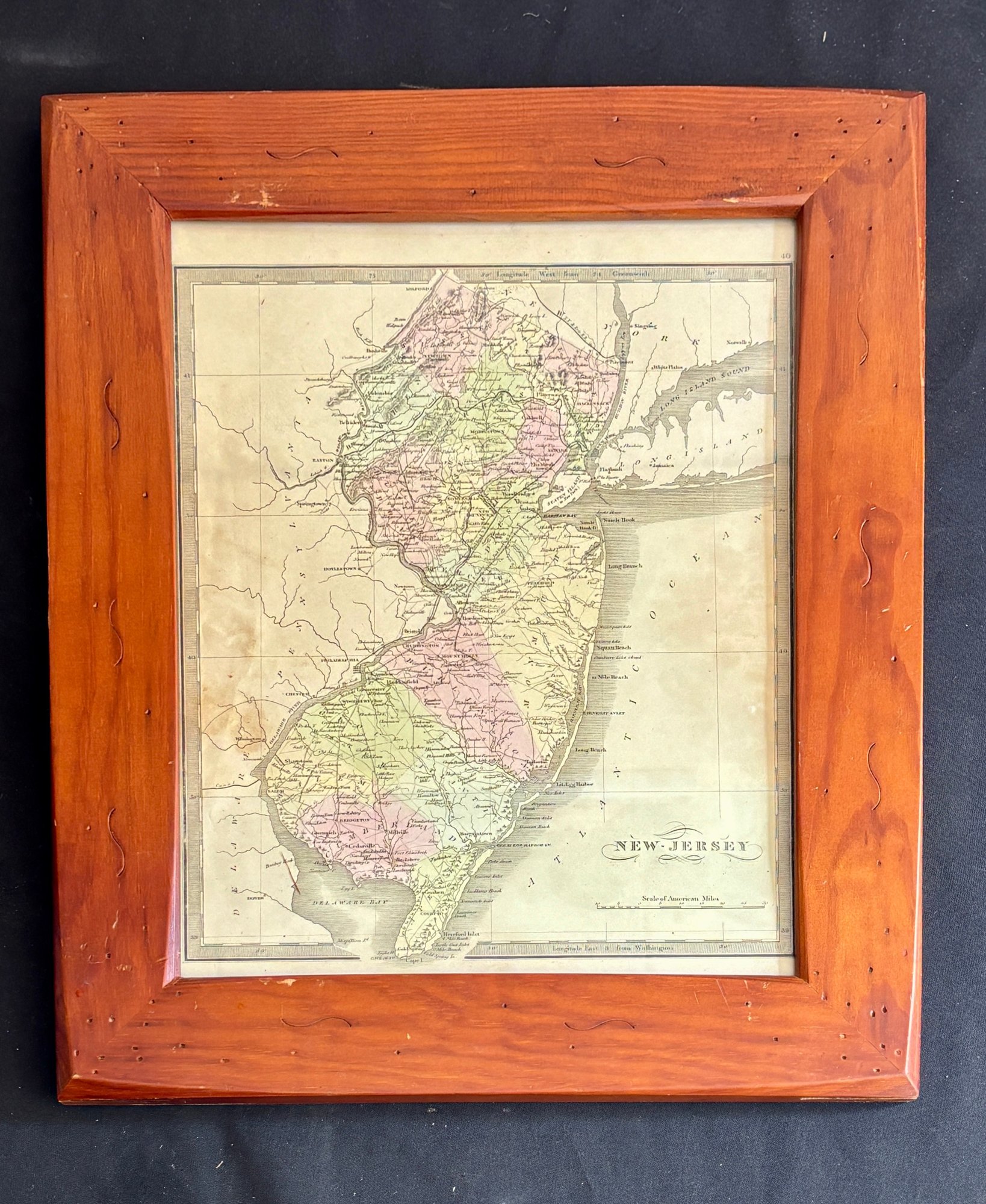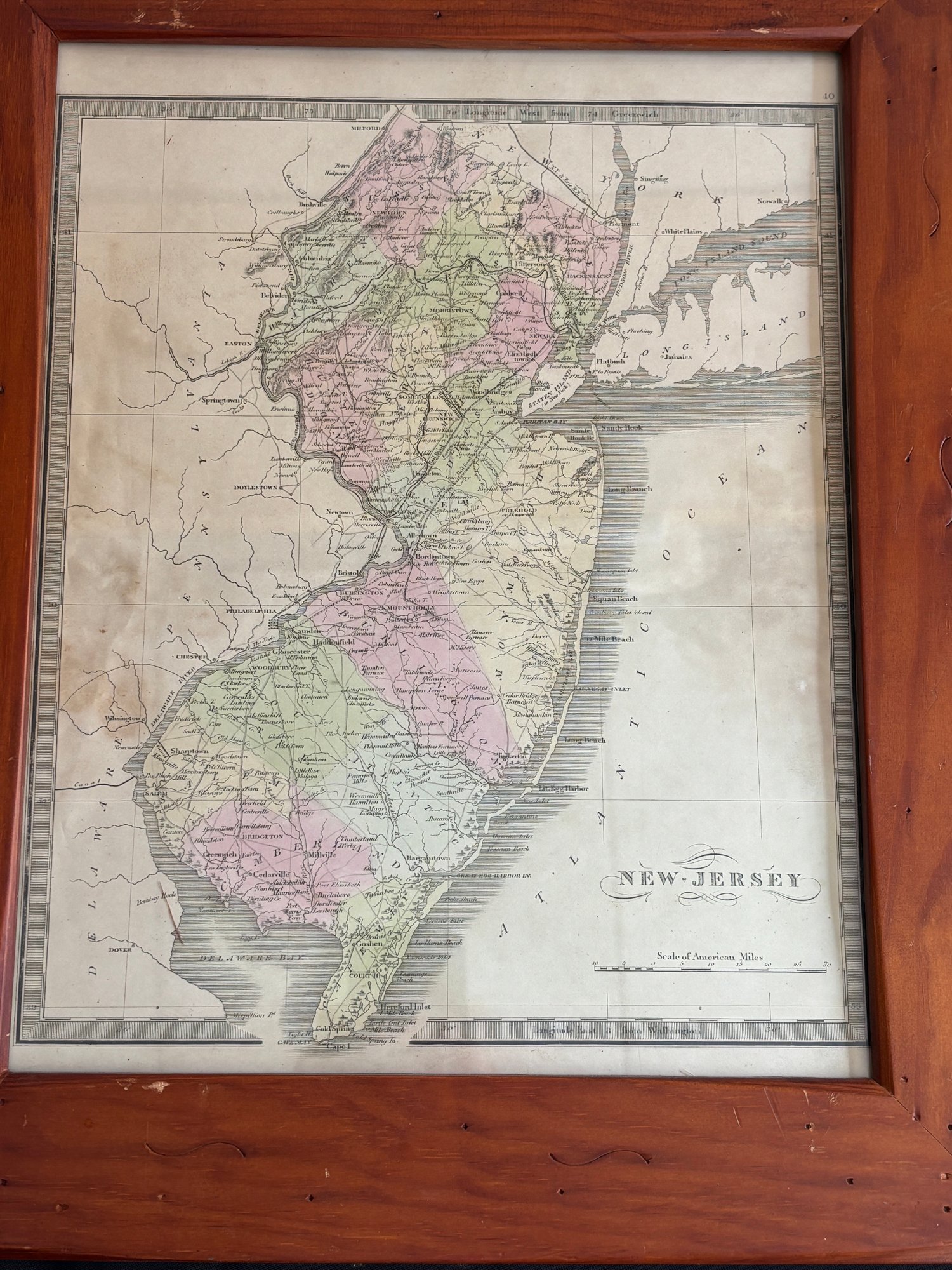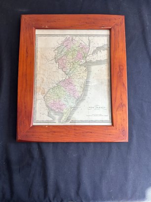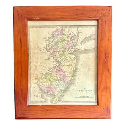 The map is presented in a substantial wooden frame that complements the age and character of the piece, making it a compelling display for collectors of American history, regional cartography, or New Jersey ephemera.