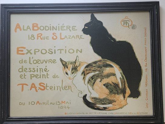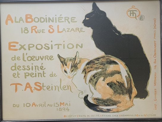 The Poster ("Two Cats"): The event is famous for its promotional poster designed by Steinlen, often known as "A la Bodinière" or "Two Cats" (Des Chats). It features two cats—one black and one white—and showcases Steinlen's mastery of the Art Nouveau style and his love for portraying cats.