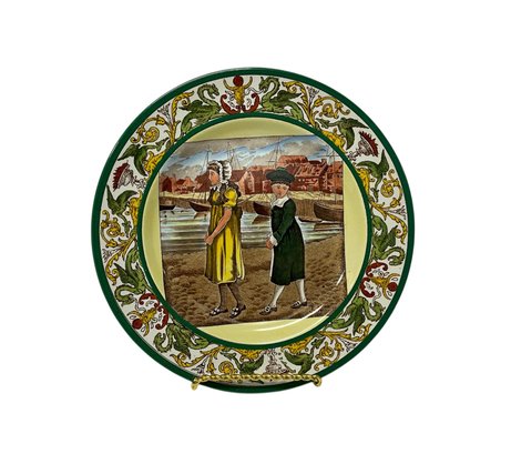 The title of the plate is "July," and pictures a colonial boy and girl walking on a sandy beach along a harbor.