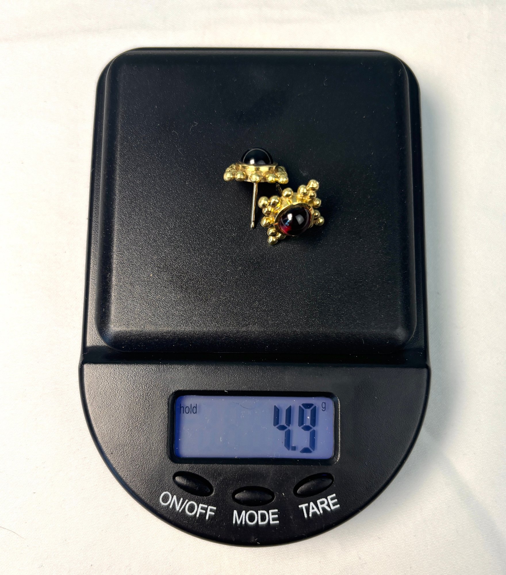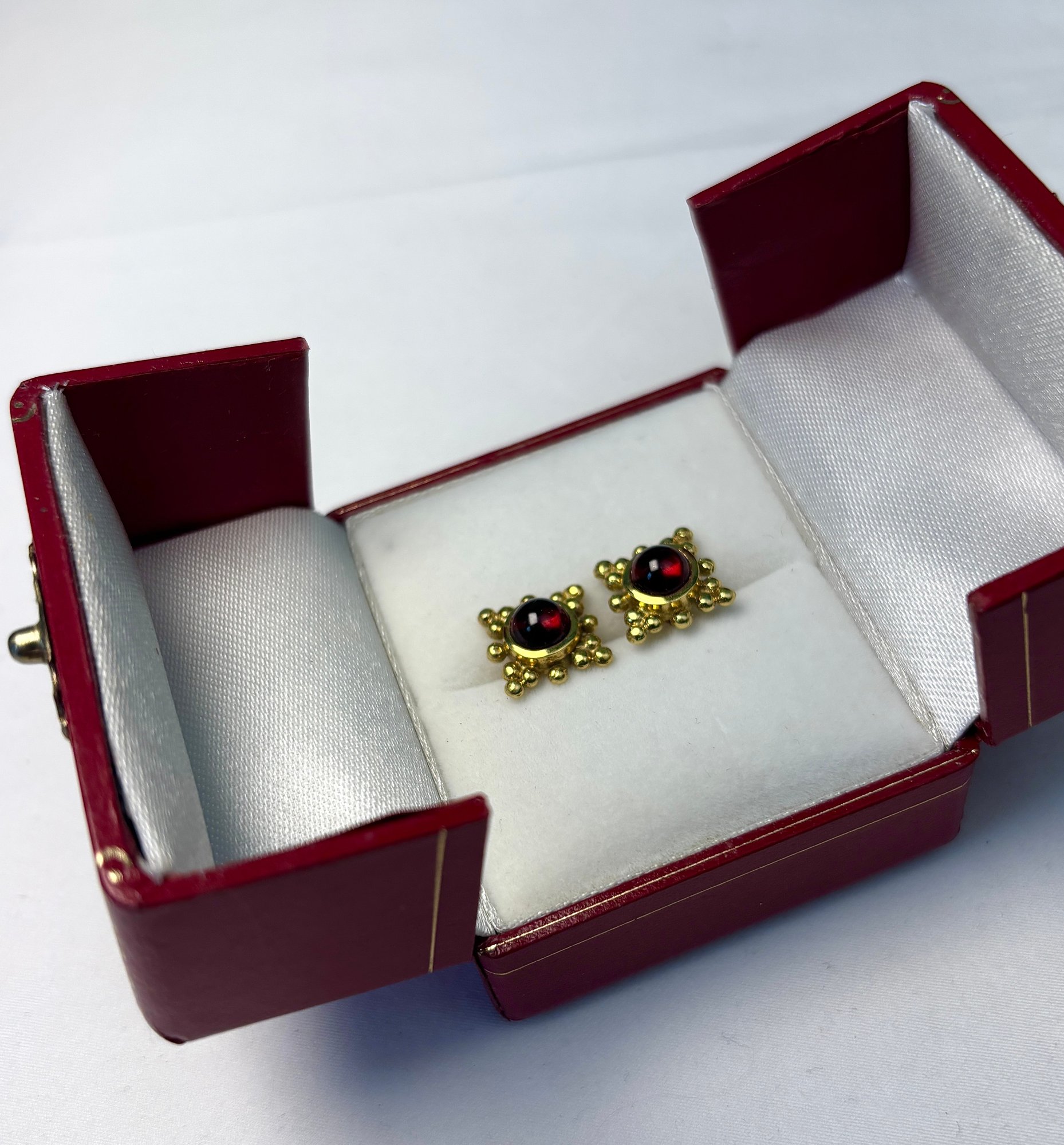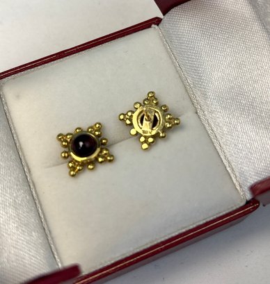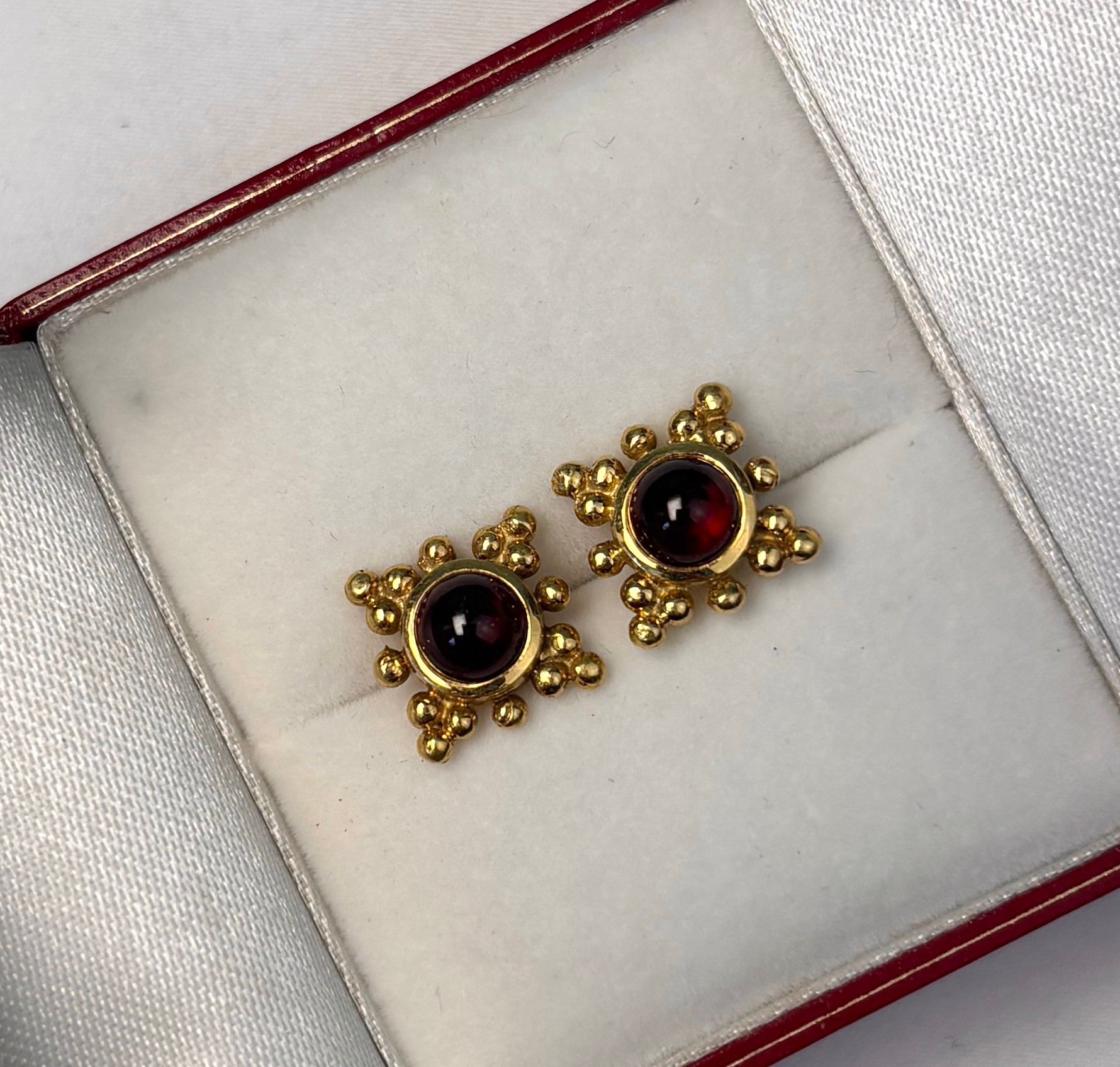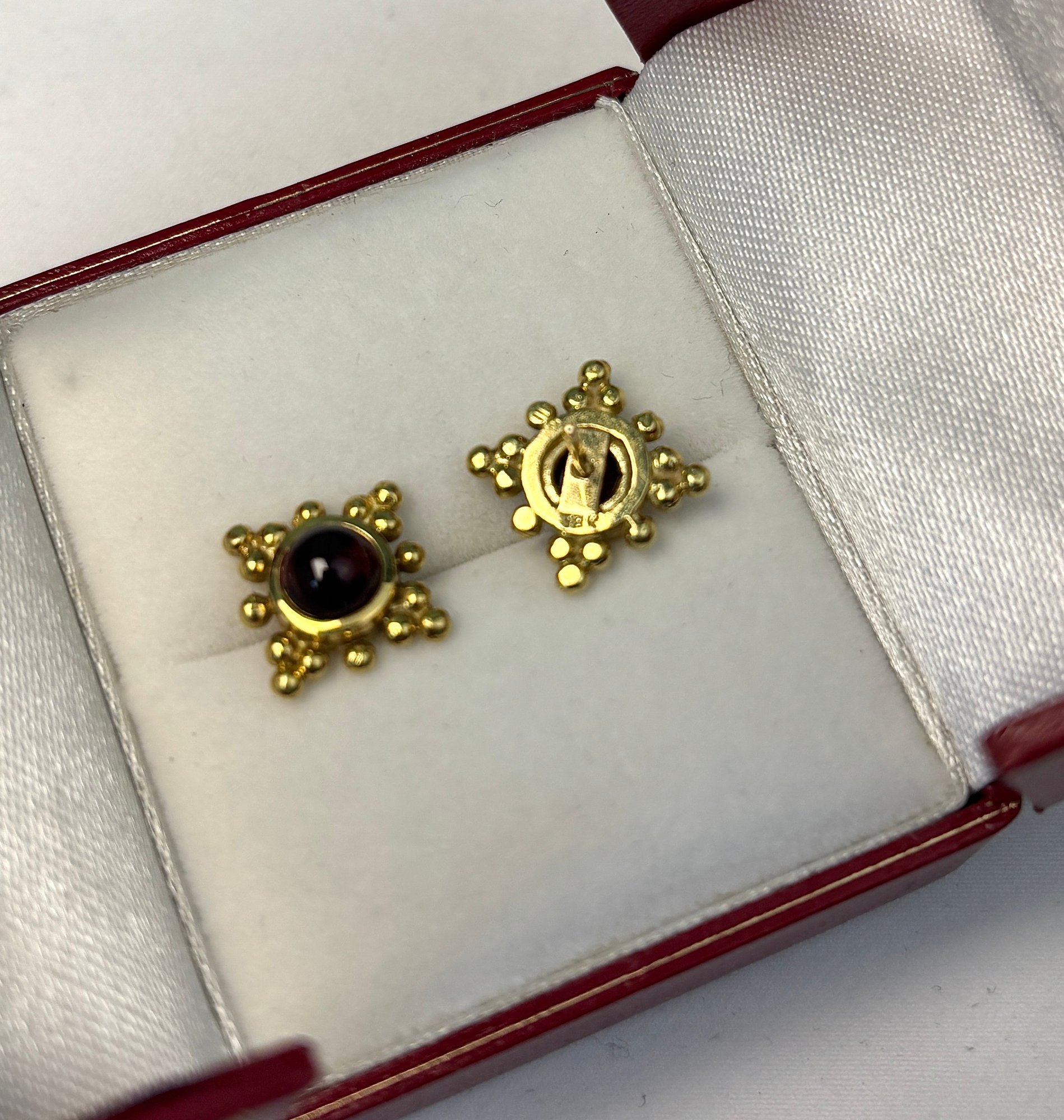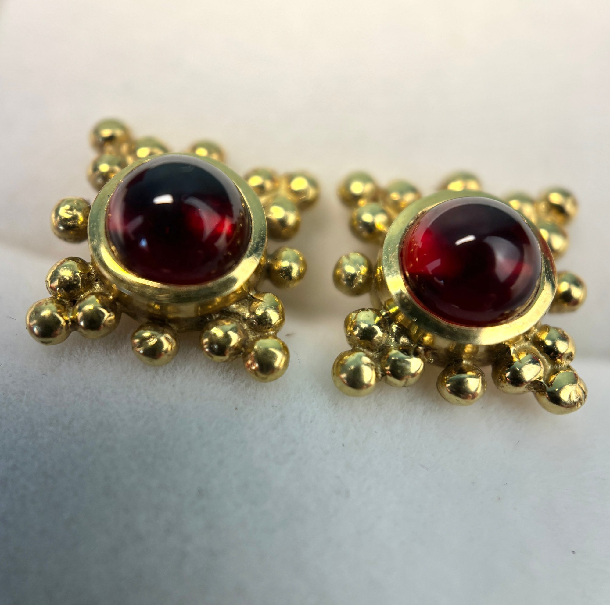 Marked 18K on the reverse of each, and set with bright and lovely garnet cabochons.