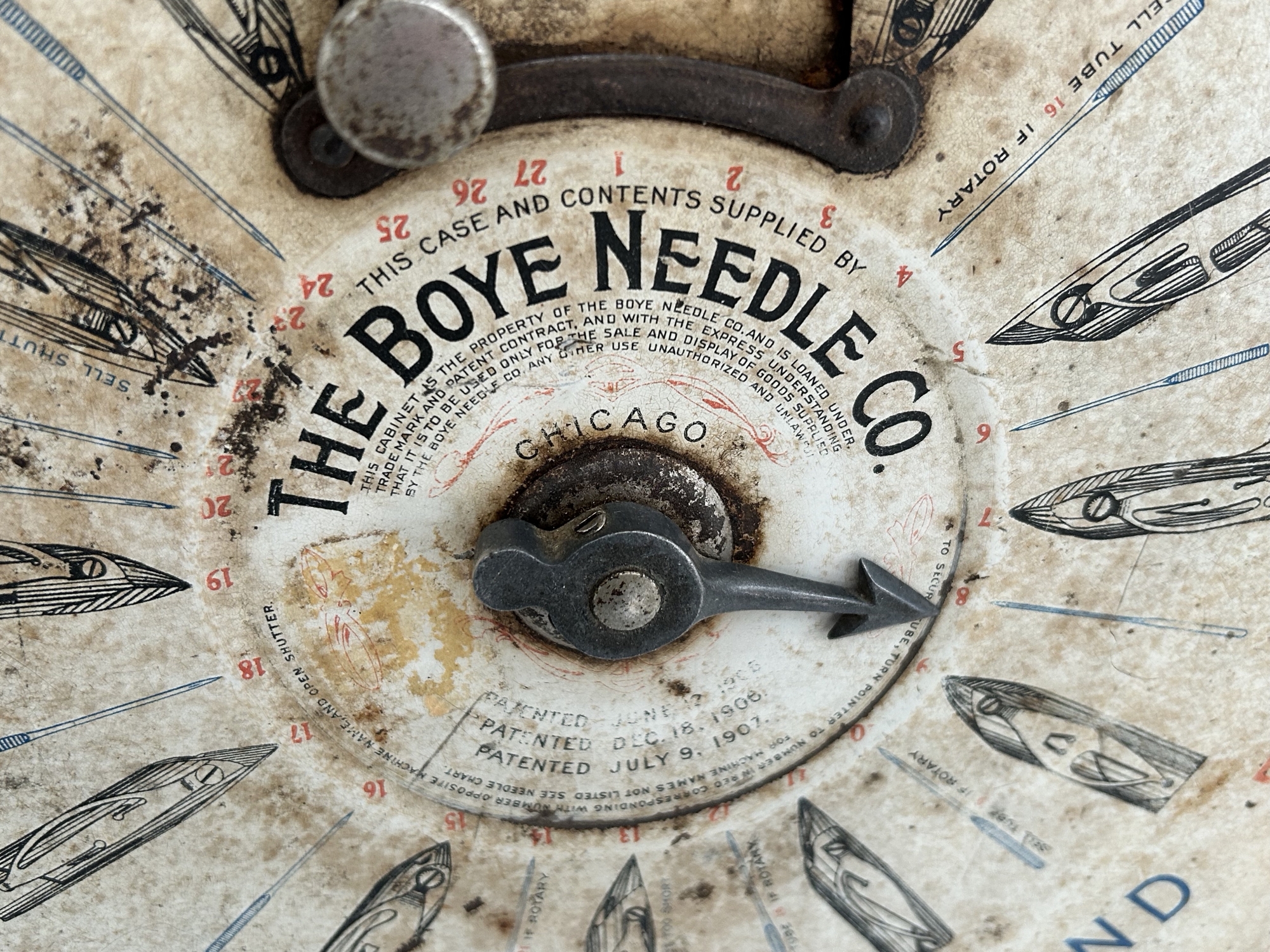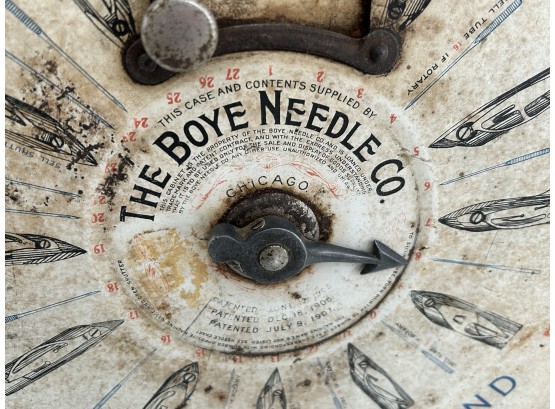 This wonderful general store display is truly an antique. IThe outer edge lists the content location by machine brand. Turn the dial to the correct location, open the door to access the product. The case will not spin if the door is open. The tin case and graphics are in very good condition as seen in the photos. There are 3 "Needles" graphics on the side.