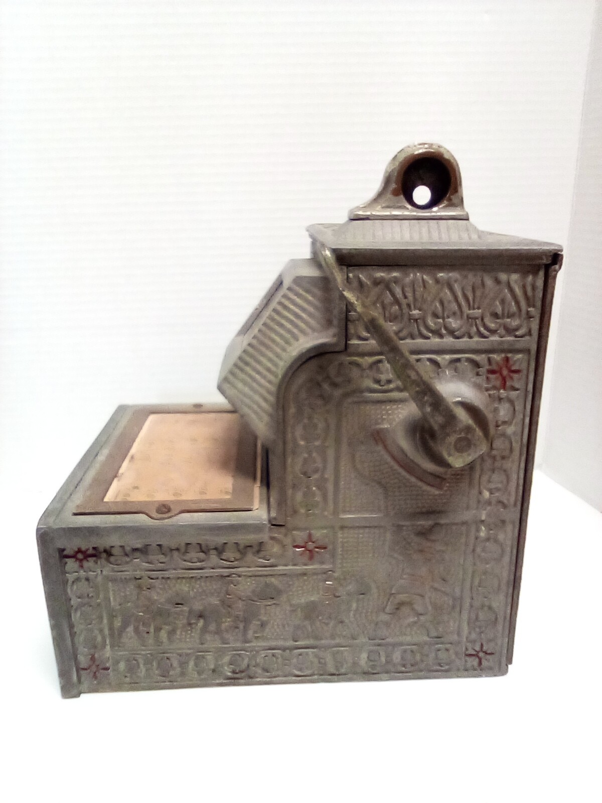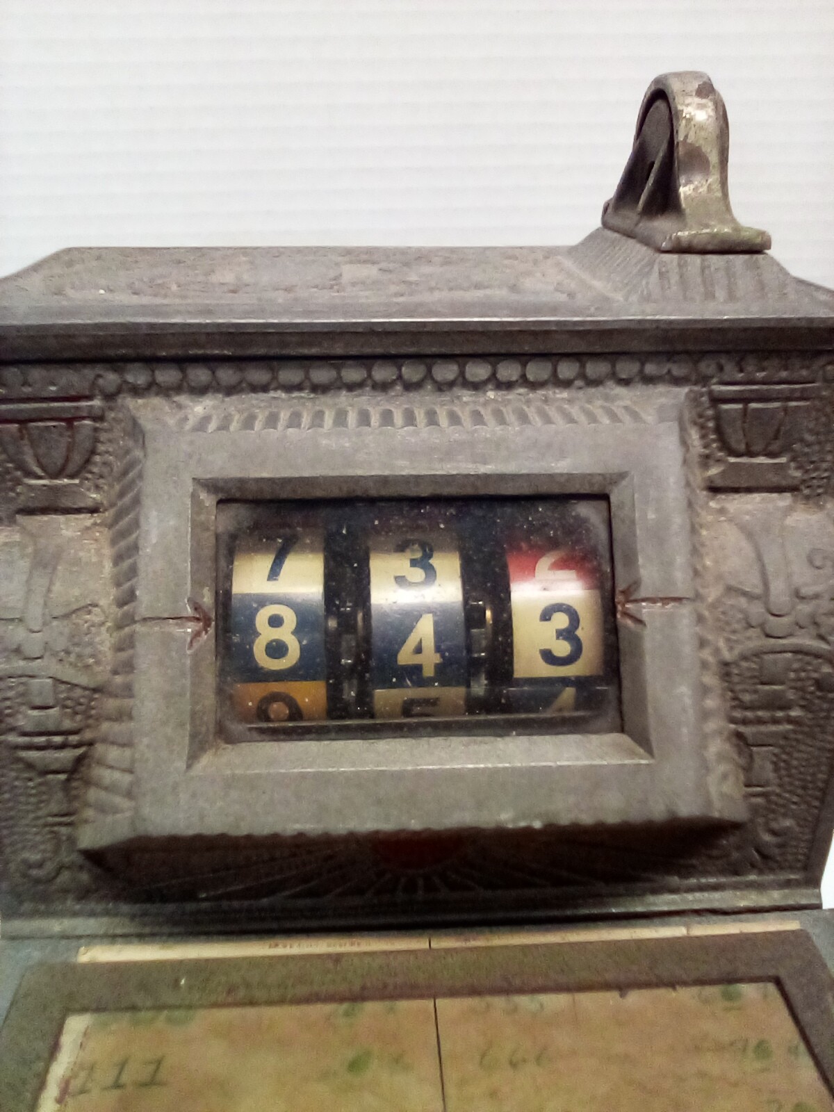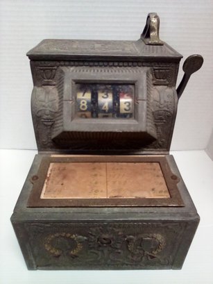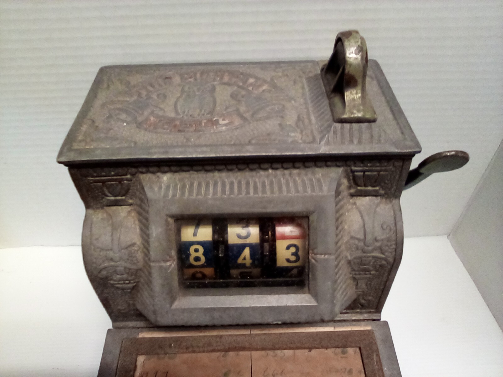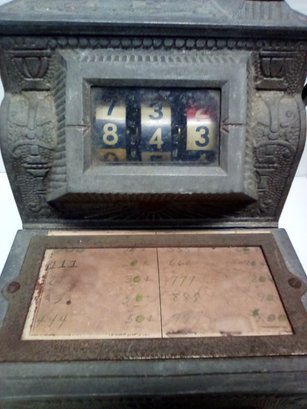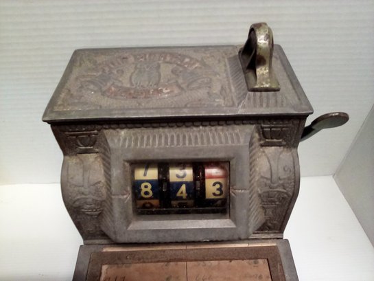 1920s Mills The Puritan Bell - Trade Stimulator (Slot Machine) - spins by handle with a nickle - no keys. See photos for closer look. Fun conversation piece - ornate cast metal. Front left side shows 10600 incised in metal. Note: It is heavy - it sounds like there is a lot of old coins inside!!!