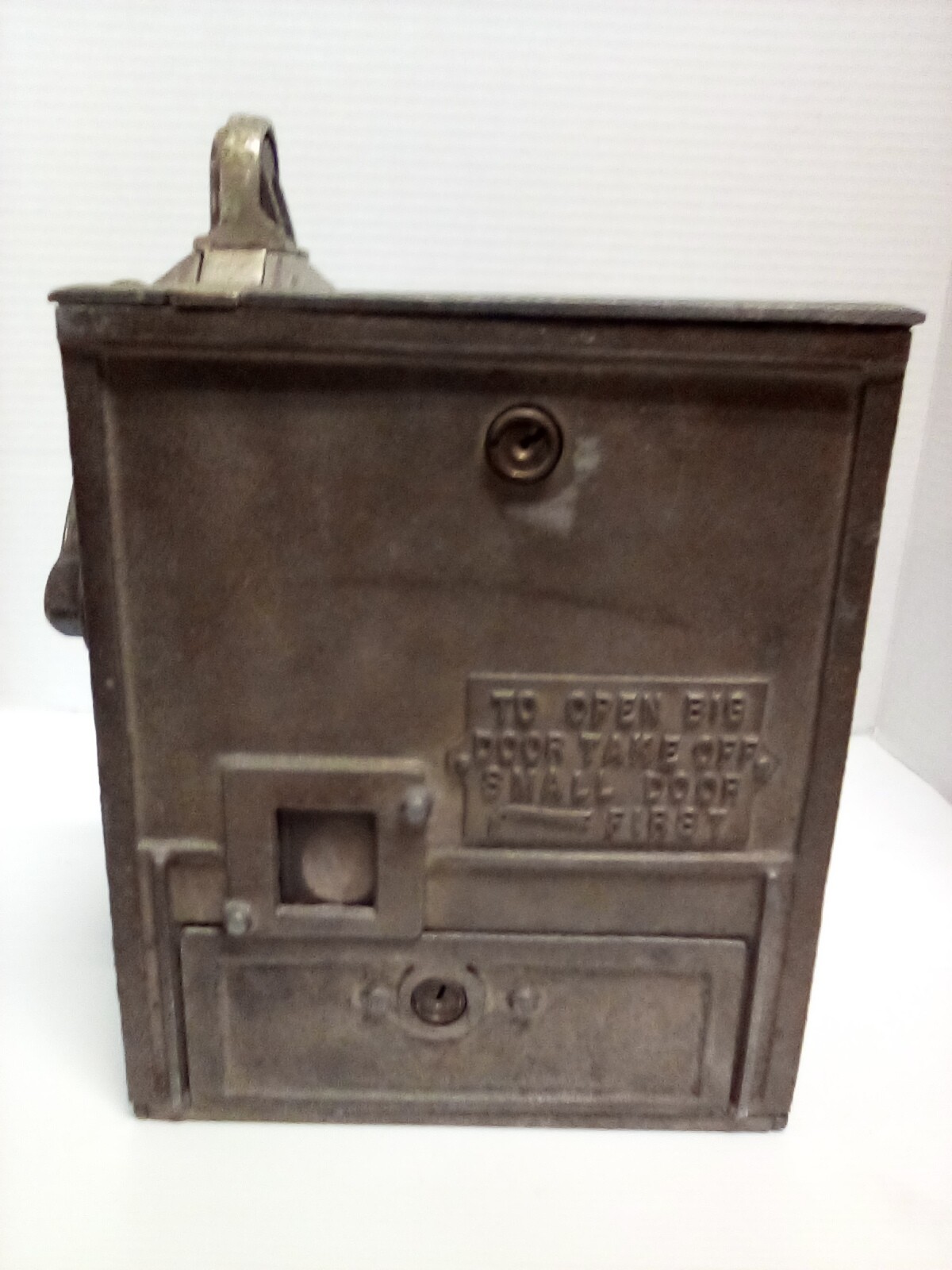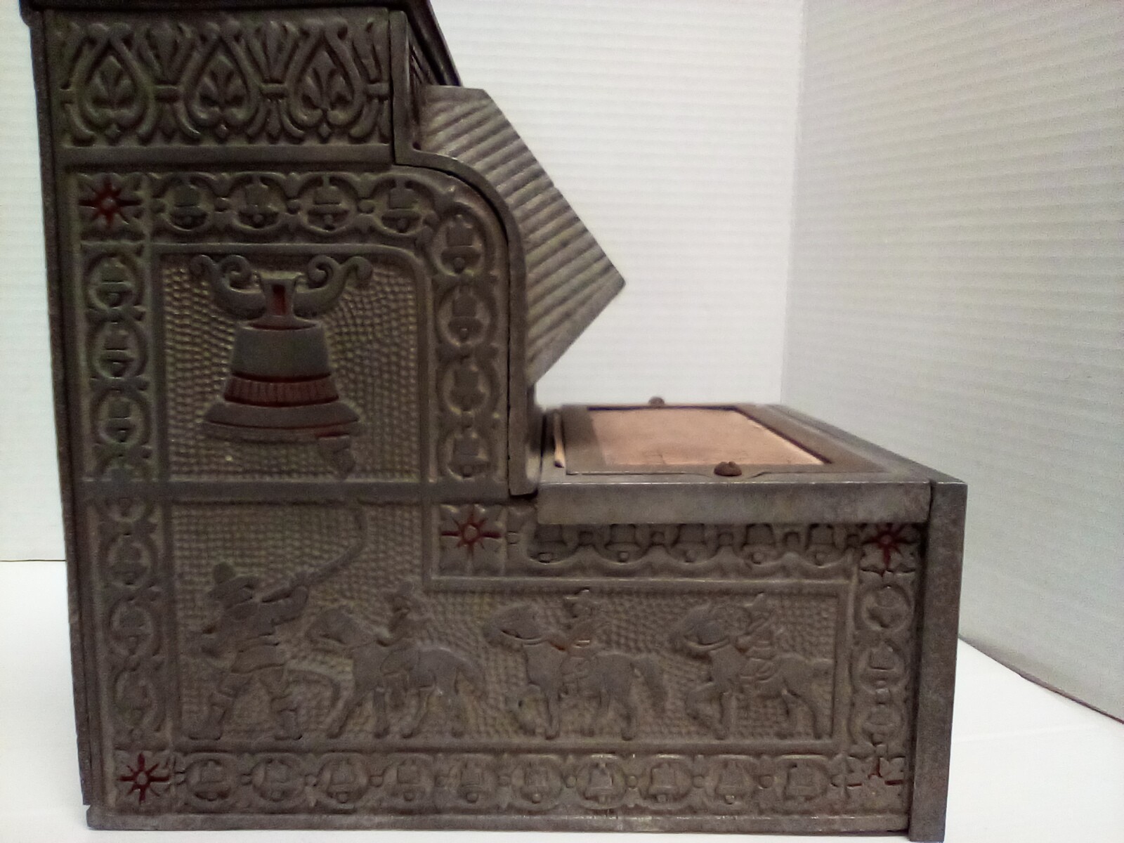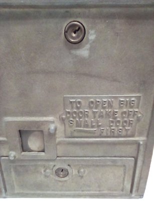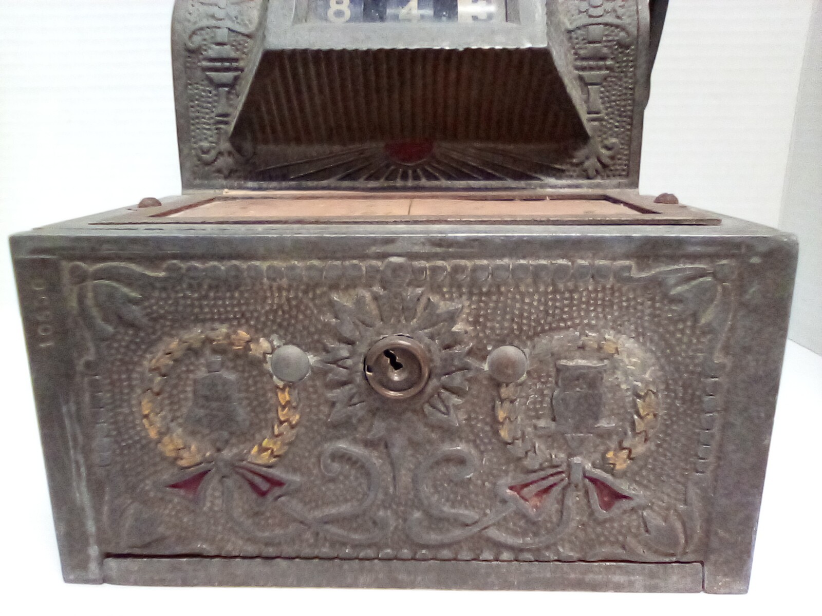 1920s Mills The Puritan Bell - Trade Stimulator (Slot Machine) - spins by handle with a nickle - no keys. See photos for closer look. Fun conversation piece - ornate cast metal. Front left side shows 10600 incised in metal. Note: It is heavy - it sounds like there is a lot of old coins inside!!!