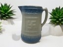 This Nelson McCoy blue and white stoneware pitcher dates to the 1930. The pattern is the Indian peace sign, and encircles the top and is on 2 sides of the body.