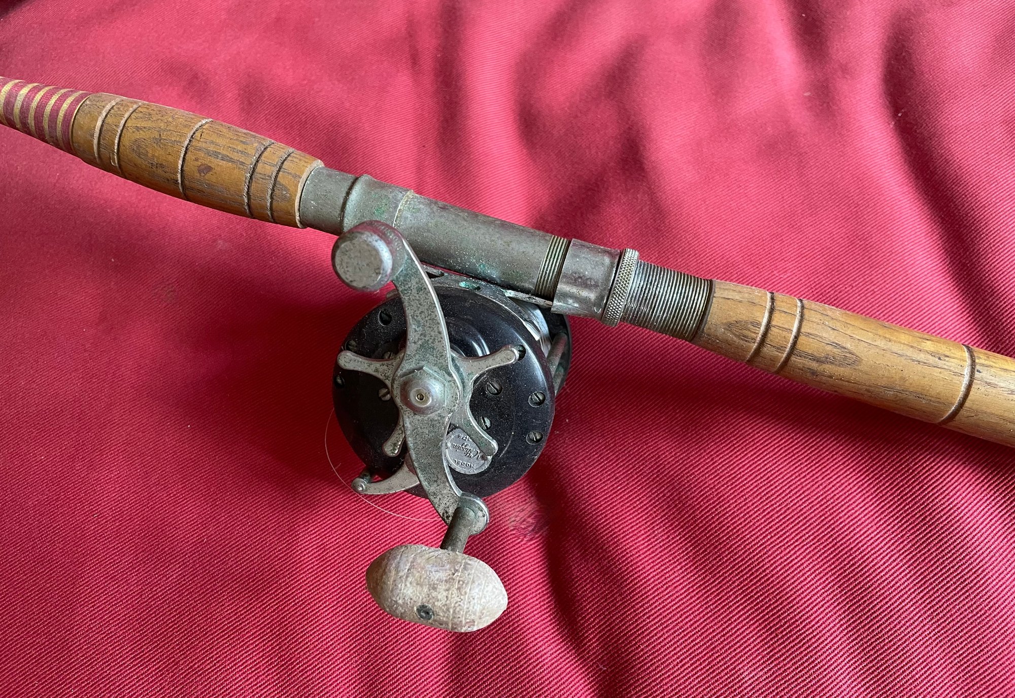 This is a very well made and well preserved rod & reel by J. C. Higgins. It has a lot of detail like a solid rubber end cap, a turned wood handle, decorative binding and so on. The rod is 71" long and is in very good overall condition - it could use a little cleaning.