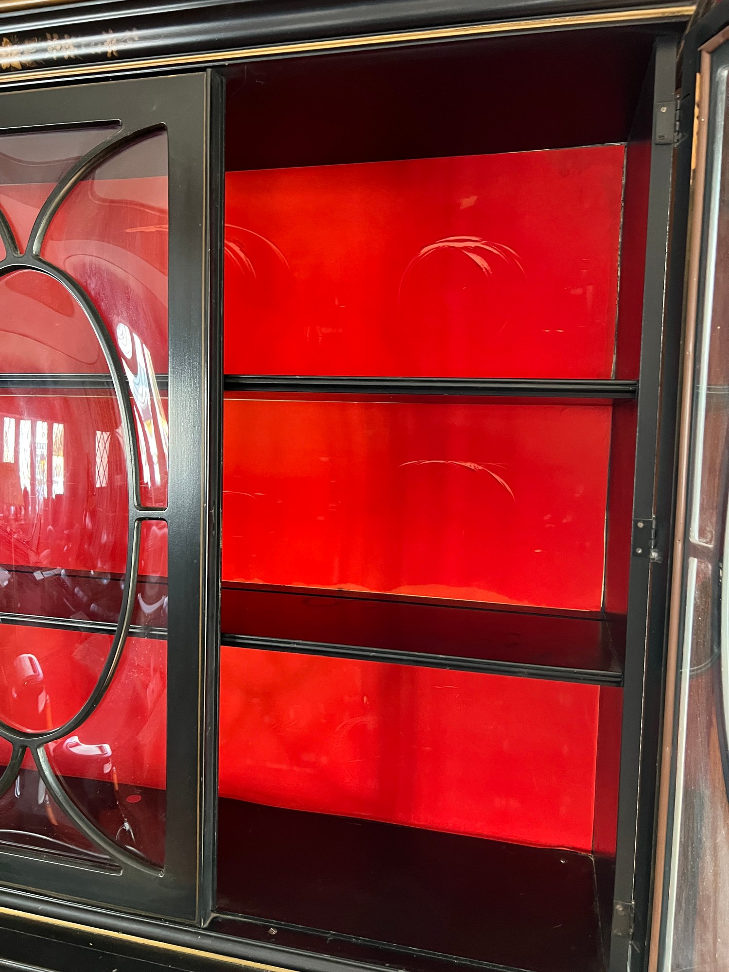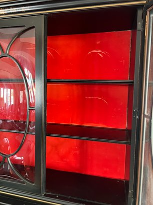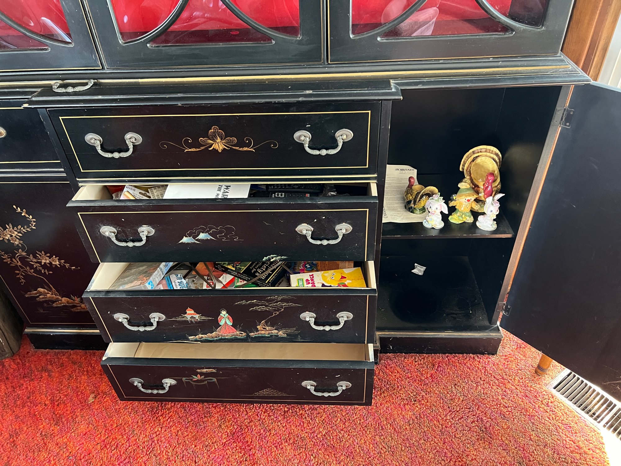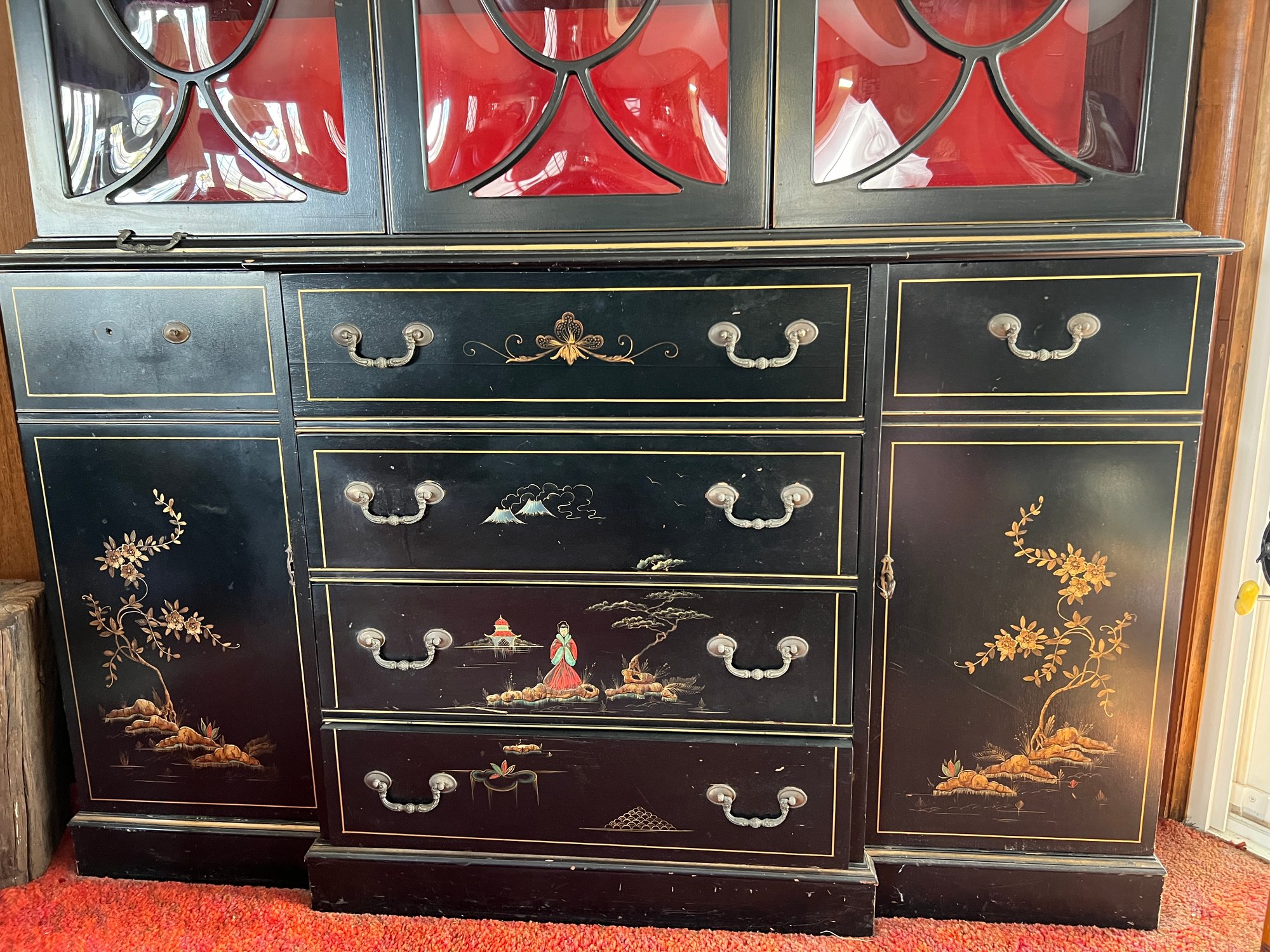 Fabulous vintage 1960s chinoiserie style black lacquer display cabinet with red felt texture lining on the upper cabinet back and hand-painted Asian inspired designs on the lower two cabinets and four drawers.
