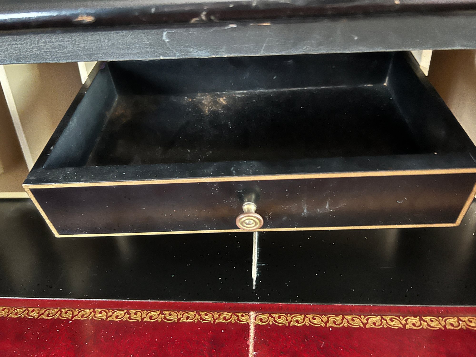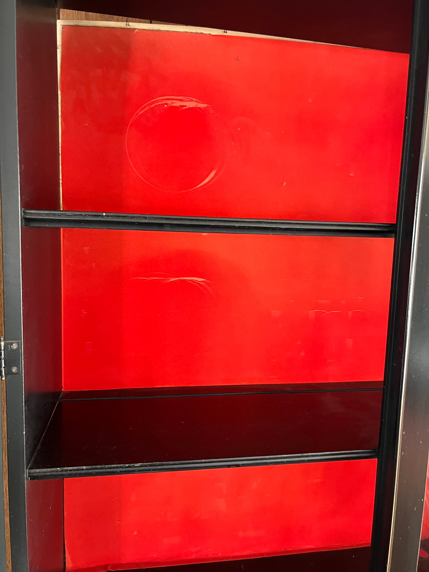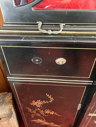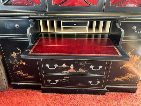 Fabulous vintage 1960s chinoiserie style black lacquer display cabinet with red felt texture lining on the upper cabinet back and hand-painted Asian inspired designs on the lower two cabinets and four drawers.