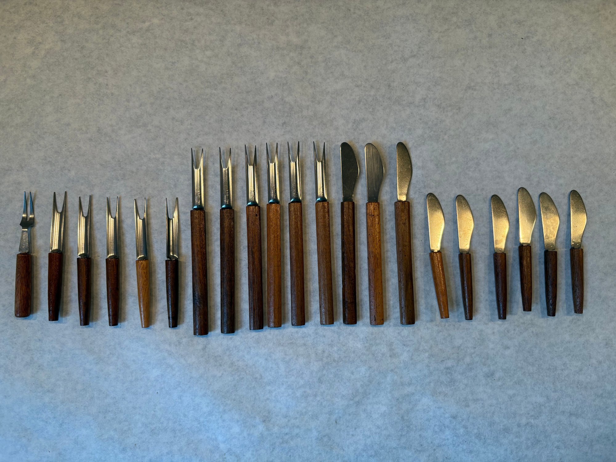 1960s wood and stainless steel appetizer forks and spreaders.