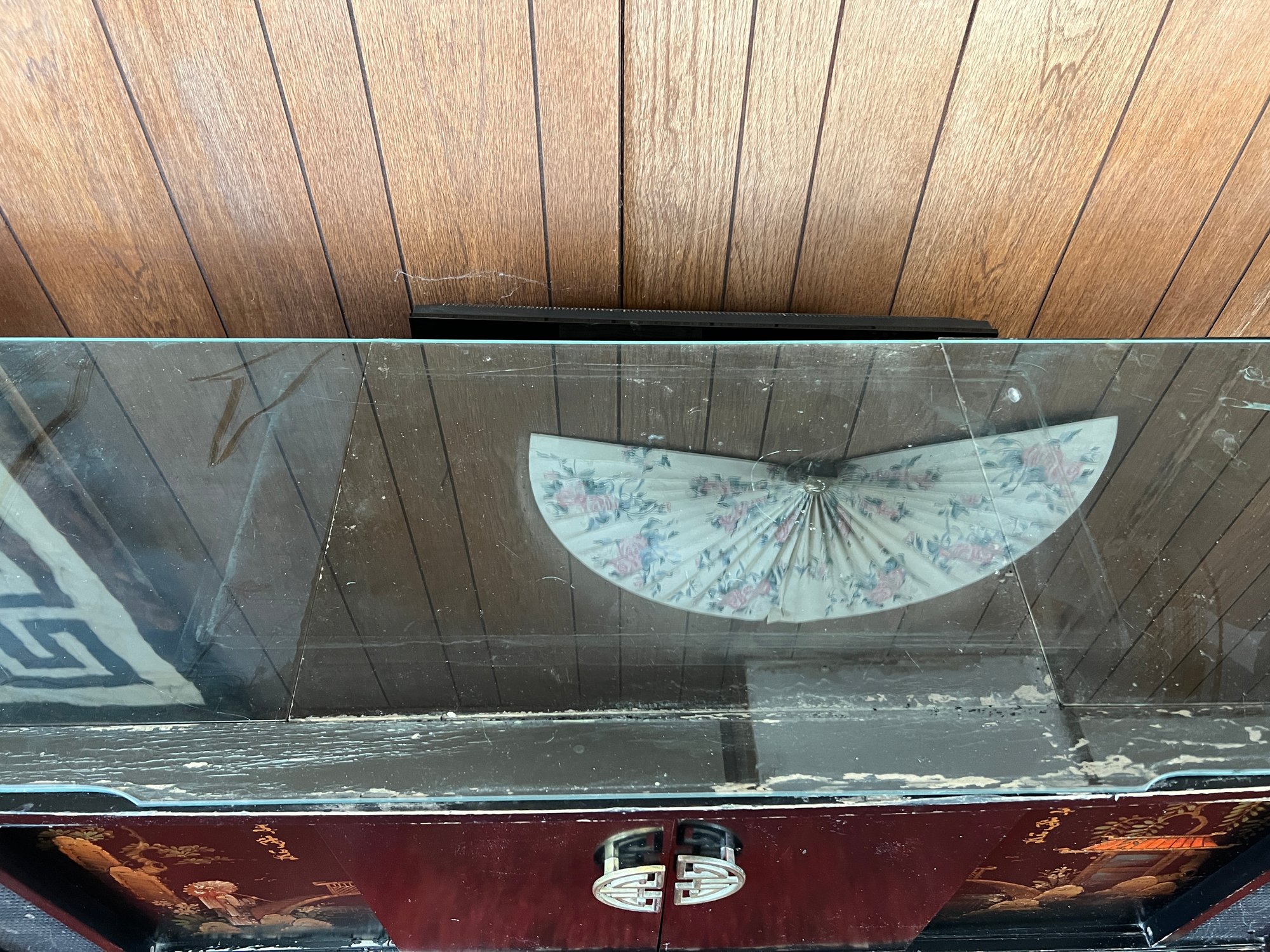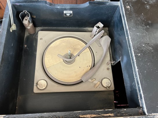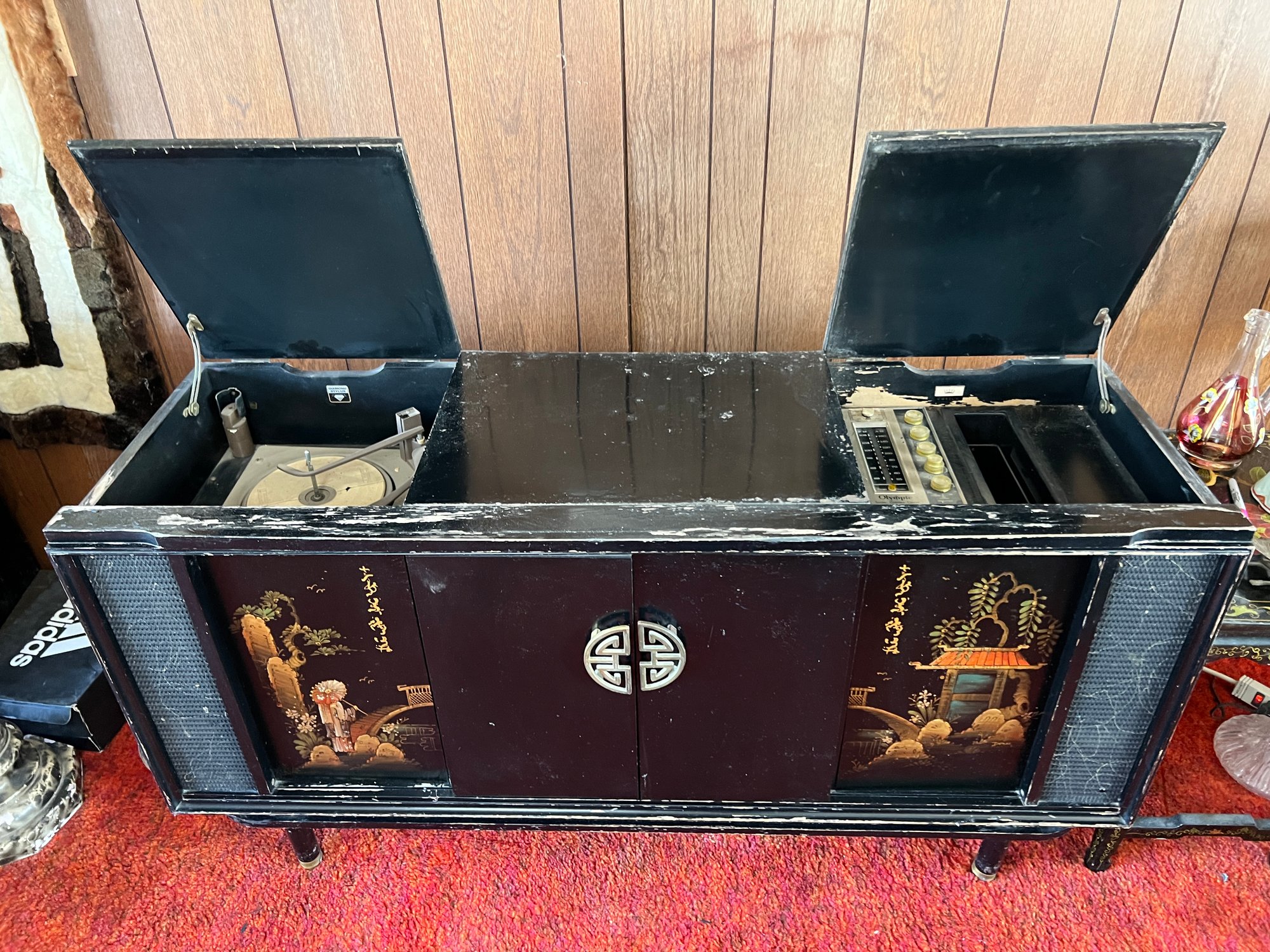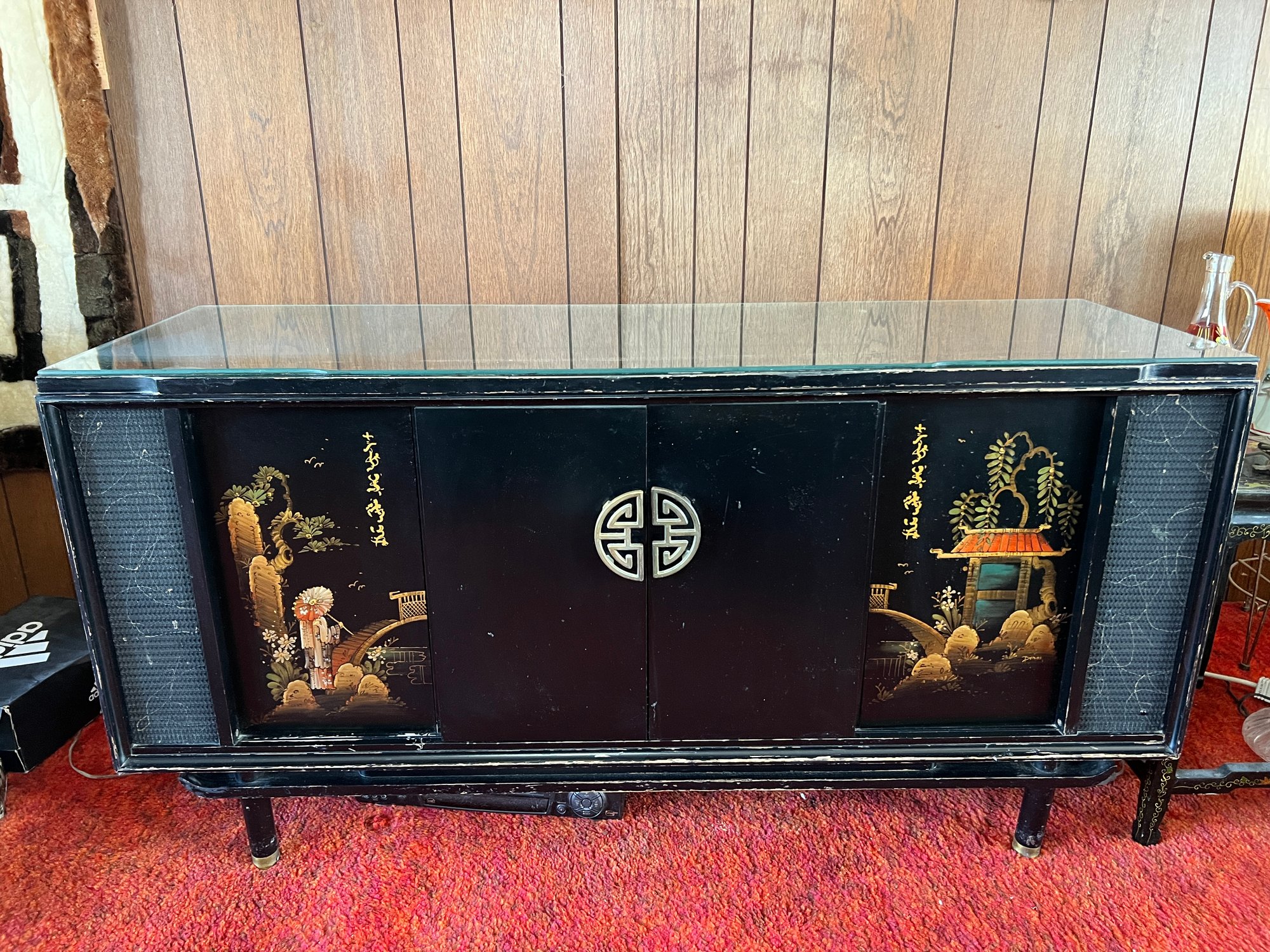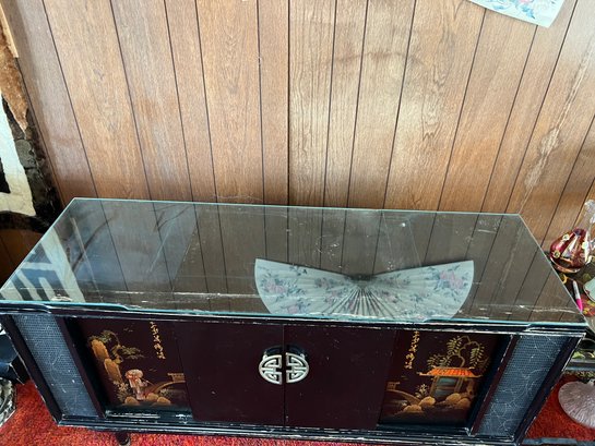 Original 1963 chinoiserie style stereo and television cabinet with Olympic brand turntable and audio equipment. Old tv has been removed and there is an empty cabinet in the middle. A custom glass top is also included.