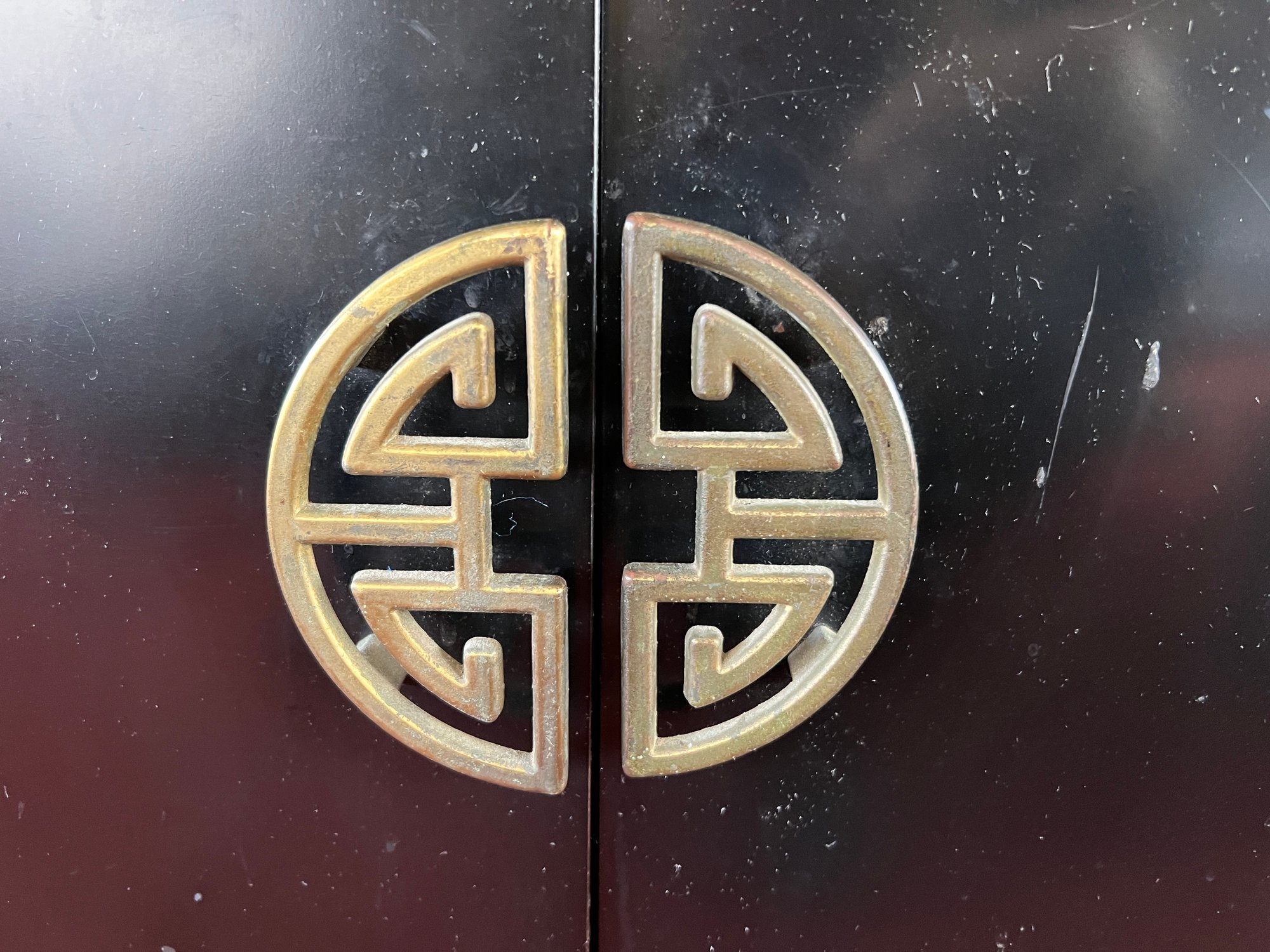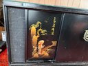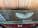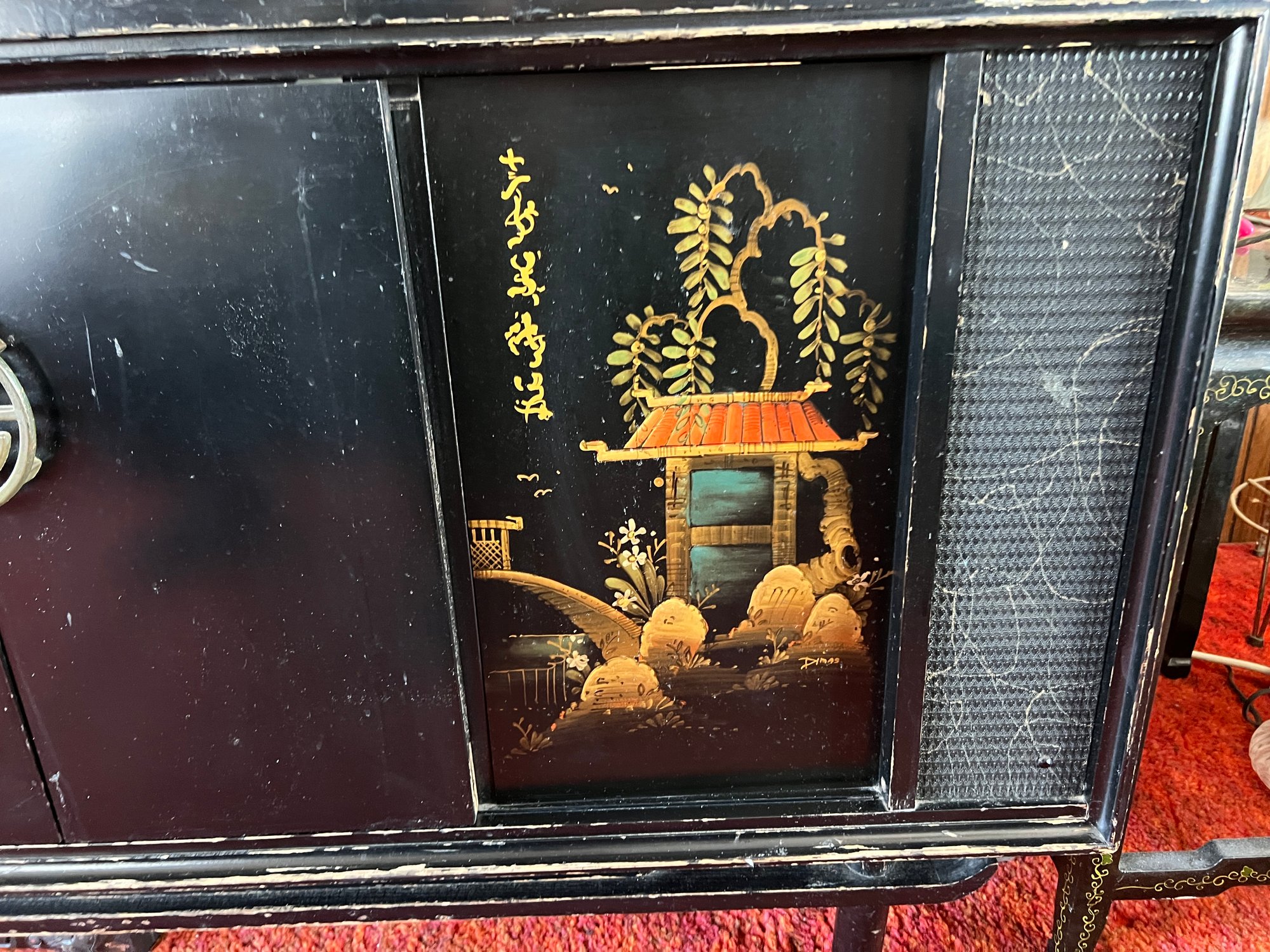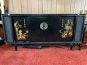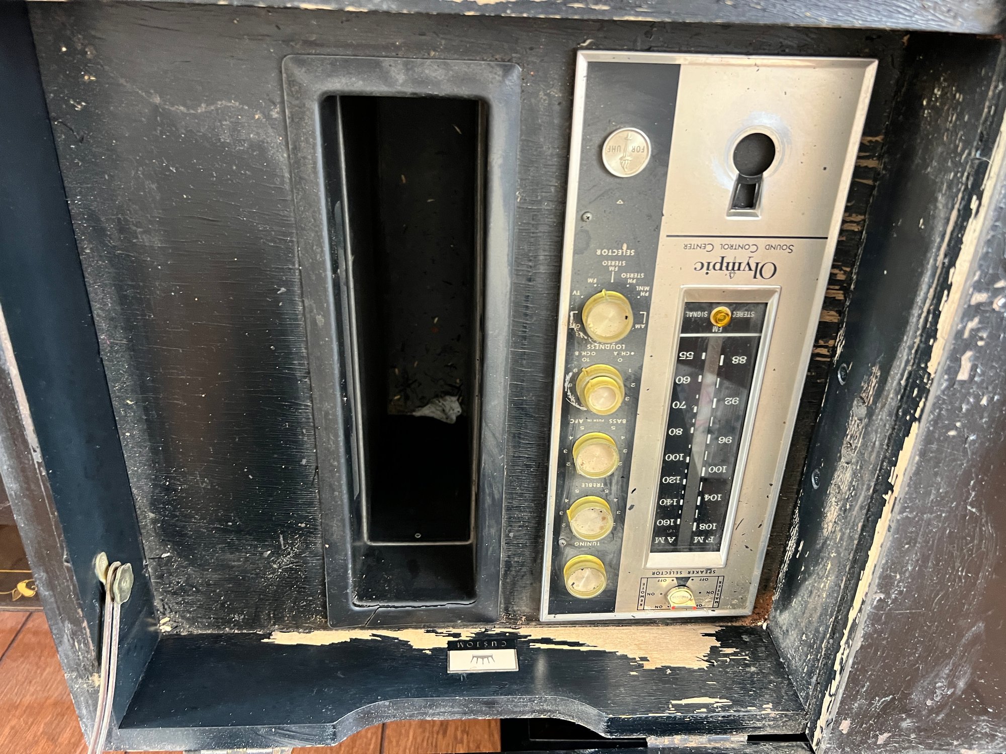 Original 1963 chinoiserie style stereo and television cabinet with Olympic brand turntable and audio equipment. Old tv has been removed and there is an empty cabinet in the middle. A custom glass top is also included.
