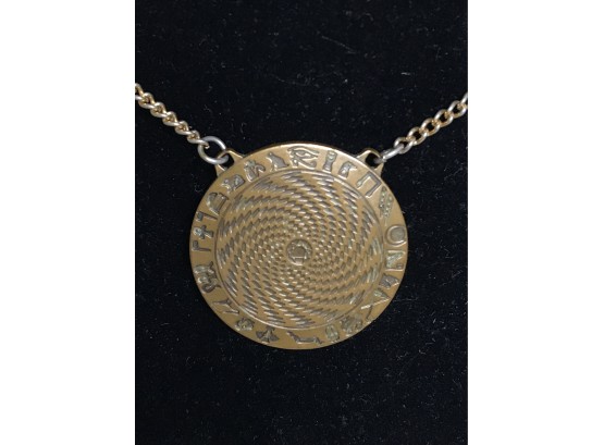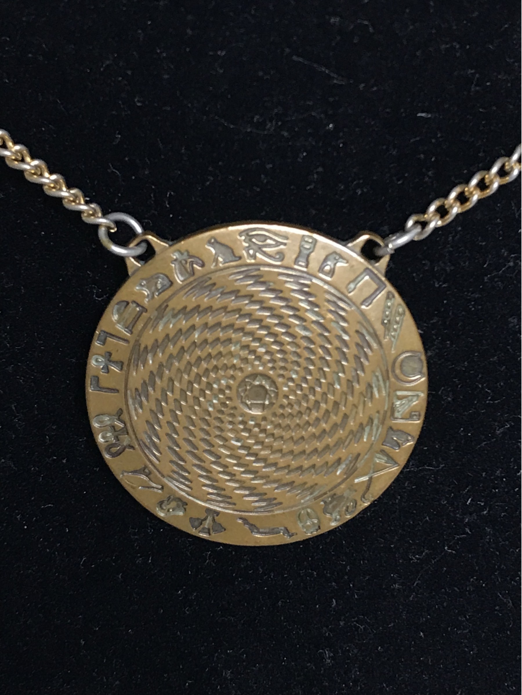 Pat Flanagan experimental sensor II medallion from 1976. The sensor is fashioned on a chain designed to be worn over the heart. The medallion its self is 1.5 inches with 23 Hieroglyphics on the front outer ring. On the back outer ring it reads "1976 PAT FLANAGAN experimental SENSOR II USA" with its Registered Number 67202. "This powerful toroidal design was used by Dr. Patrick Flanagan in the 1970's and 1980's in the creations of his experimental Sensor Discs. The Sensor was developed by scientifically measuring the cosmic energy which is continually broadcast from the capstone of a properly designed and magnetically aligned pyramid (based on the sacred geometry and physical measurements of the Great Pyramid at Giza, Egypt). The Sensor is a very powerful little device and can effect any living organic material (including humans) in positive and beneficial ways. If one puts a sensor around the neck, the energy level of the carrier raises itself clearly. The sensor can concentrate as much energy as a two meter high pyramid, and works as resonator for life.