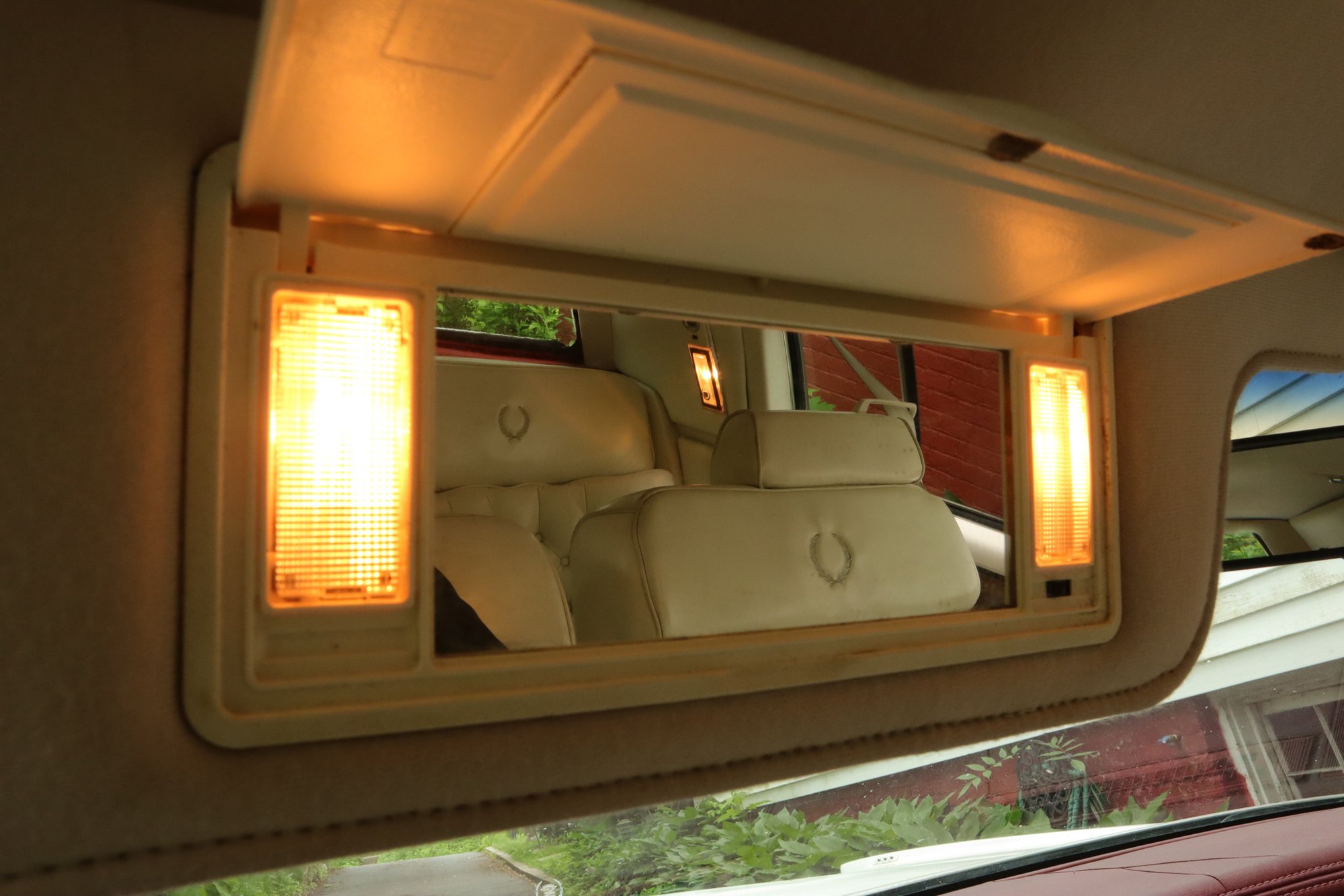 - Burgundy dashboard, steering wheel, plush carpet, and Cadillac mats.