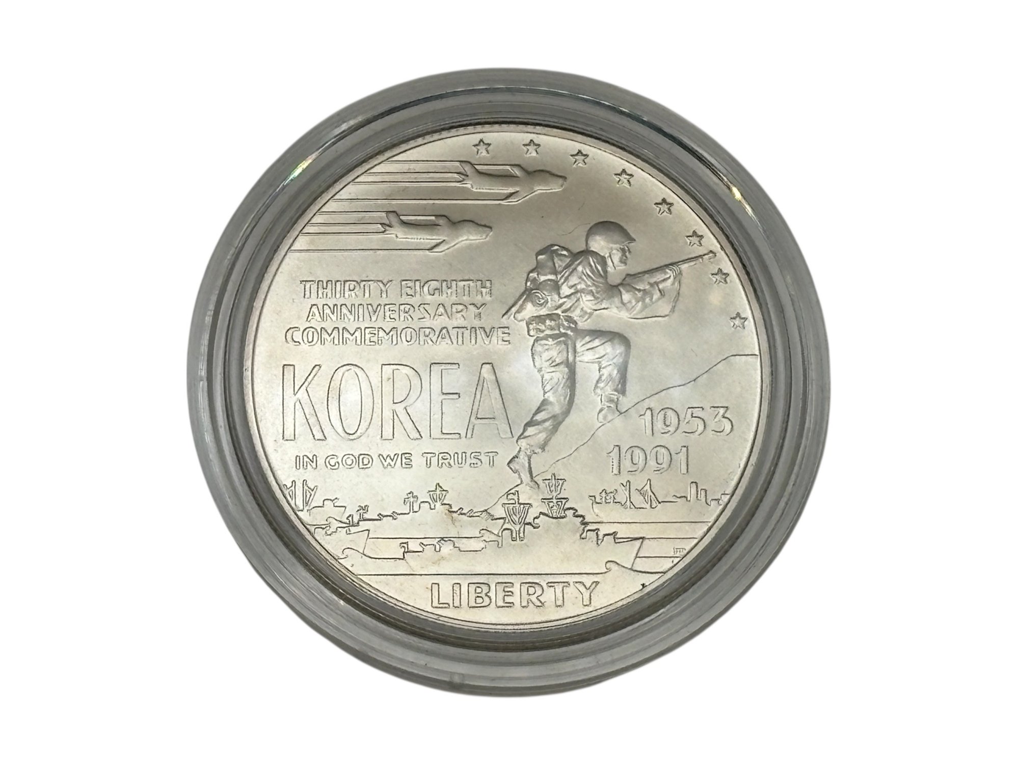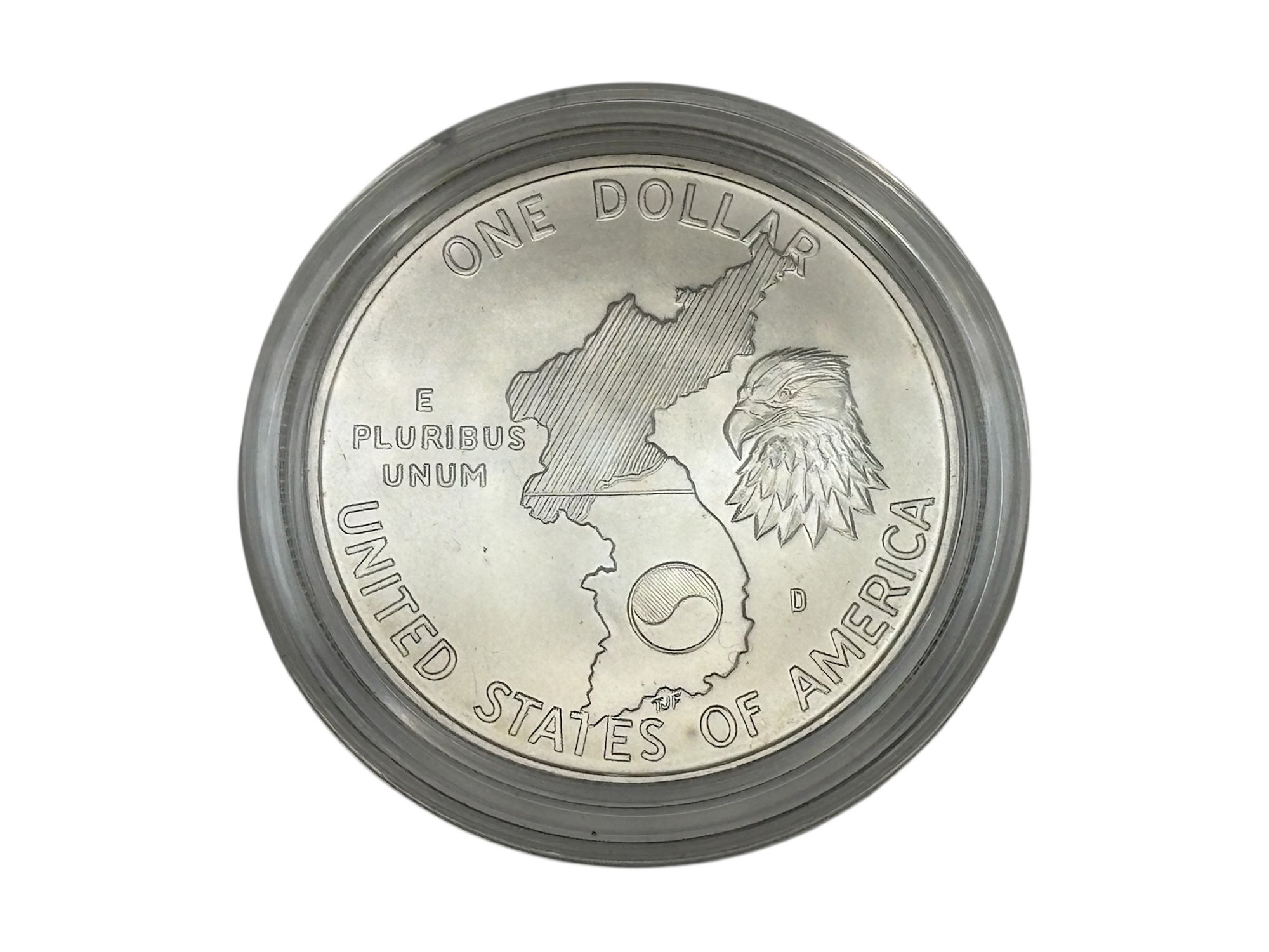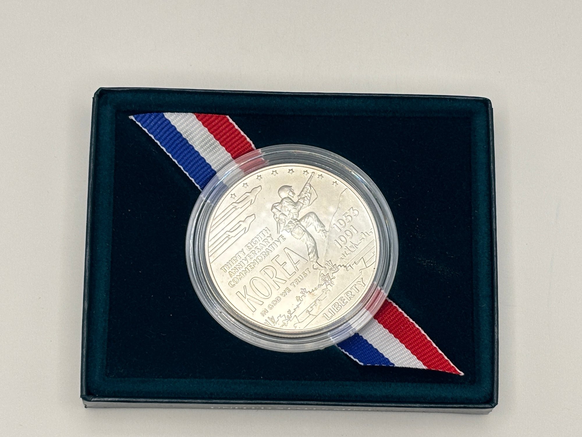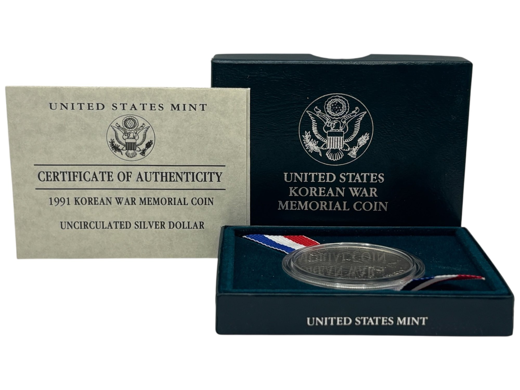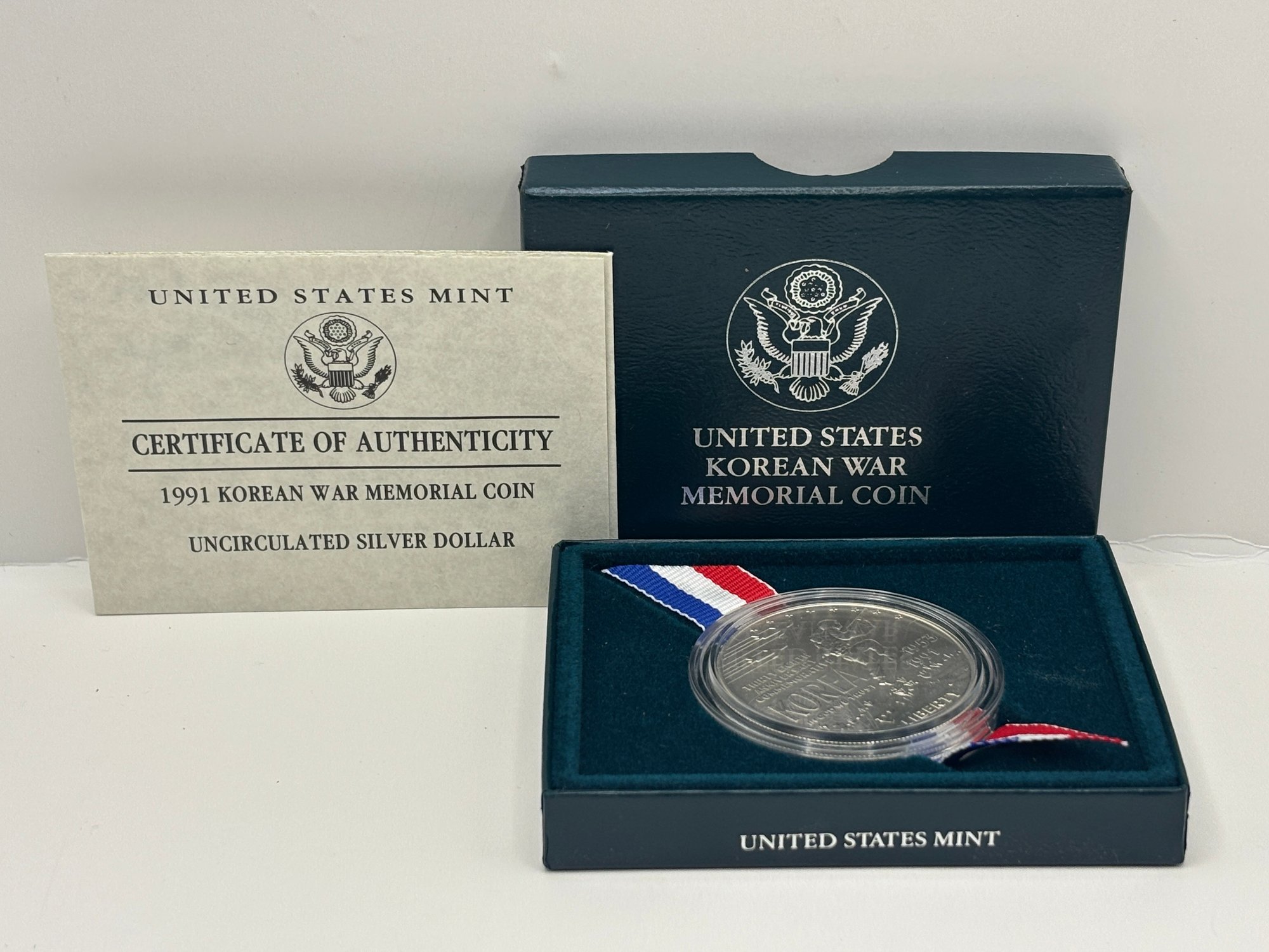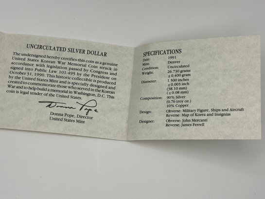 Issued by the United States Mint in 1991, this Korean War Memorial Uncirculated Silver Dollar commemorates the service and sacrifice of those who served in the Korean War and supported the creation of the memorial in Washington, D.C. The coin was authorized by Congress under Public Law 101-495 and signed into law on October 31, 1990.
