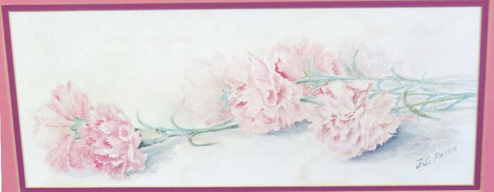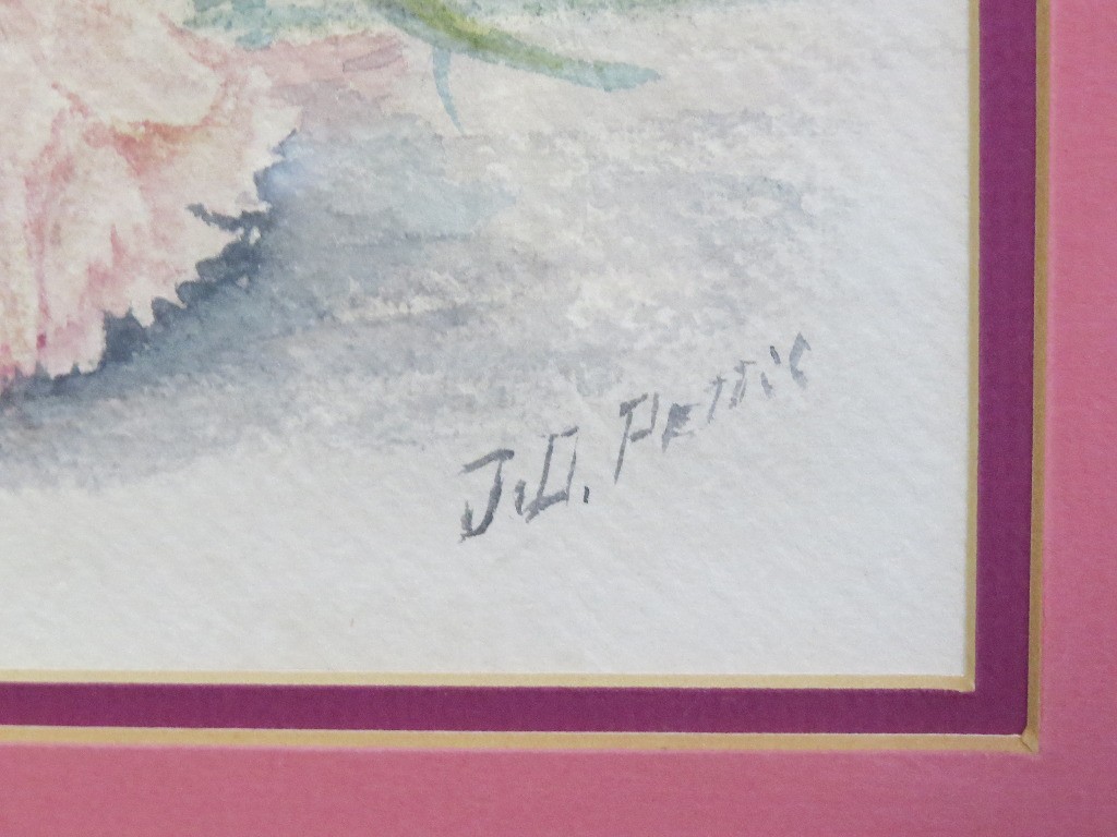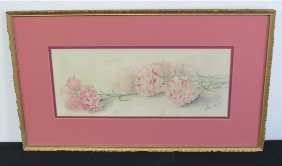 A watercolor of a group of carnations matted and framed in pink, late 19th / early 20th C. signed J.D. Pettic? Measures 23" x 13.5" in size framed. Some loss to gesso edging