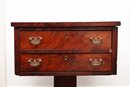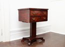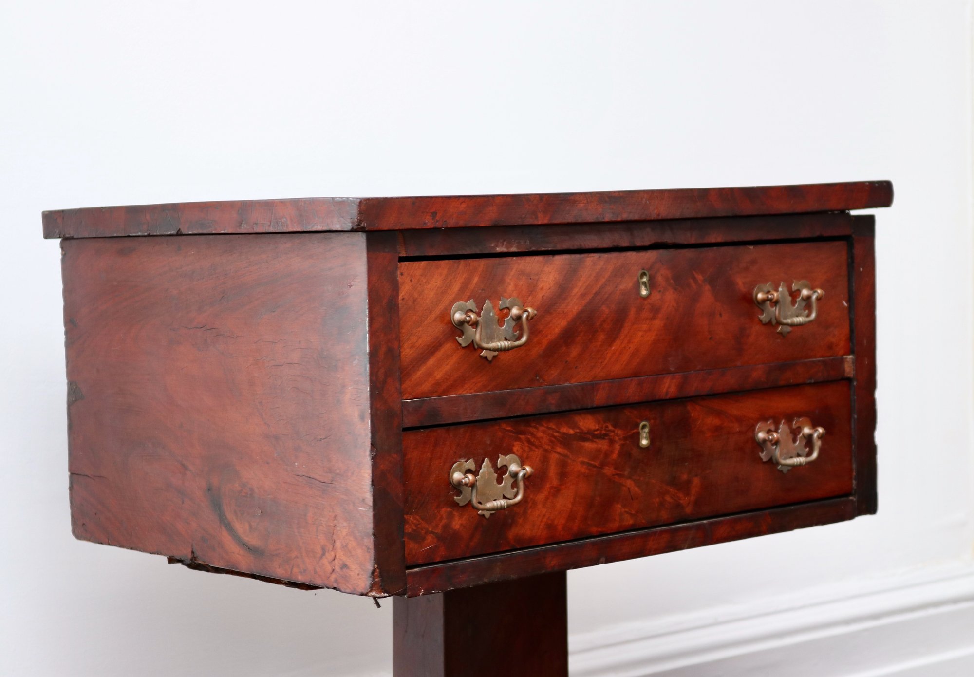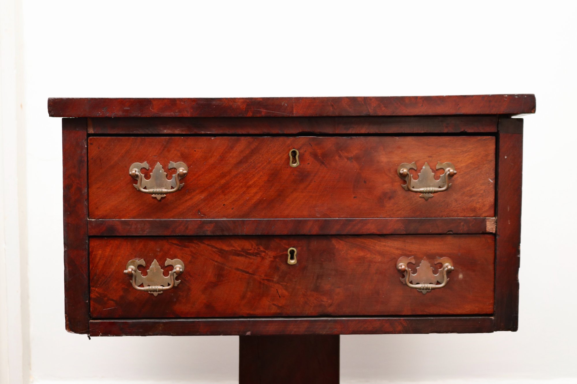 Charming compact two-drawer stand in richly figured mahogany veneer, raised on a central pedestal support with a shaped four-foot base. The rectangular case houses two aligned drawers with brass bail pulls and central key escutcheons, displaying lively flame and crotch mahogany grain across the fronts and top. The form blends Federal and early Empire influences, with clean rectilinear lines above a bold pedestal and scrolled feet. Ideal as a bedside table, lamp stand, or accent chest.