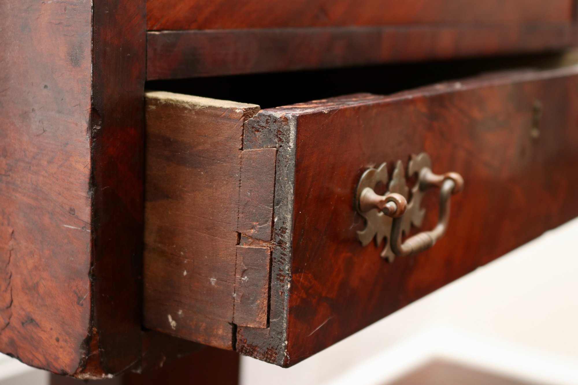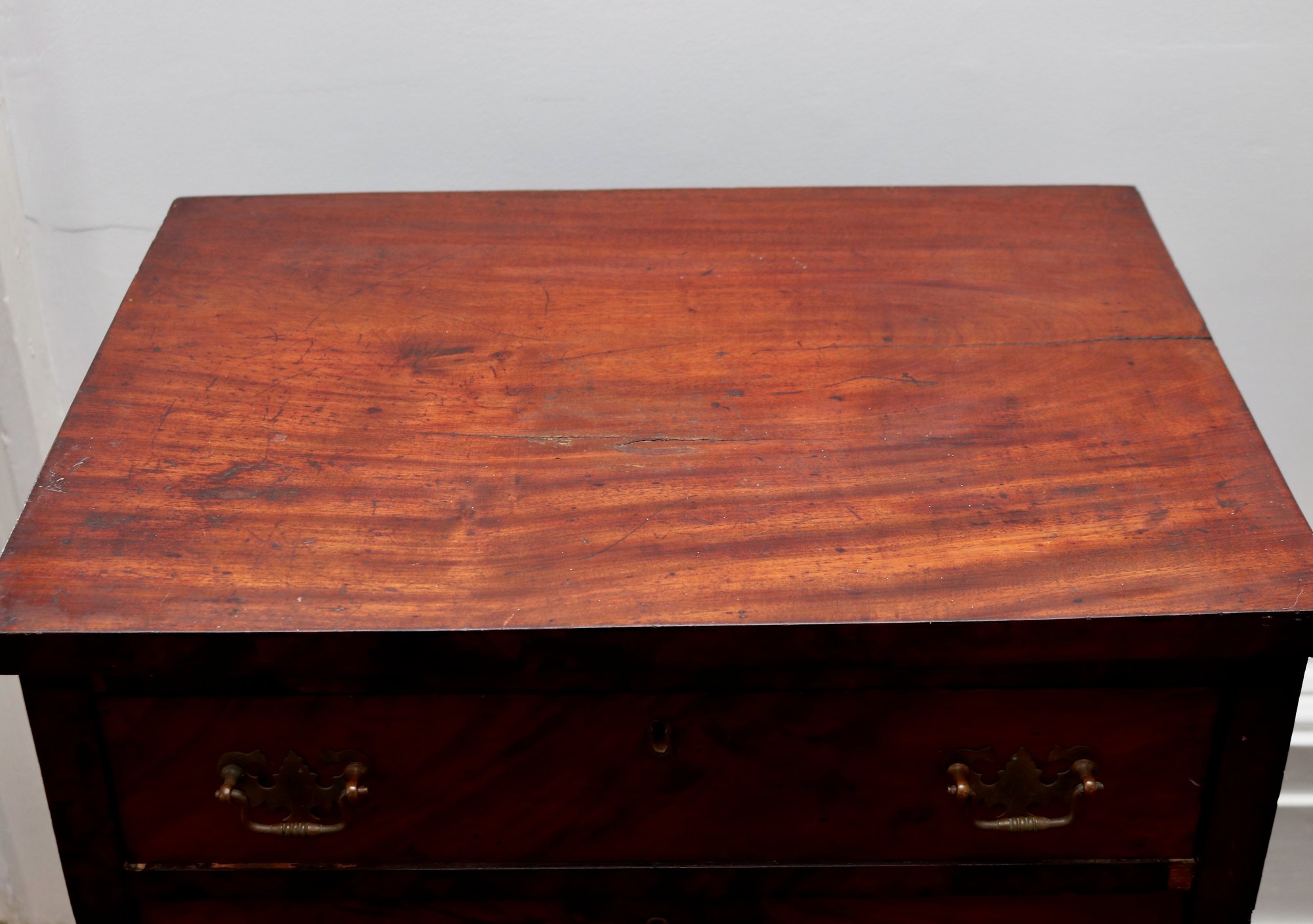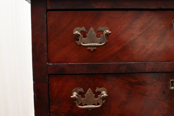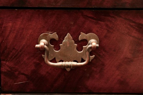 Condition: Good vintage condition with expected wear from age and use. Minor veneer chips and edge losses at corners, slight shrinkage line between drawer fronts, surface scuffs, and small base nicks. Hardware appears period-appropriate.