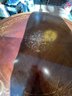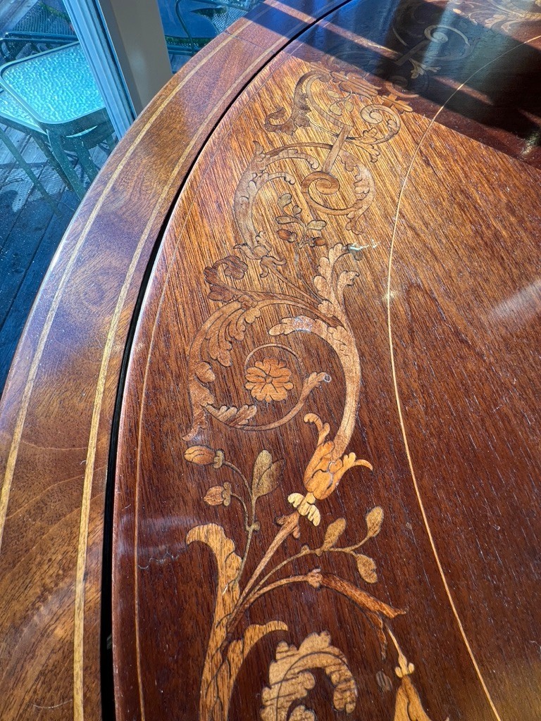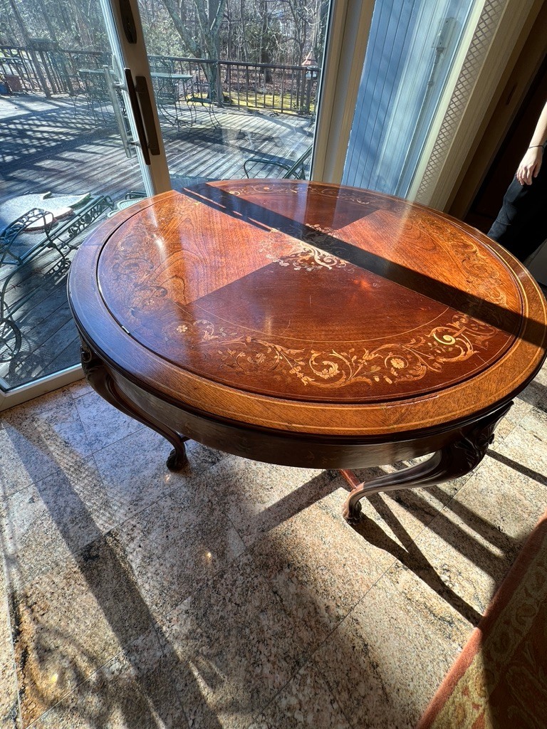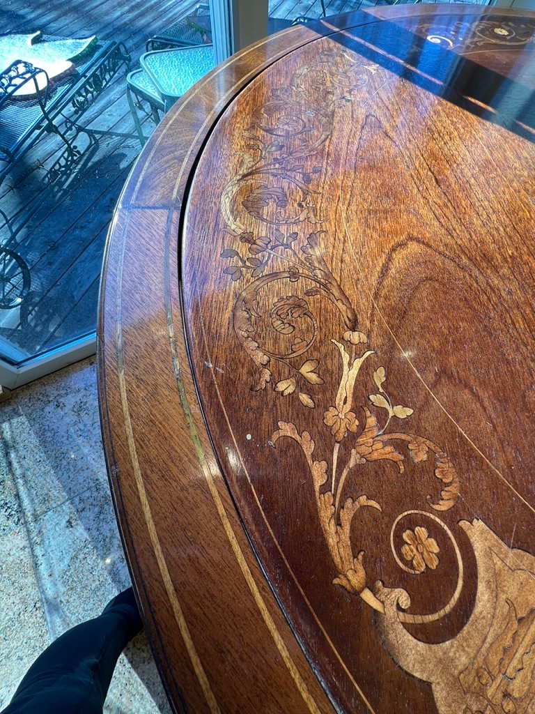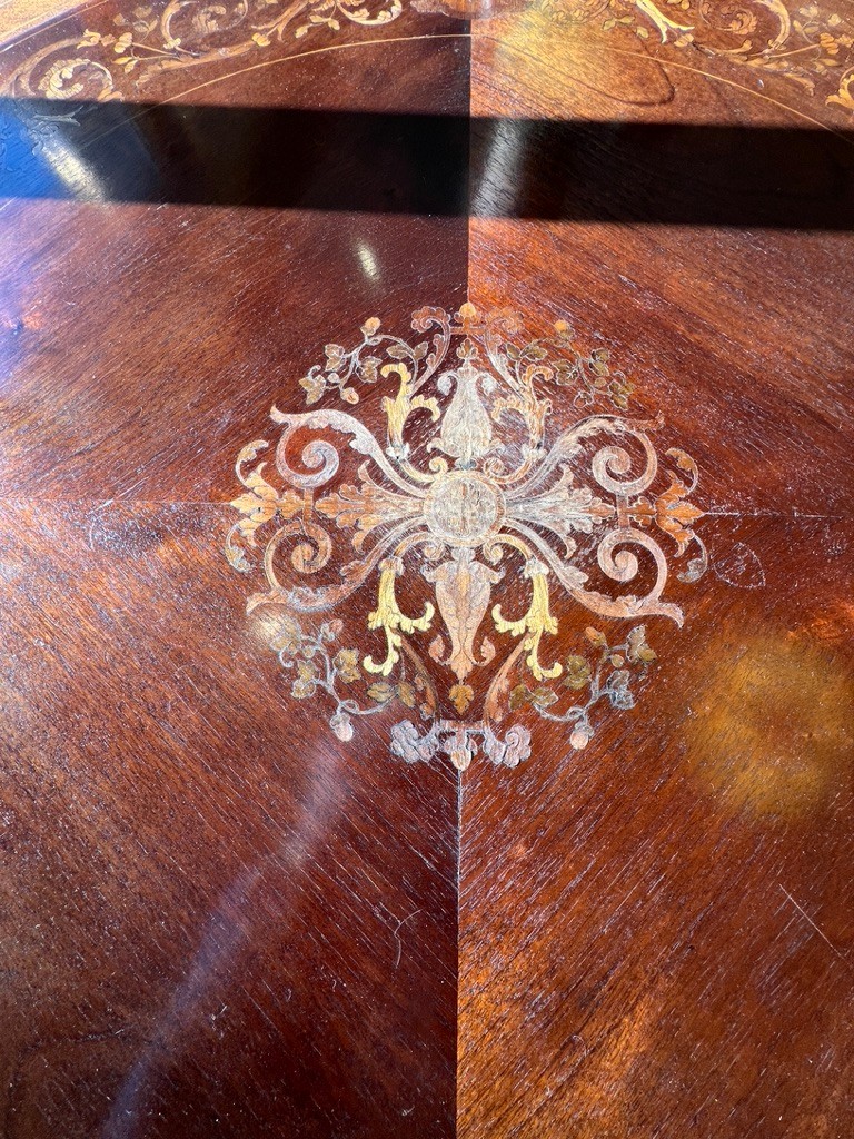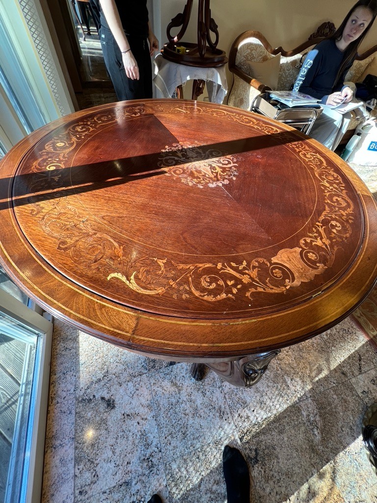 A round top with ornate, decorative inlays in the center and around the border.