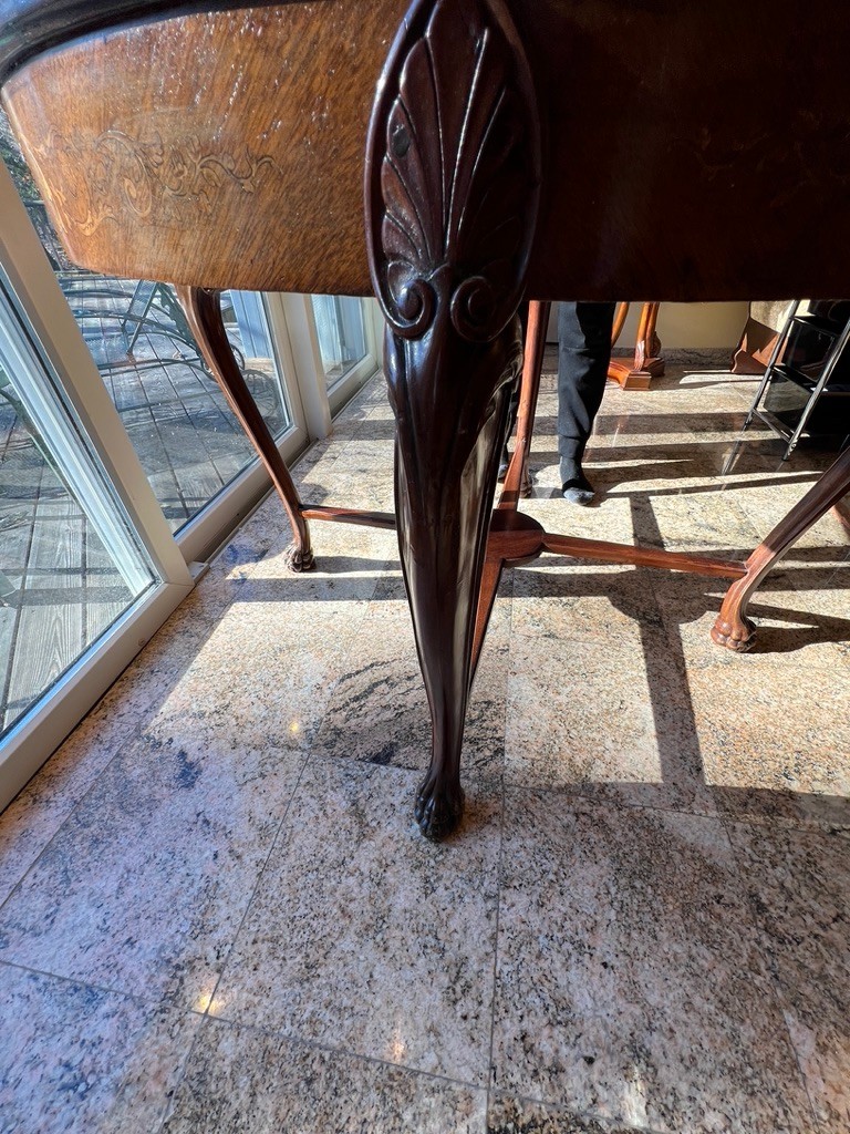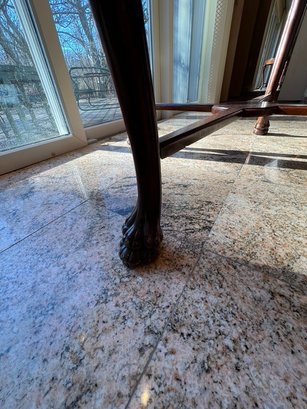 A carved pedestal base (partially visible). dining, center, or game table.