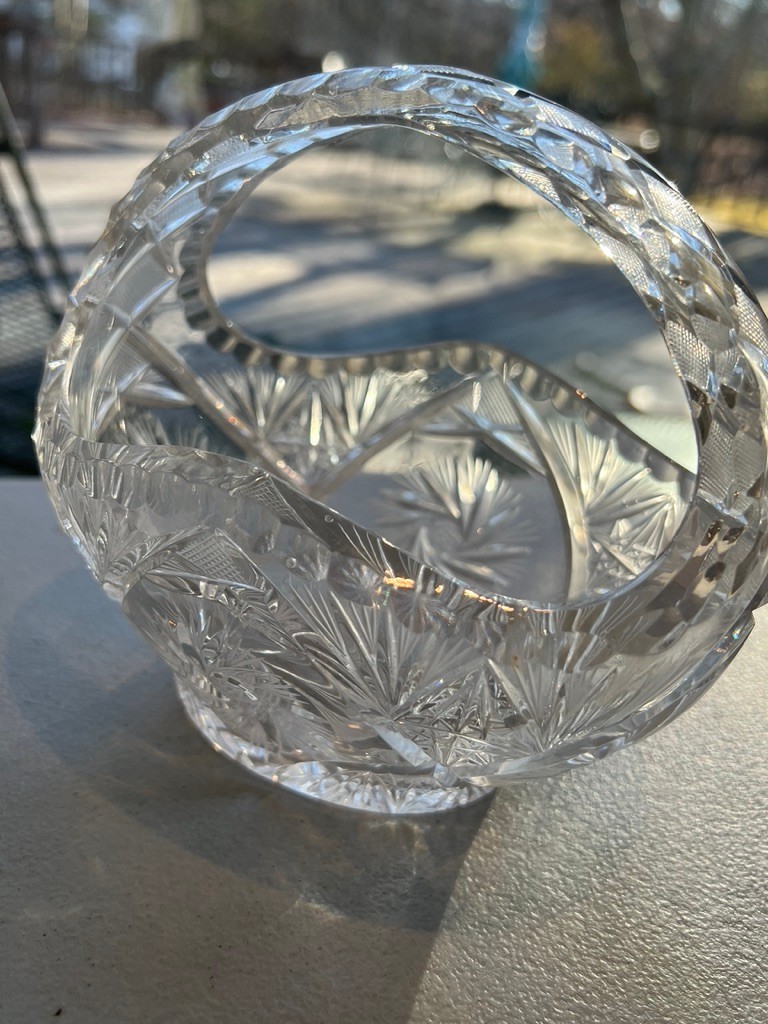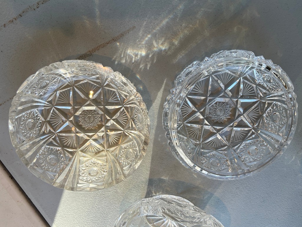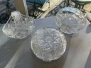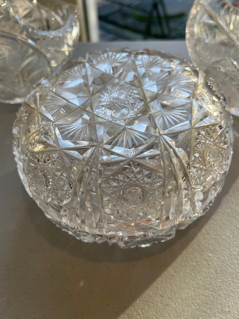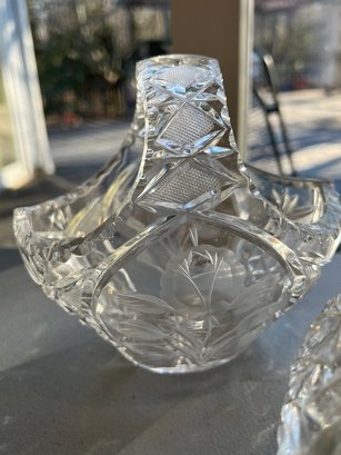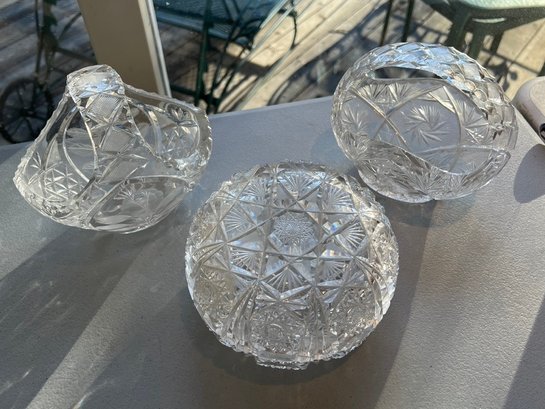 2 cut crystal baskets, 1 covered powder box, good condition, the powder jar does has niches on the rims
