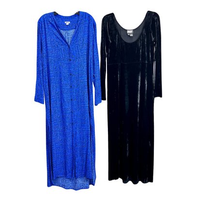 Vintage Donna Karan New York dresses. The blue patterned on is an XL, and the black velvet is a size L.