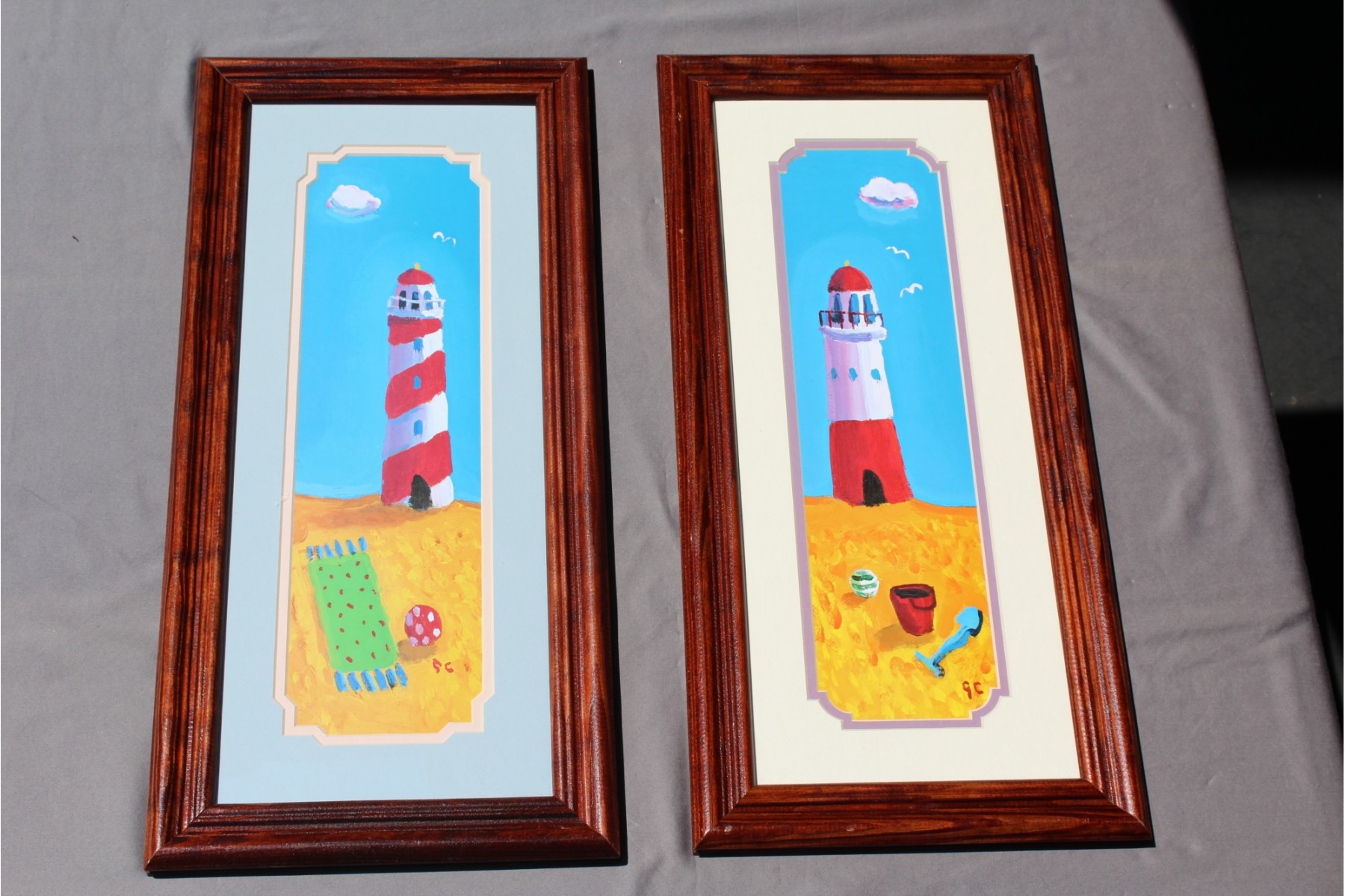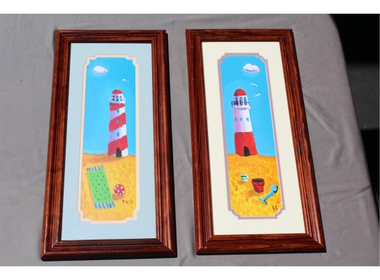 Gorgeous frames for these 2 pieces by Christopher Gilvan-Cartwright and the fun look of these lighthouses really brightens your kitchen or living room decor. The with the blanket is called "Lazy Days" and the one with the ball & pail is called "Sunny Sands" from 2001. Framed 22.5 x 10.5, visible 16.5 x 4.5". Looking closely at signature indicates that it is part of the print.