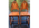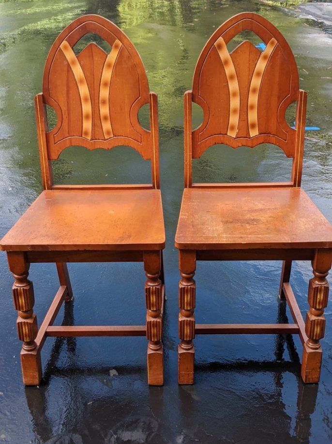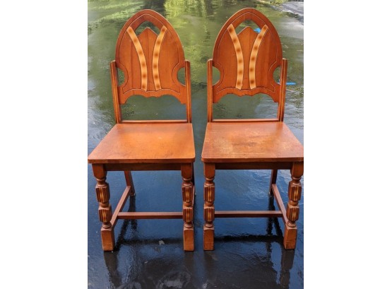 These vintage chairs are quite the eye-catching items, note the date 1940 and it is not inlaid wood but paint/stain that is found on the back, side trim and front legs. Cannot find anything similar on the web but so very unique. Excellent quality, wish I had more.