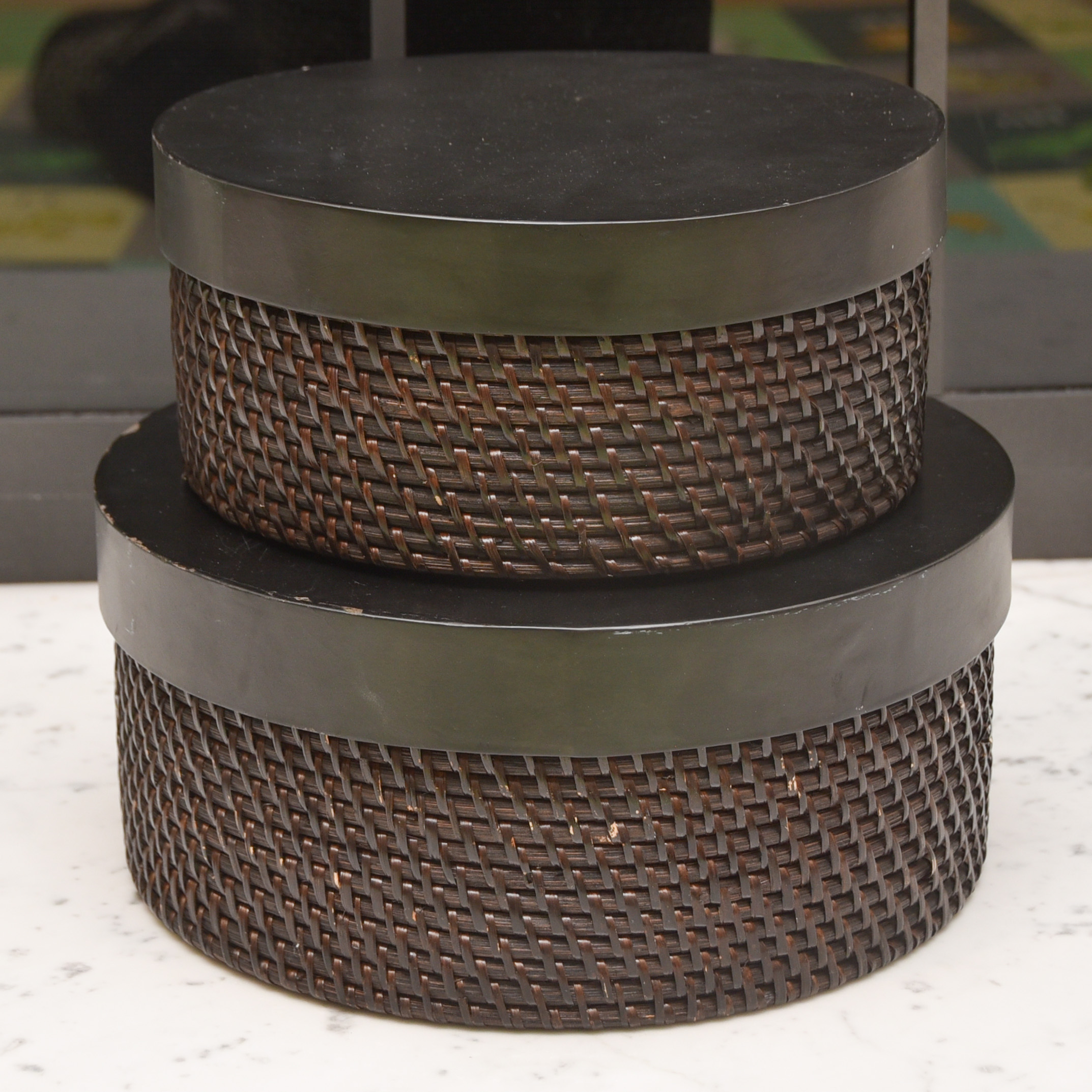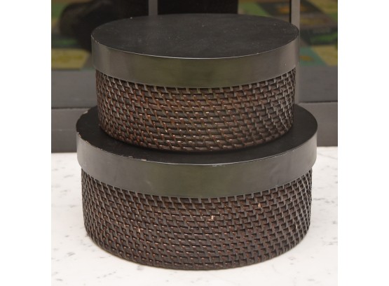 Bottoms are rattan, lids are wood. 12” and 10” dia.