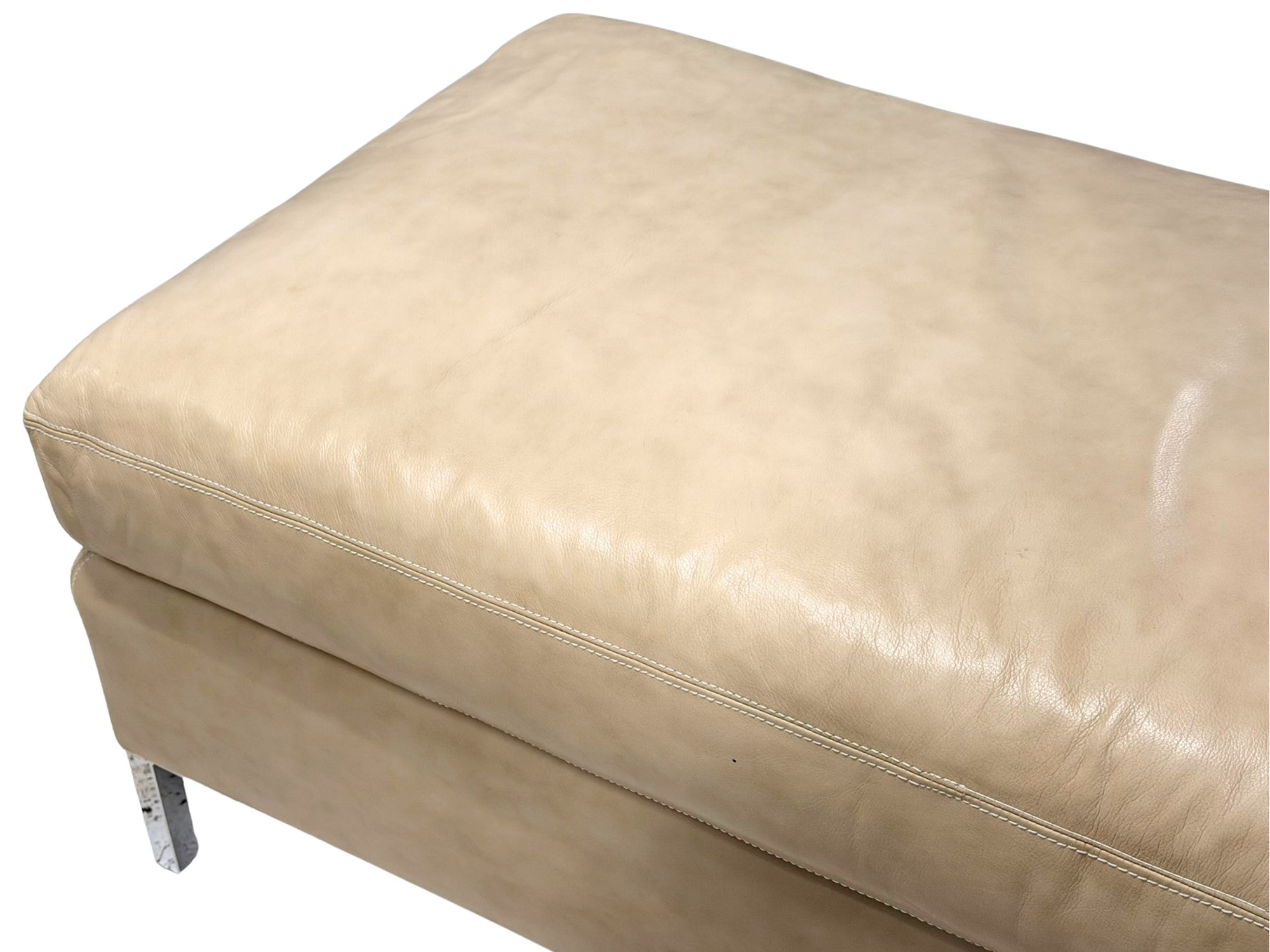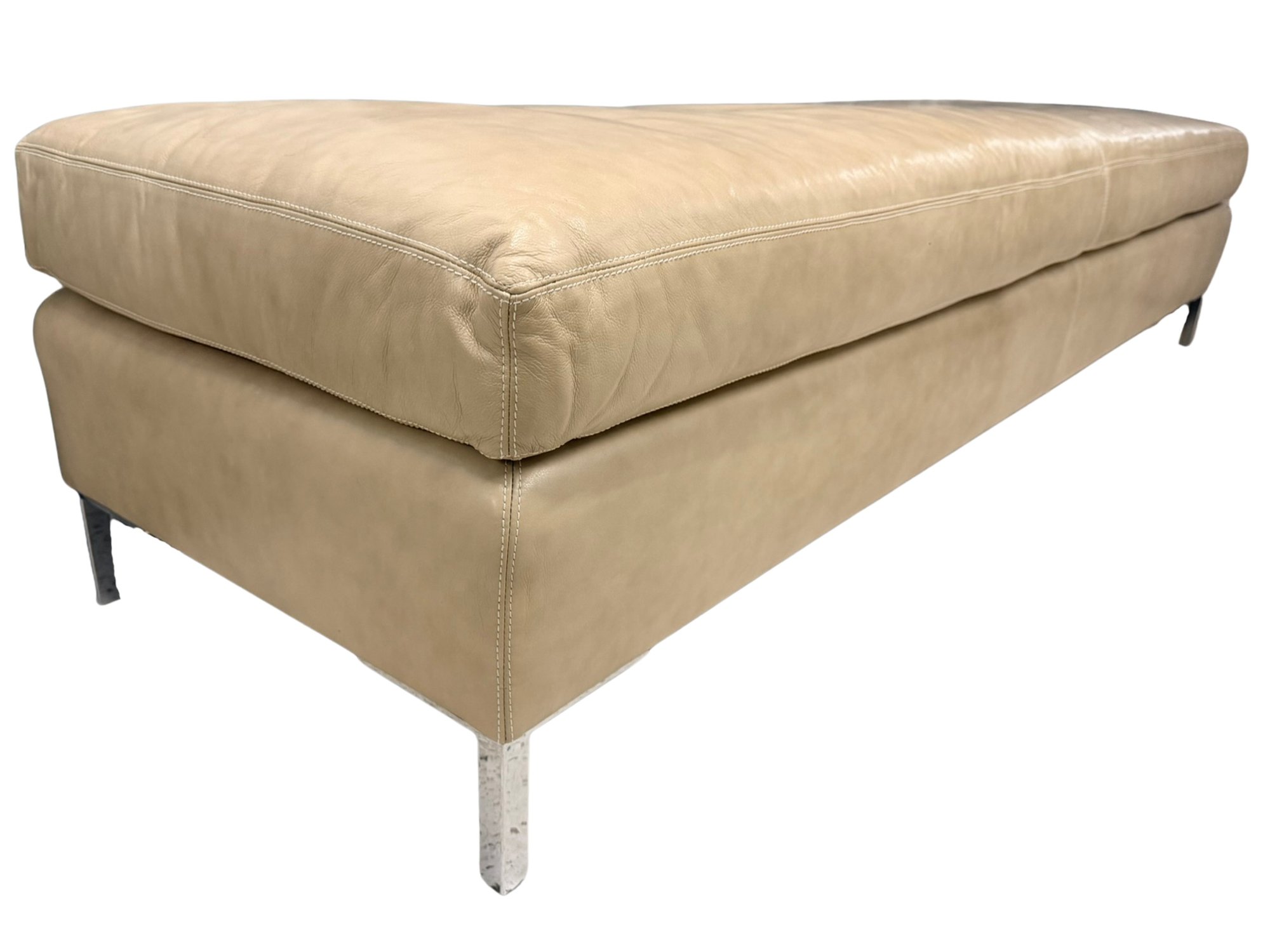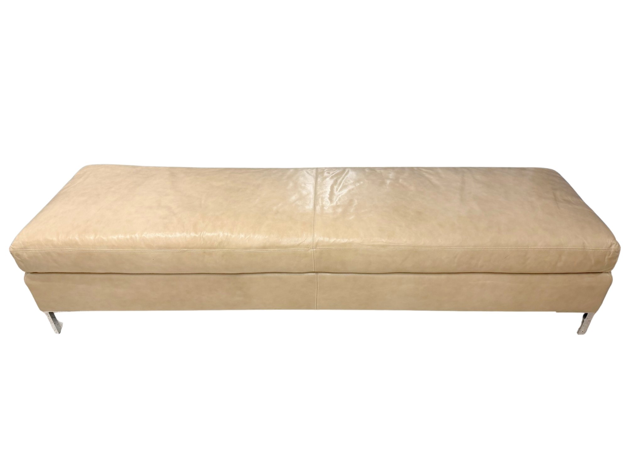 Contemporary long bench upholstered in soft beige leather, showcasing a streamlined, low-profile form with subtle natural wear that enhances its lived-in appeal. The elongated proportions make it a statement yet functional piece, while slim chrome legs provide a clean, modern contrast. This is 1 of 2 available in this auction.