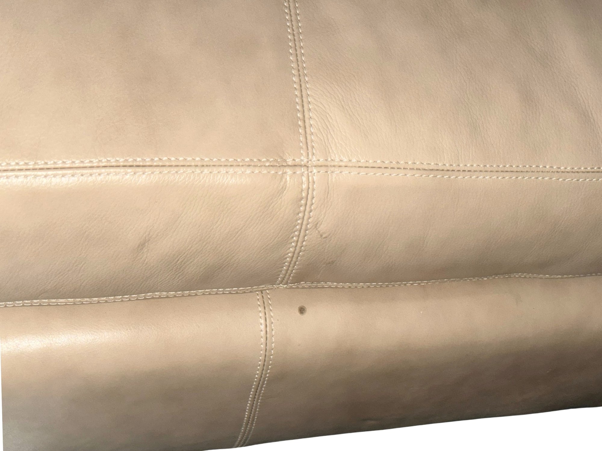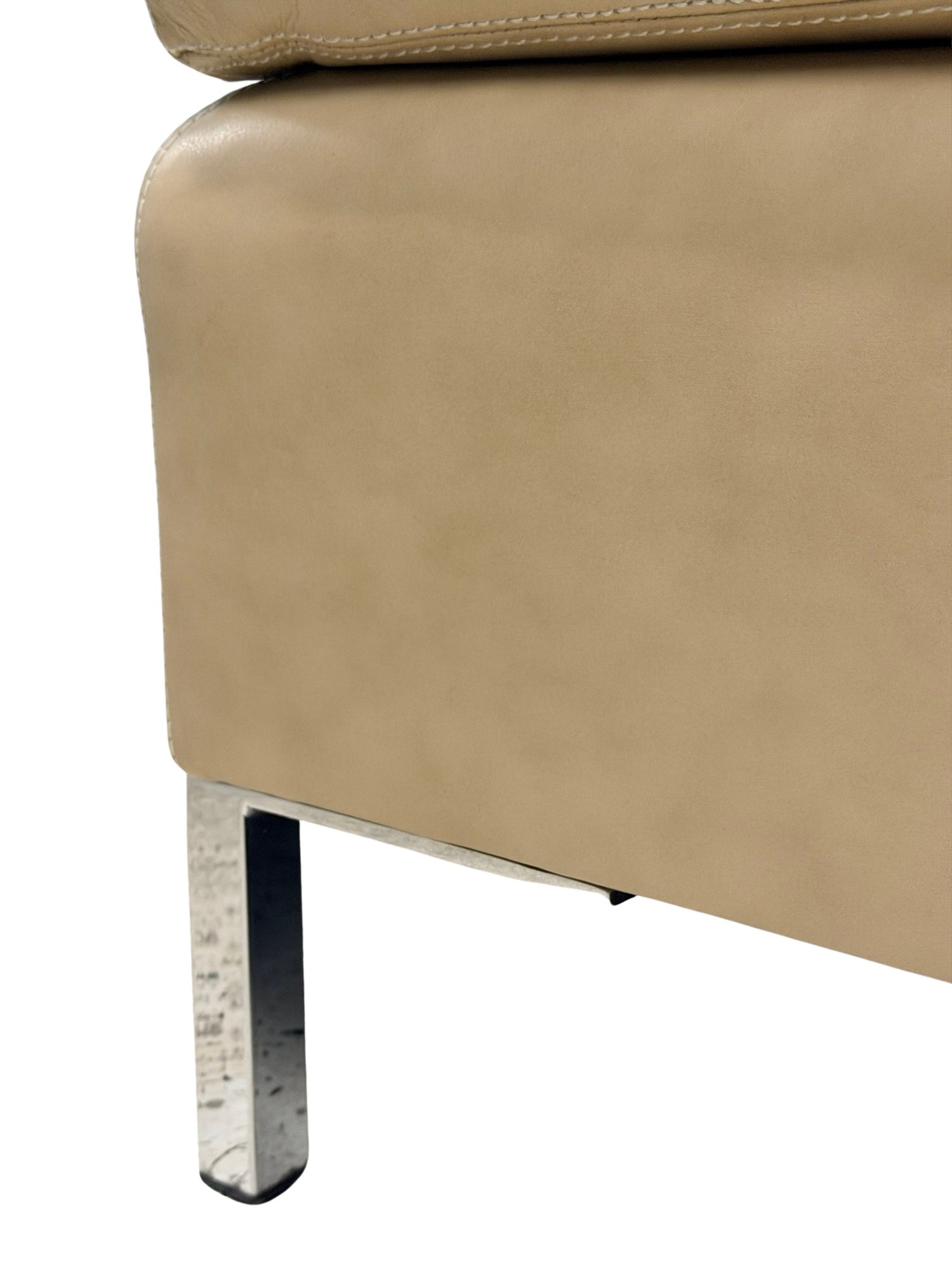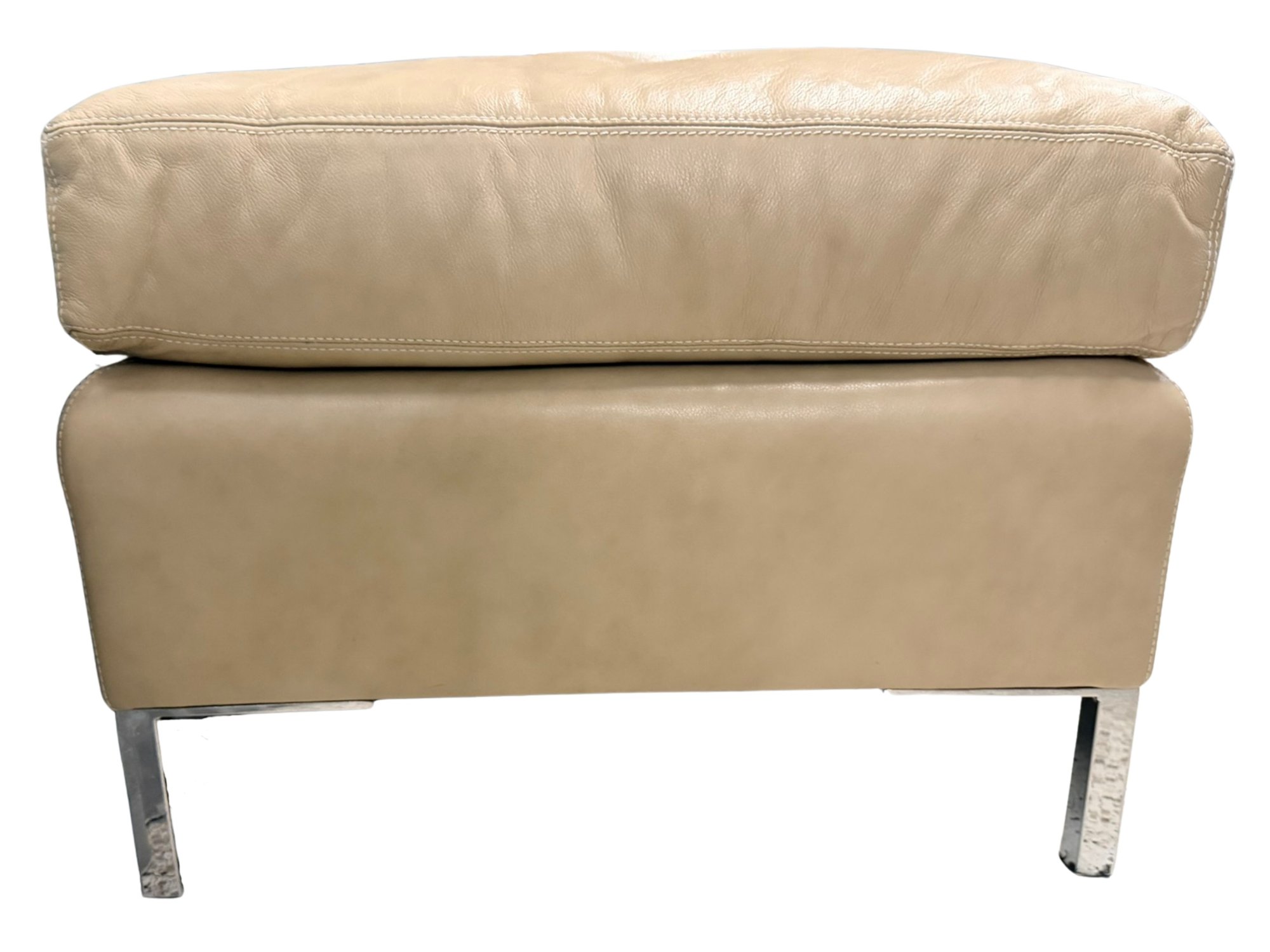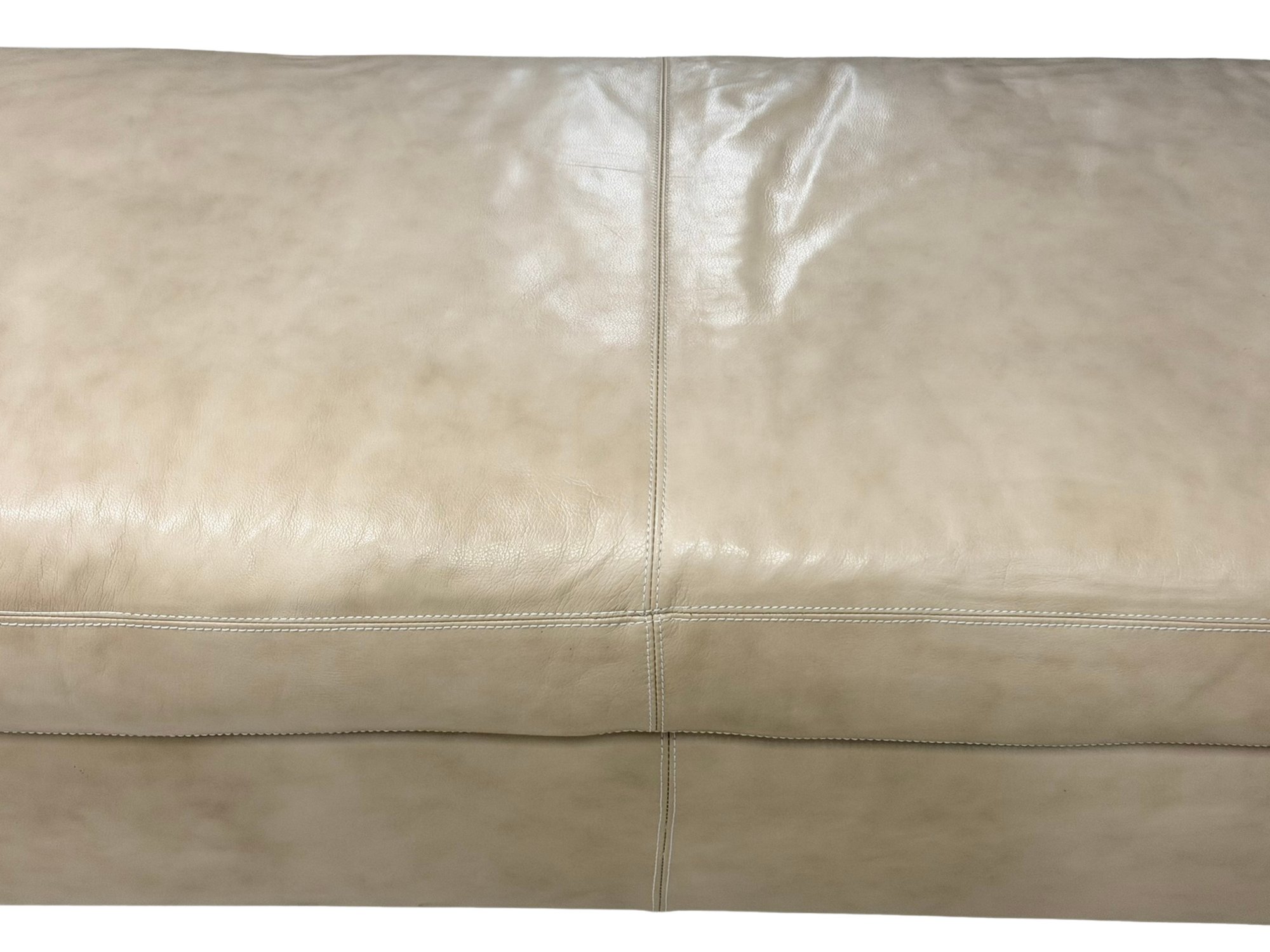 Contemporary long bench upholstered in soft beige leather, showcasing a streamlined, low-profile form with subtle natural wear that enhances its lived-in appeal. The elongated proportions make it a statement yet functional piece, while slim chrome legs provide a clean, modern contrast. This is 1 of 2 available in this auction.