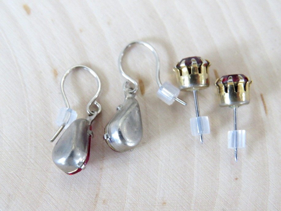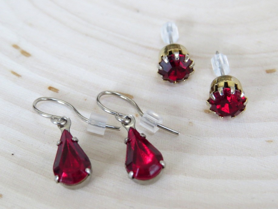 This lot features 2 pair of red rhinestone pierced earrings; a pair of red 3/8" teardrop rhinestone French wire dangle earrings set in a silver tone finish and a pair of red rhinestone 1/4" diameter round stud earrings in a gold tone finish.