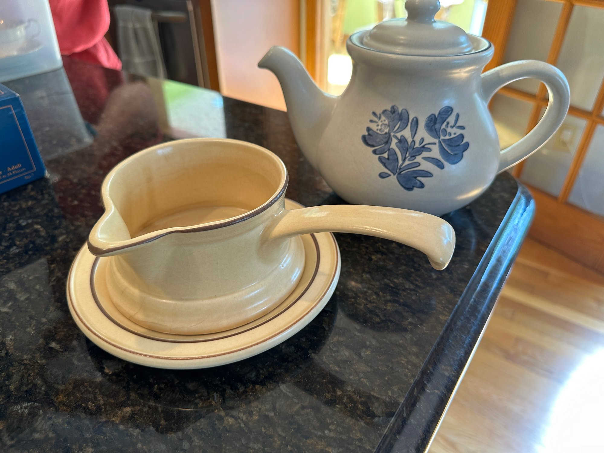 This Pfaltzgraff teapot is in the Yorktowne pattern, vintage and highly desirable.; Gravy boat with handle and underplate. Both in great condition
